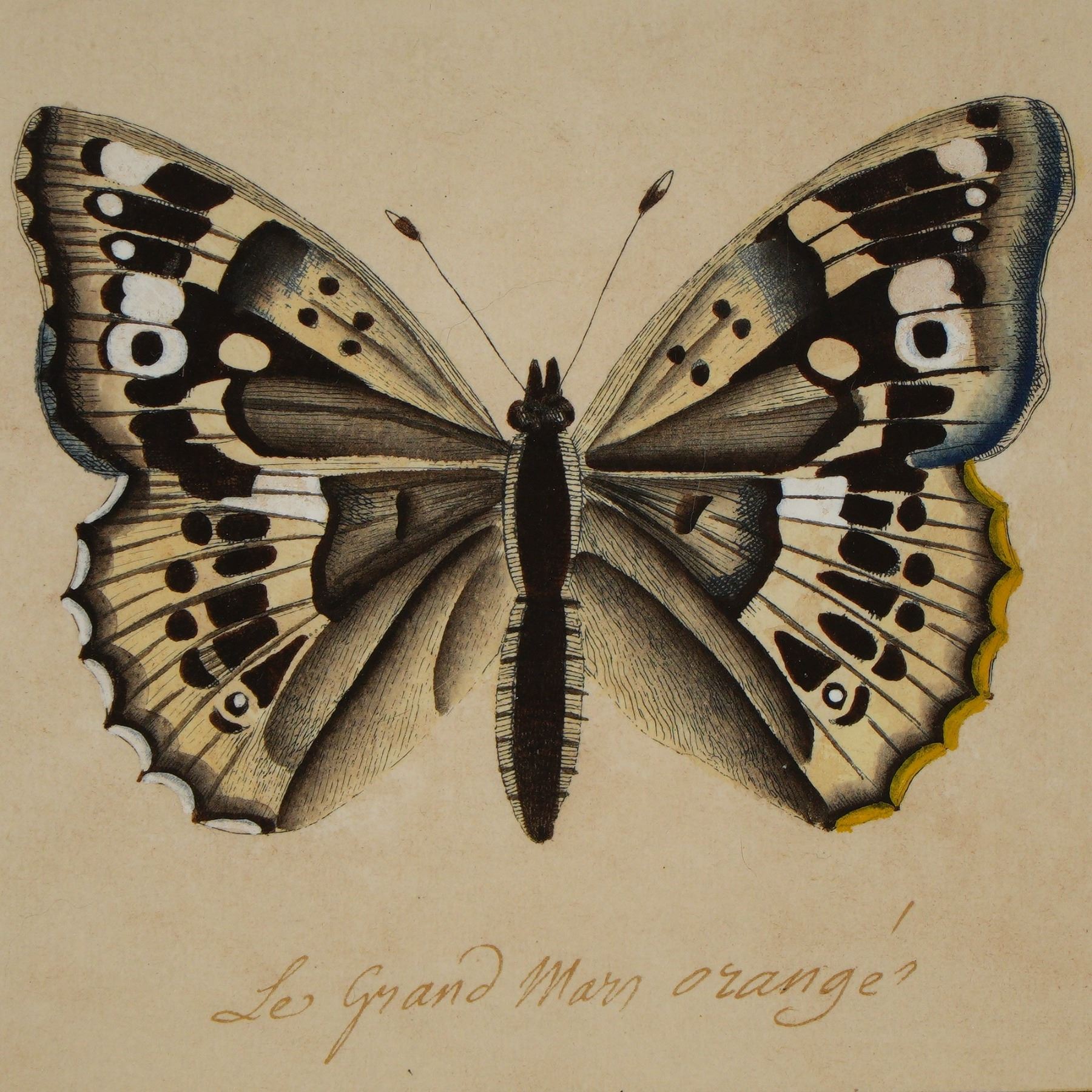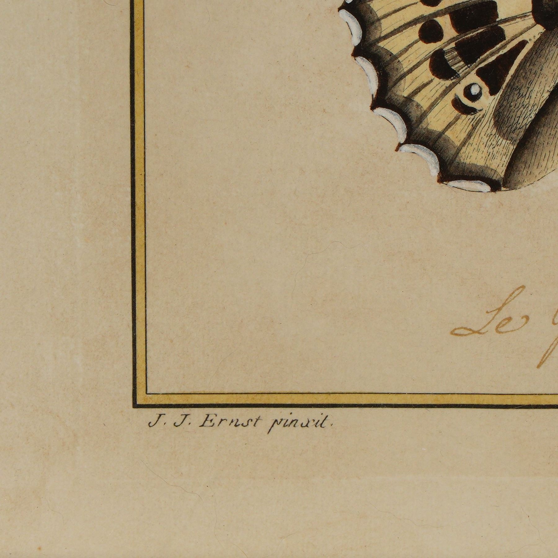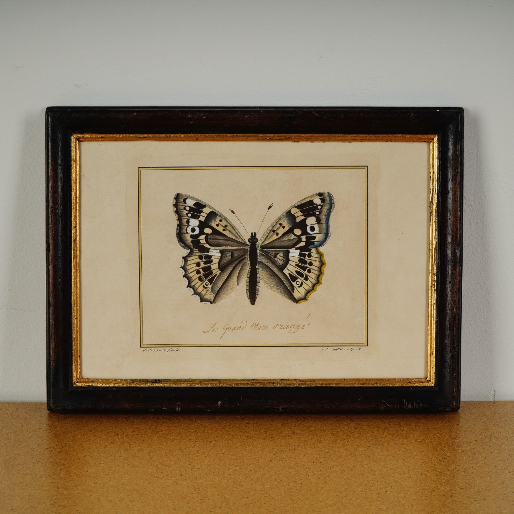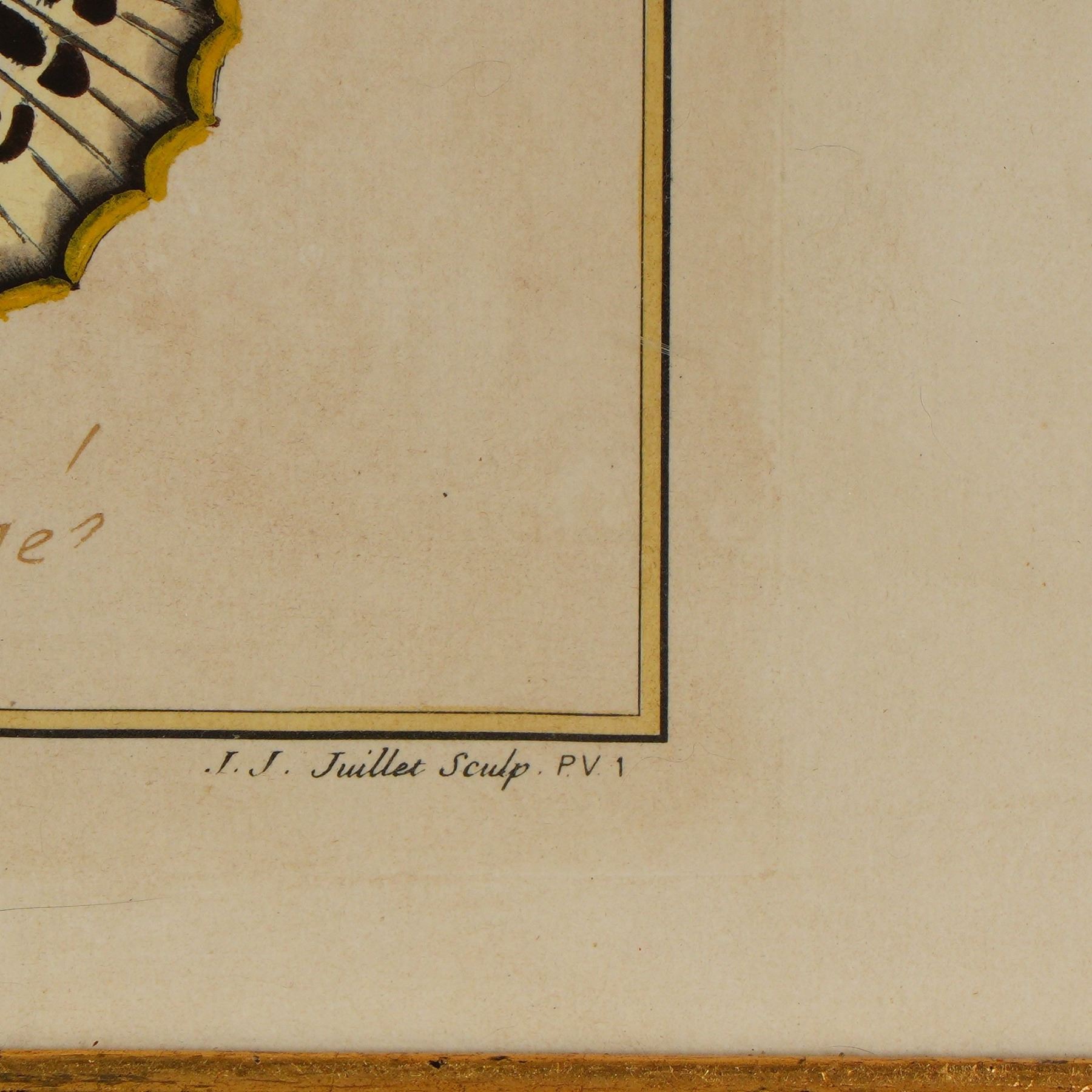 A beautifully preserved original hand-colored engraving depicting the butterfly Le Grand Mars Orange. This exquisite natural history plate by Jean Jacques Ernst was engraved by Jean Jacques Juillet, both noted contributors to the great French tradition of Enlightenment-era natural history illustration. The butterfly is rendered with remarkable attention to detail, the delicate veining and vibrant tinting heightened with period hand-coloring. Jean Jacques Ernst was a Swiss-born painter and naturalist active in France, remembered for his collaborations on botanical and zoological plates during the golden age of natural history exploration. His works embody the period's fascination with cataloguing the natural world in artful scientific form. J. J. Juillet was a skilled French engraver who specialized in translating these delicate paintings into precise copperplate engravings for publication and collector editions. Together, their work contributed to the flourishing illustrated compendiums of butterflies, plants, and fauna so highly prized among aristocratic collectors and natural philosophers of the 18th and early 19th centuries. The inscription beneath reads Le Grand Mars Orange, in ink, with credits below: J. J. Ernst pinxit and J. J. Juillet sculp.