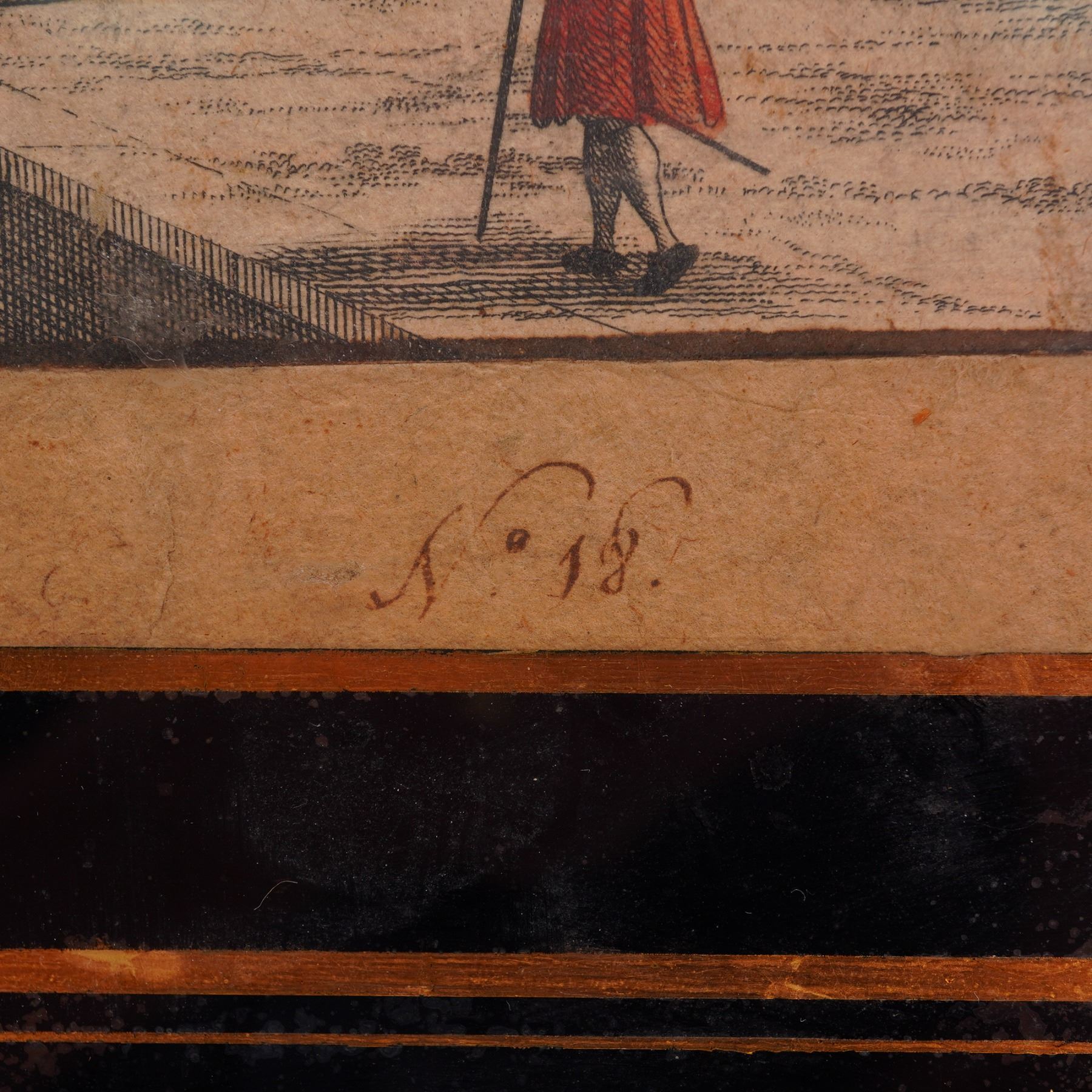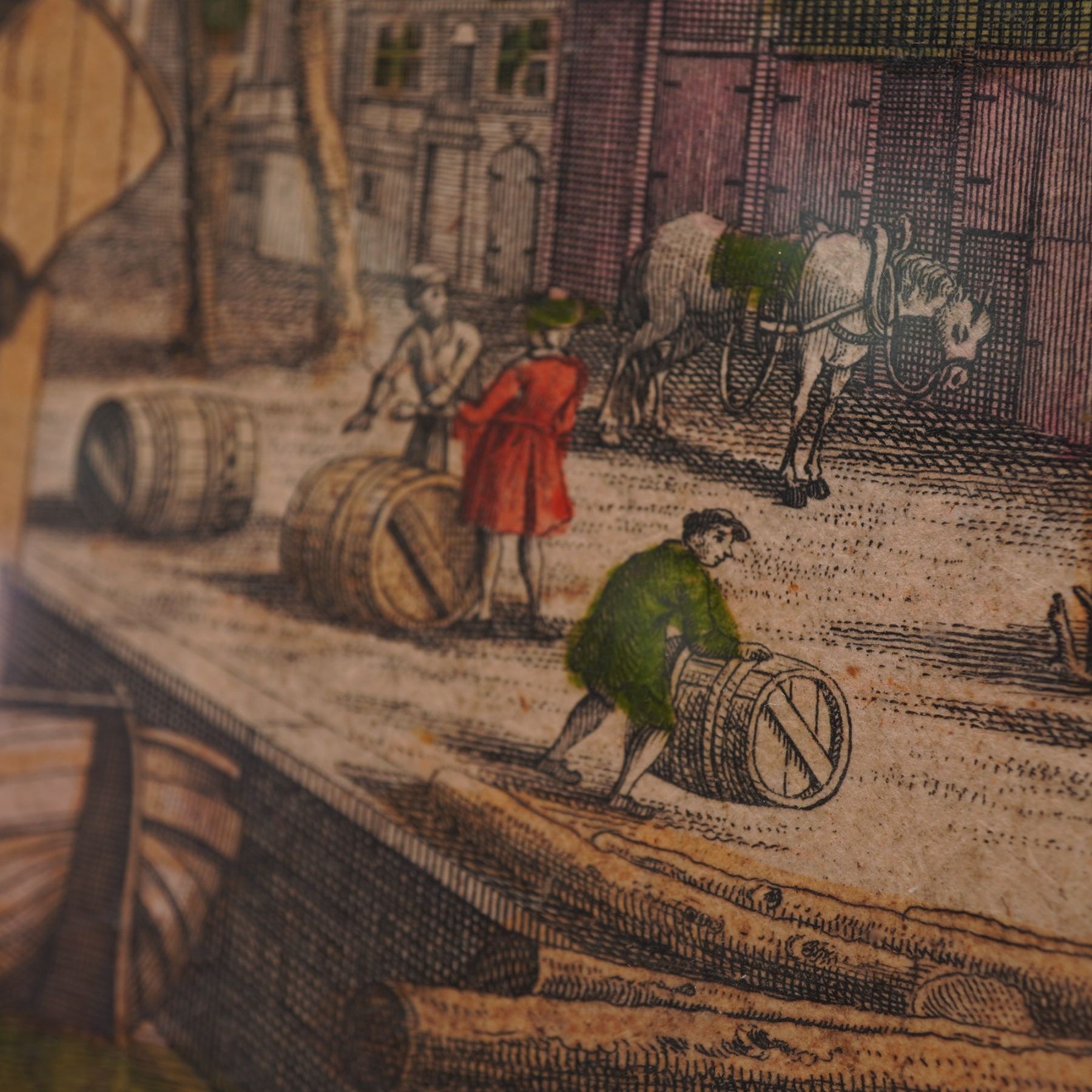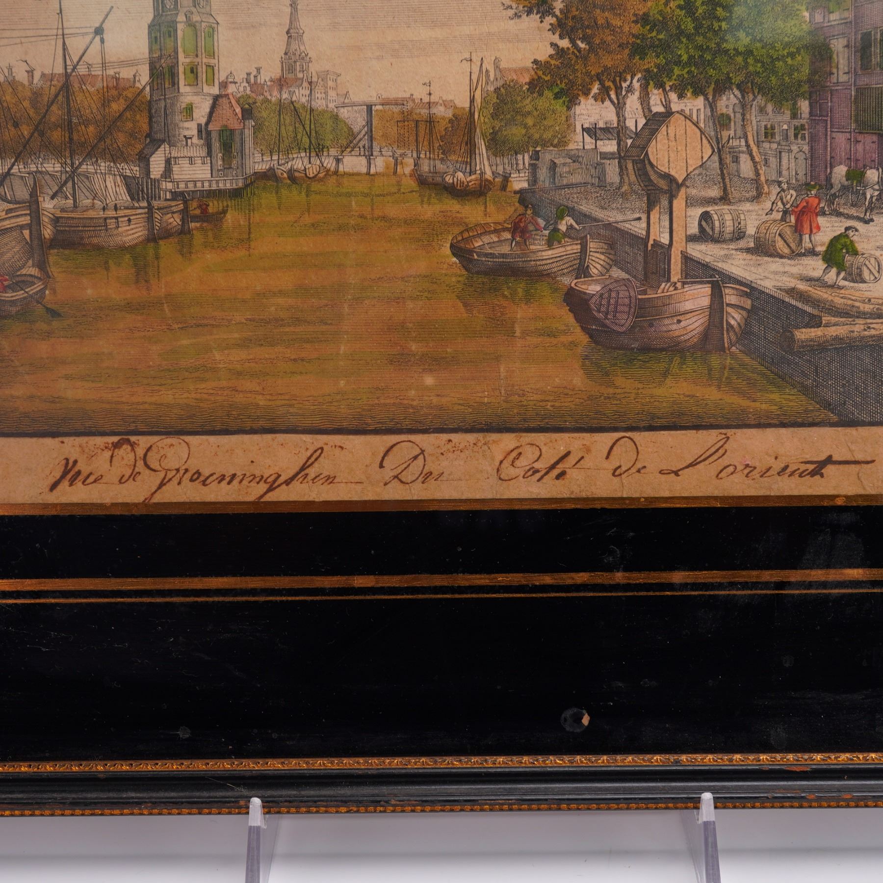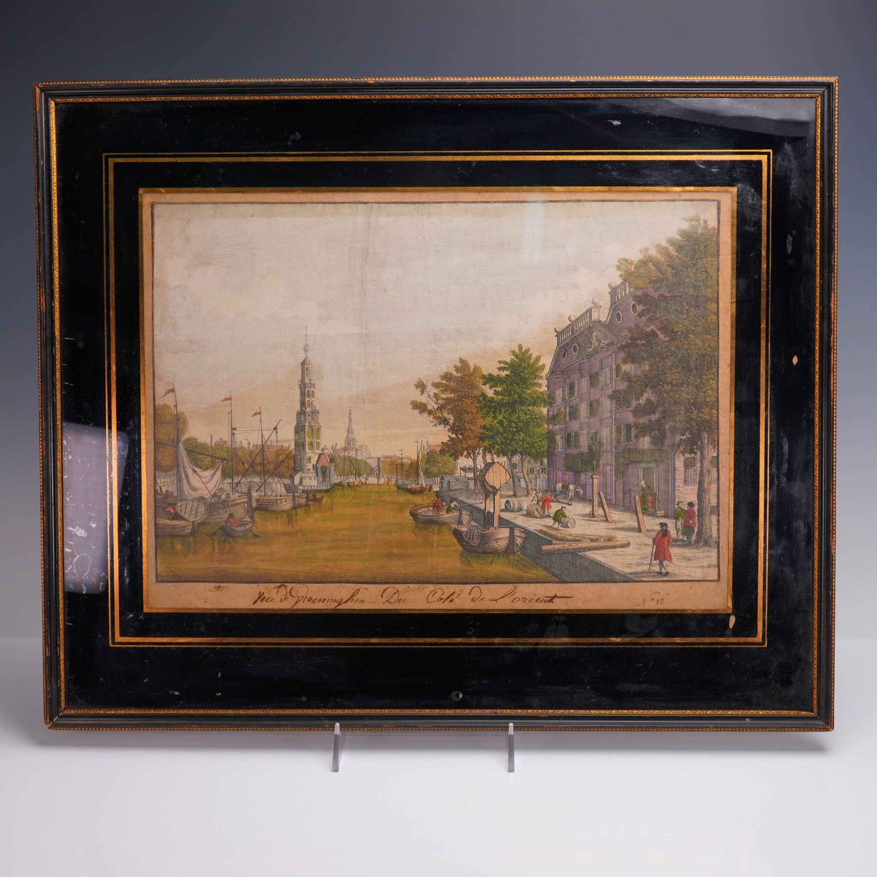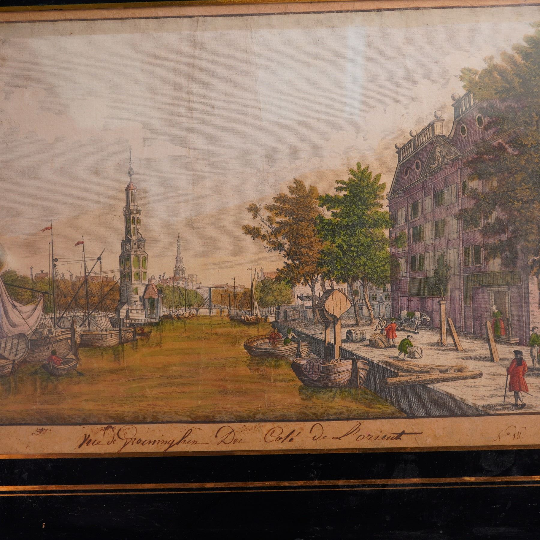 A fine 18th-century hand-colored perspective view by Georg Balthasar Probst, titled Vue de Groeningen du Cote de l'Orient. This optical print, or vue d'optique, depicts a lively canal scene in Groningen, The Netherlands, seen from the eastern perspective. Detailed figures, sailing vessels, and architecture line the waterway, all executed with vivid hand-applied color. The scene features bustling dockworkers handling barrels and goods, alongside townhouses, boats, and a church spire prominently rising in the background. Probst's name is associated with the Augsburg publishing house that specialized in these perspective views, often intended for use with zograscopes, optical devices popular in the 18th century. This engraving is numbered No. 18 in the lower margin and contains the customary French title inscription. Presented under glass in an ebonized and gilt-edged wood frame with original backing intact.