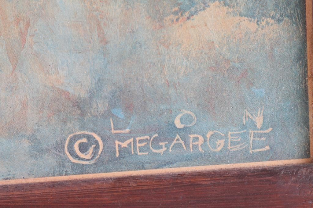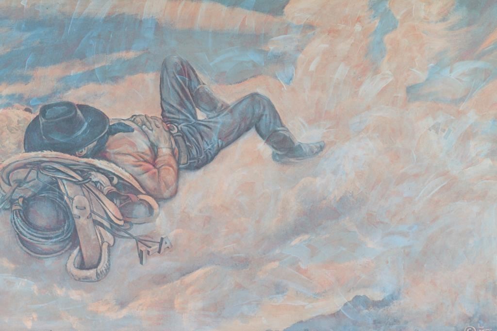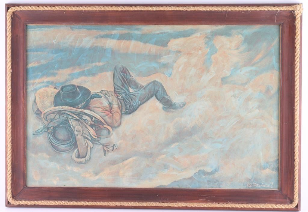 By artist "Lon Megargee" entitled "Cowboys Dream" nicley framed with rope accent surrounding the print.image size measuring 25x18. Overall good condition with note on back reading it was presented by the "Arizona Brewing Co "A-1 Pilsner Beer".