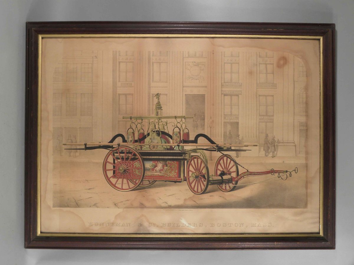 Early Hand Colored Firemen's Lithograph L.H. Bradford Co. Boston, Mass. Depicting a Hunneman Engine. Framed under glass. Staining on border and top of print otherwise good condition. 37 X 27 inches overall.