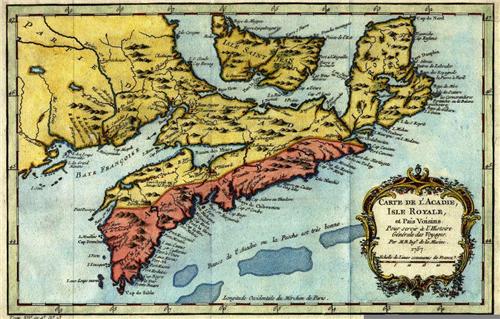 Hand-Colored Map. Of island of Acadia, made famous by Longfellow in his poem "Evangeline." "Carte de l'Acadie, Isle Royale." 10 x 141/2. Fought over by French and English, its inhabitants deported by the English in 1755, just two years prior to date of this map, and scattered from Maine to Louisiana. Beautifully colored, ornate cartouche at lower right. Excellent.