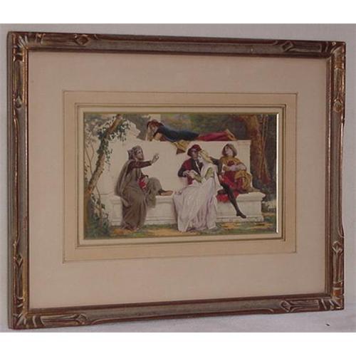 A very nicely framed and matted early 20th century print with hand colored highlights. The scene is five young people sitting in a garden listing as one of them speaks. A carved wood frame holds this 11" X 6 1/2" print with a hand decorated matt. Unsiged.