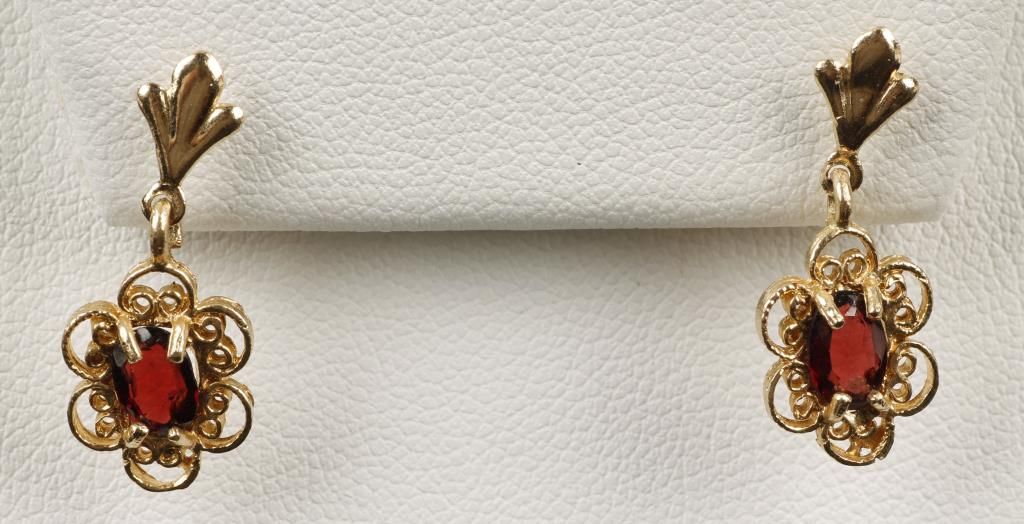 Filigree setting, the earrings are very feminine and drop almost 1". They weigh 1.8 grams and have post backs.