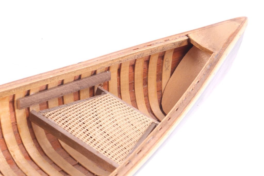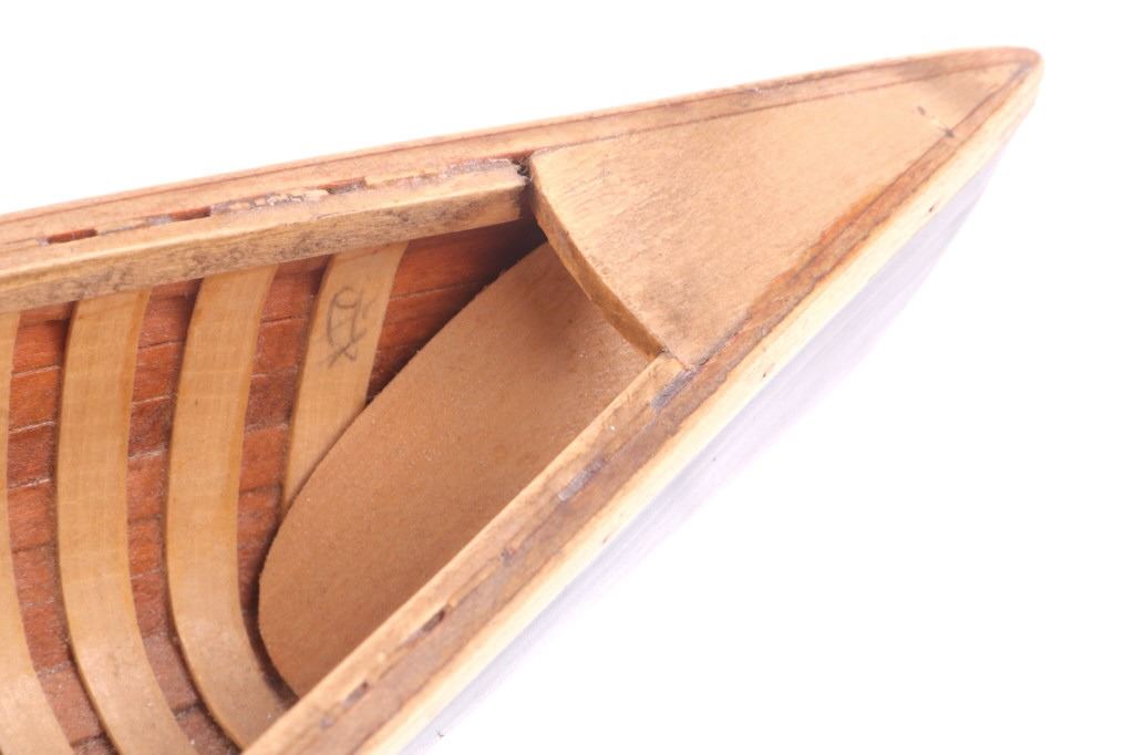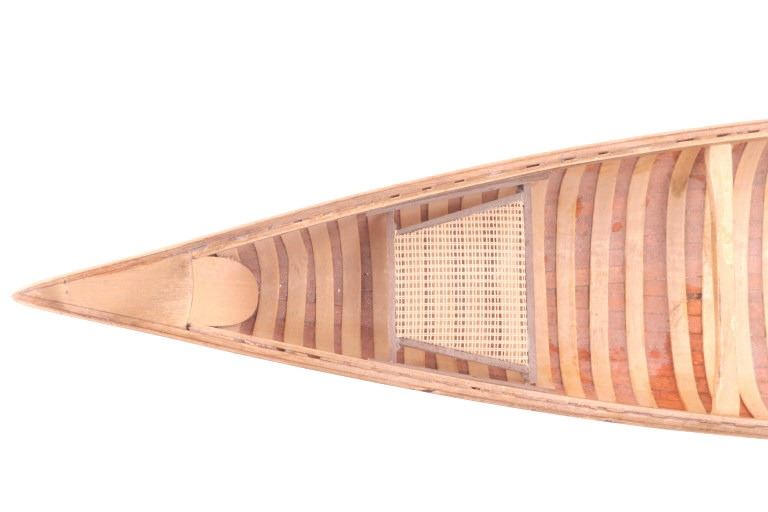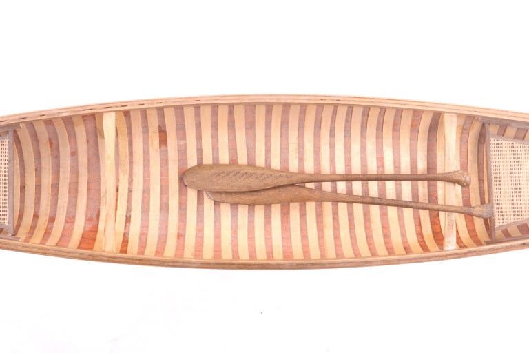 Featured in this lot is this hand crafted Birchwood salesman sample canoe. The canoe shows a wonderful hand crafted design with two paddles and lovely green painted exterior. These originals are highly collectible and can be difficult to come by. The condition of this canoe is good, with a minor repair to the cross sections. The measurements of this carved salesman sample canoe are 27 1/2" x 4 3/4" x 1 1/2".