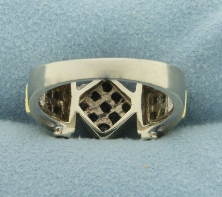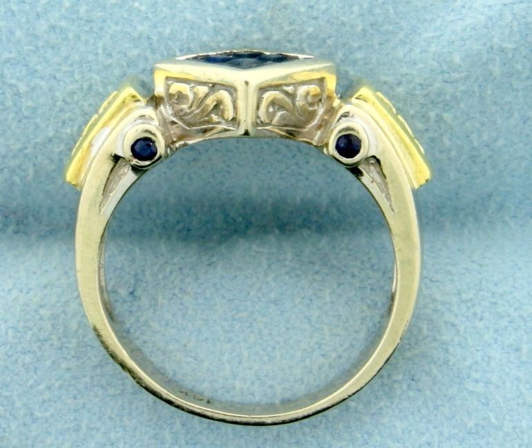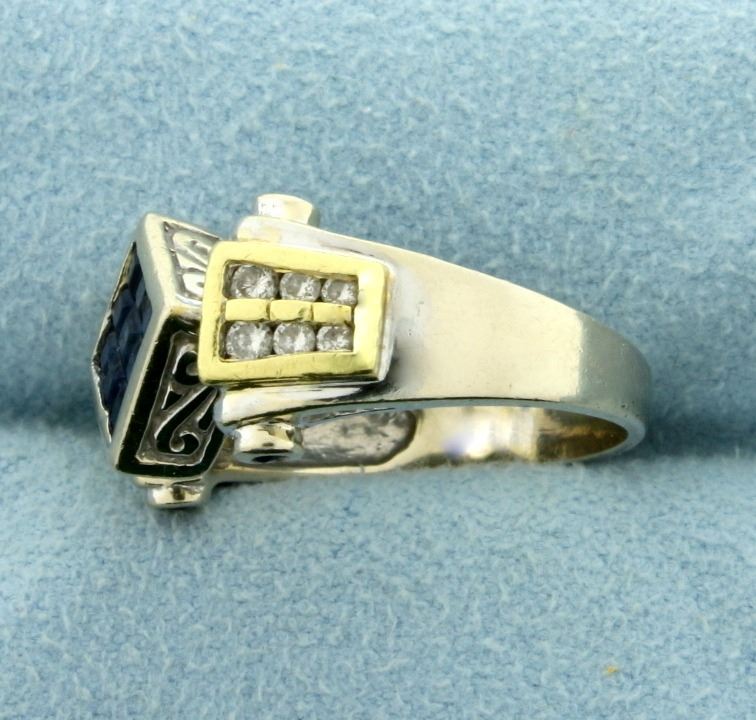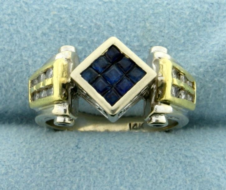 In 14K White and Yellow Gold. Contains nine 2mm square shaped and four 1.5mm round high quality natural Sapphire gemstones with deep blue color and excellent clarity. Also contains twelve high quality Diamonds ranging from .01 to .03ct, SI clarity/H color. Size 7. 7.1g