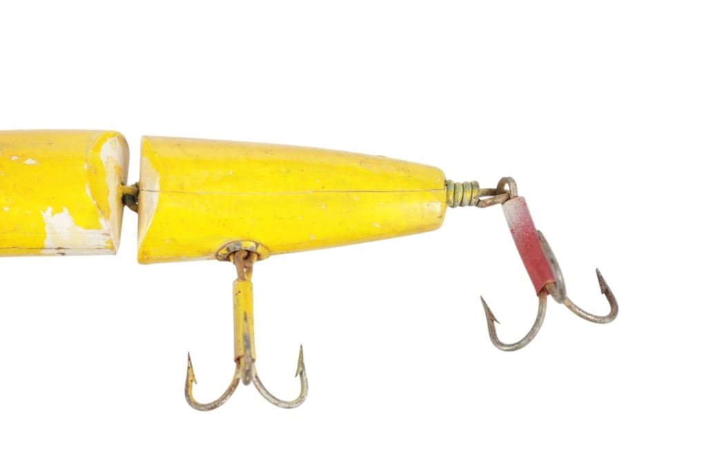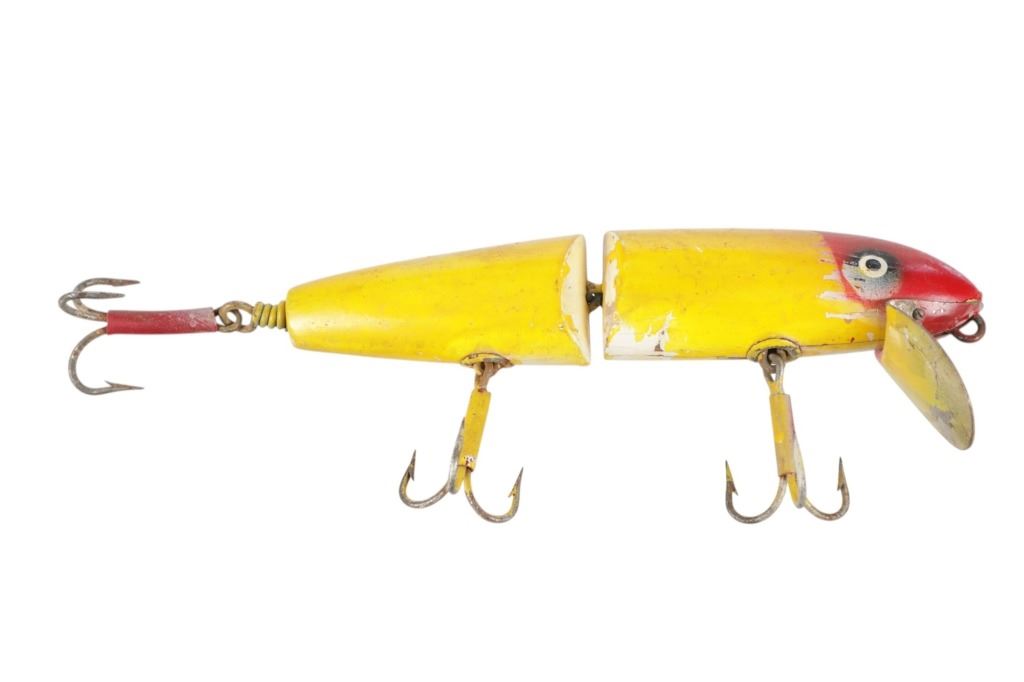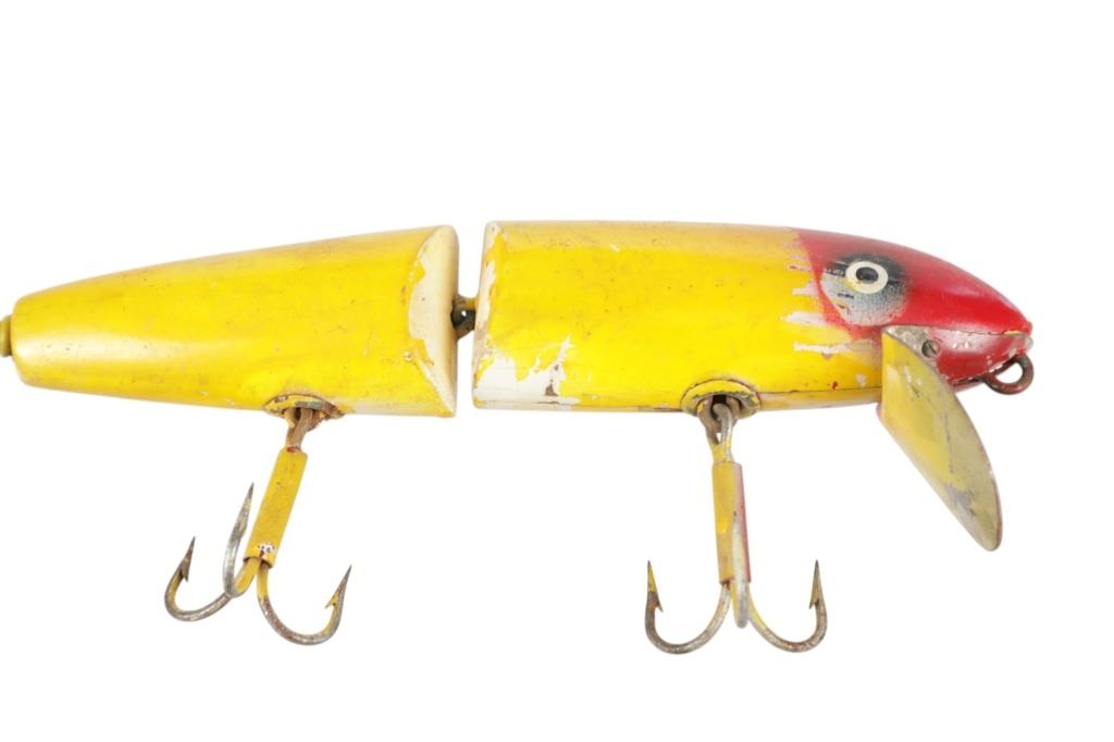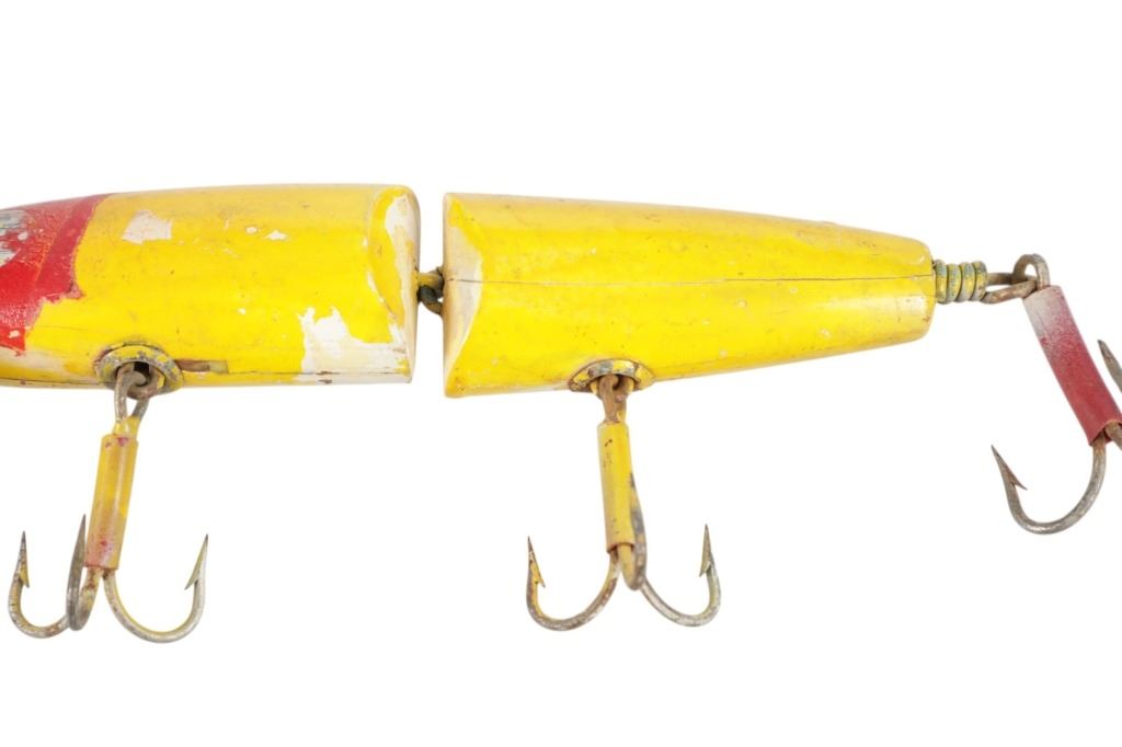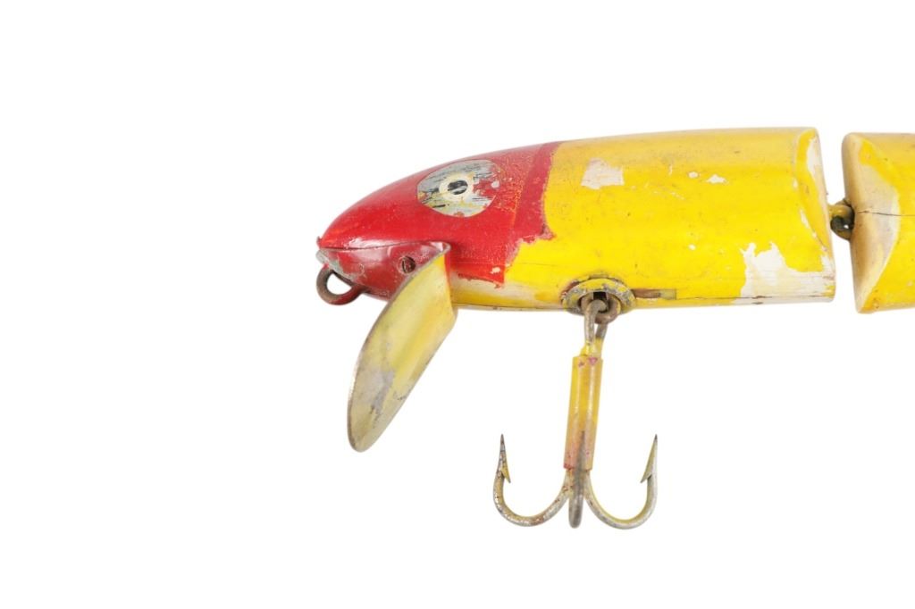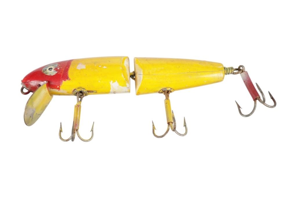 Featured in this lot is this hand crafted segmented "Pikey" Lure circa 1950's. the lure features a wonderfully and professionally crafted wood and metal construction that shows a segmented design for life like reflexes and shows three treble hooks with a spoon attached to the front. The lure is painted yellow and red. The condition of this fishing lure is preserved with some natural wear to the paint of the lure and some oxidation to the lure treble hooks but otherwise shows a preserved condition. The measurements of this lure is 9" x 4" x 1 1/4". The collective weight of this lure is U4oz.
