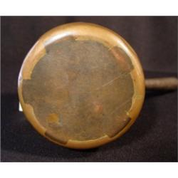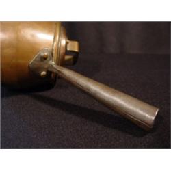 4" Tall with 3 1/2" diameter and 4 1/2" handle. Primitive brass small cook pot with copper bottom and iron handle. All hand crafted. Ca 1850-1860.