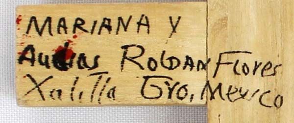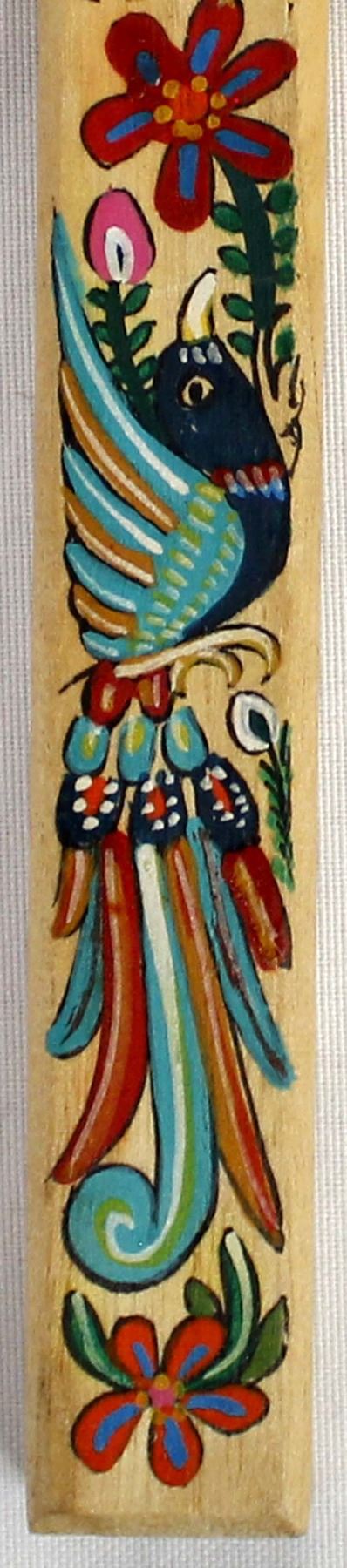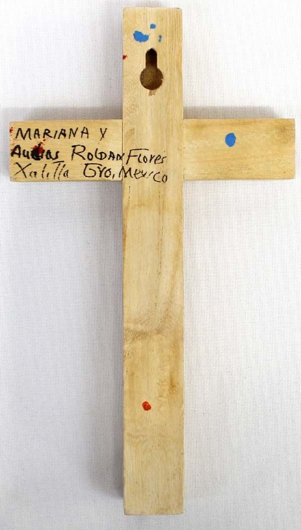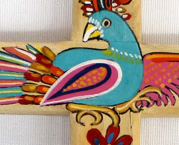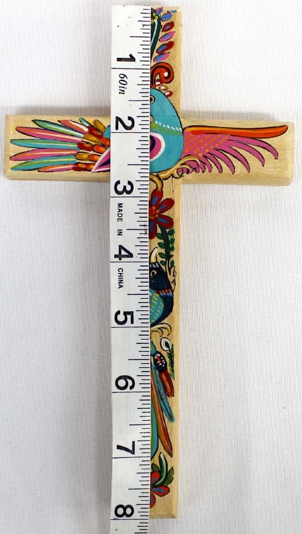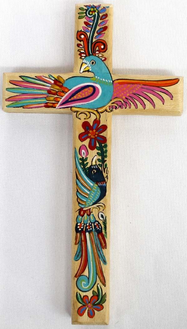 Hand Crafted Wood Cross by Mariana & Audras Roldan Flores of Xalitla Guerrero Mexico, measures 8'' x 4.5'', beautifully hand painted flowers and birds, signed on the back