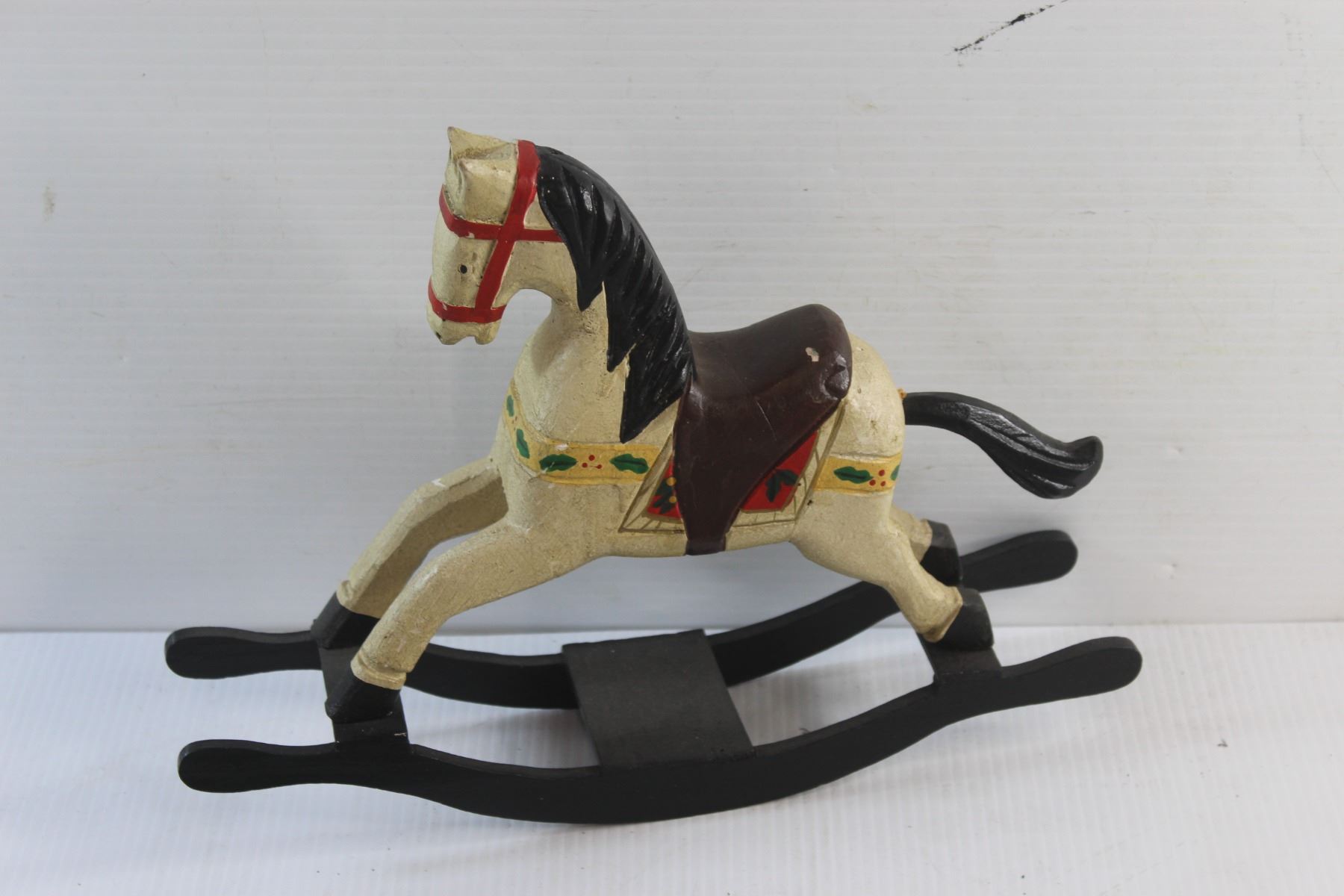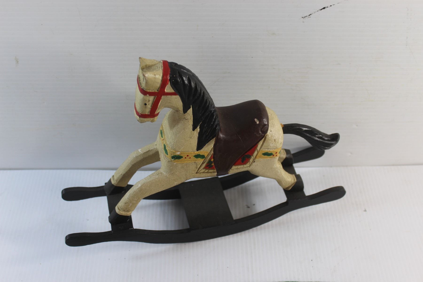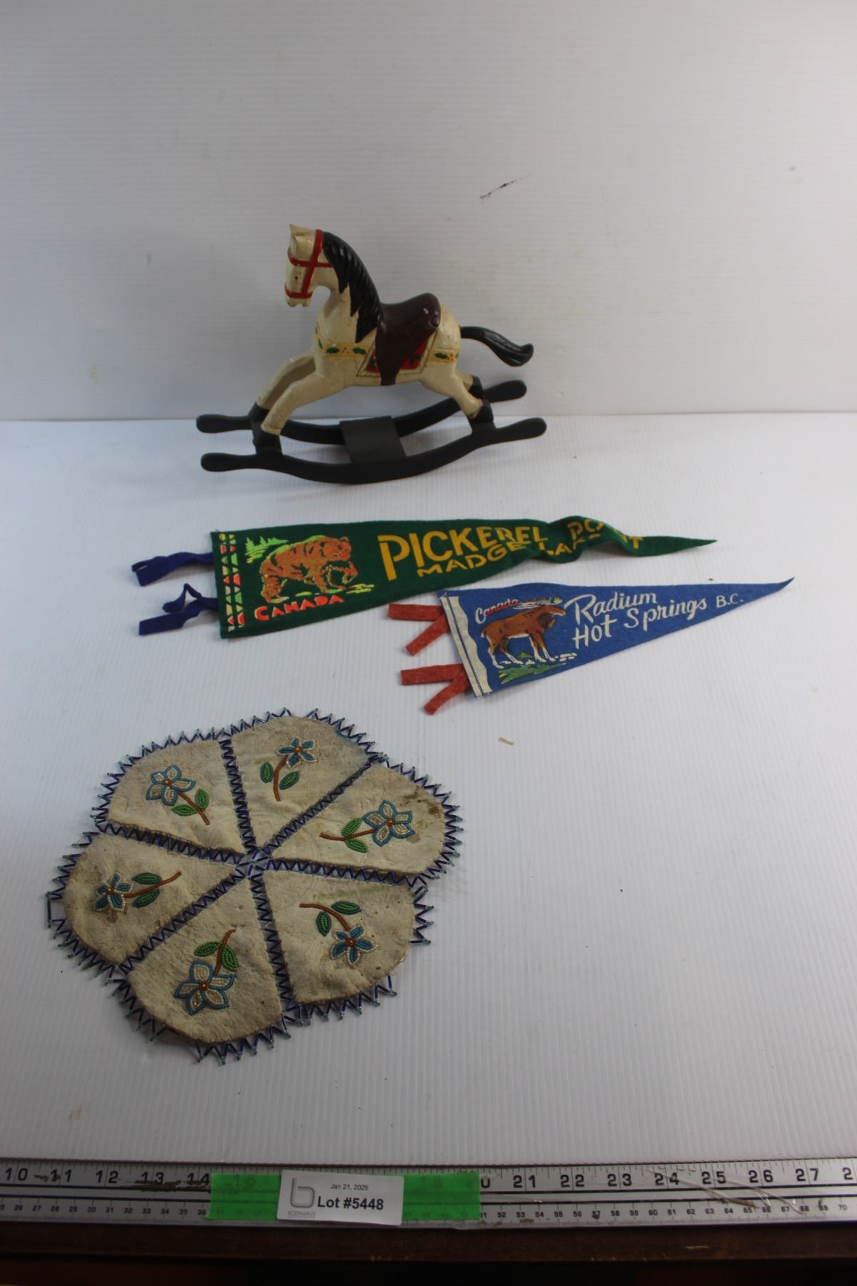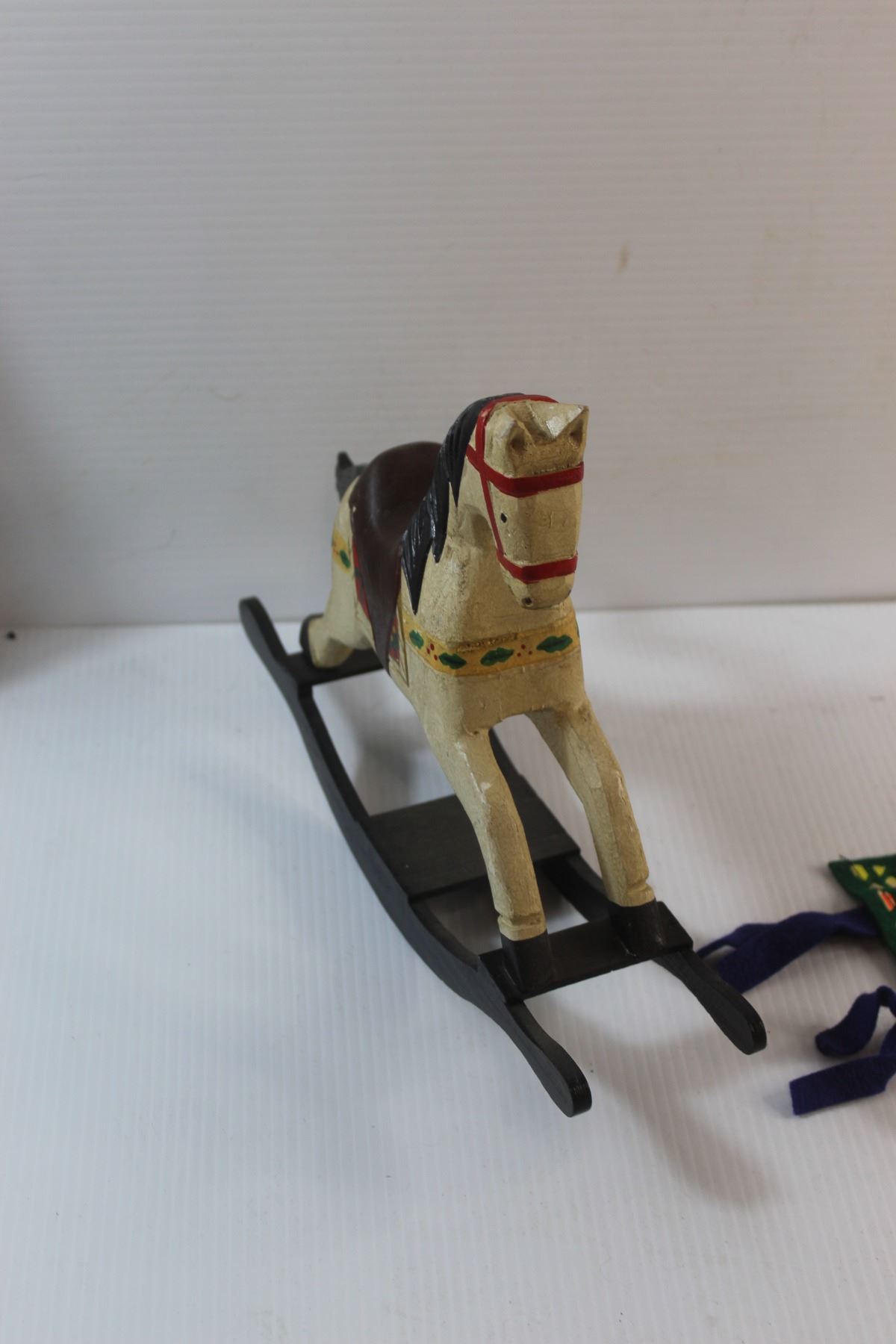 Hand Crafted Wooden Rocking Horse, Pennants and Beaded Mat