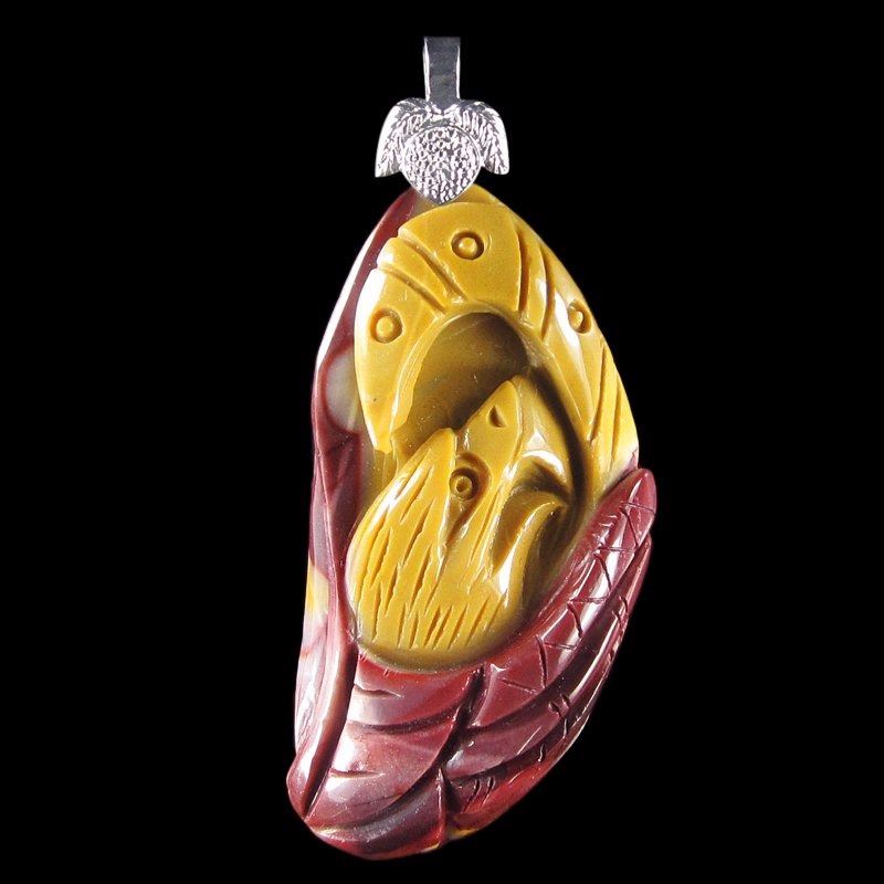 This is a hand carved Eagle Pendant*Stone Name Mookaite *Overall Dimension 74x30x14 mm (2.913x1.181x0.551 inch )mm *Weight 155 ct/ 31 g/ 1.093494 oz *Mohs Hardness 6-7 *Source Natural *Treatments None *Drilled YES diameter 2.5/36-3/36 inch *This Eagle bead is handcarved out of one piece of gemstone Mookaite .The creative design of each item is based on the stone's natural color and pattern and it demands great craftmenship and patience to complete . This beauty is absolutely a unique center piece for your jewelry design. .