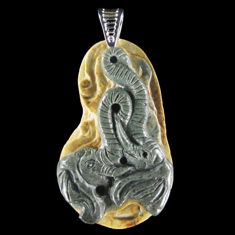 This is a hand carved Elephant Pendant *Stone Name Succor Creek Jasper *Overall Dimension 74x39x13 mm (2.913x1.535x0.512 inch )mm *Weight 210 ct/ 42 g/ 1.481508 oz*Locality USA - Oregon *Appearance opaque *Color Brown Gray yellowish bluish *Mohs Hardness 7 *Source Natural *Treatments None *Drilled YES diameter 2.5/36-3/36 inch *This Elephant bead is handcarved out of one piece of gemstone Succor Creek Jasper .The creative design of each item is based on the stone's natural color and pattern and it demands great craftmenship and patience to complete . This beauty is absolutely a unique center piece for your jewelry design. .~~~~~~~~~