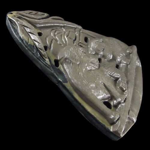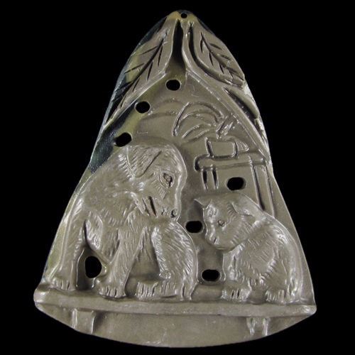 Hand carved Dog Pendant....Mama dog and cub; Stone Name Ribbon Jasper *Overall Dimension 73x60x10 mm (2.874x2.362x0.394 inch )mm *Weight 235 carat**Mohs Hardness 7 *Source Natural *Treatments None *Drilled YES diameter 2.5/36-3/80 inch *Other Names Banded Jasper Jasperine Ribbon Jasper Striped Jasper*This Dog pendant is carved out of one piece of gemstone Ribbon Jasper . This beauty is absolutely a unique center piece for your jewelry design. .