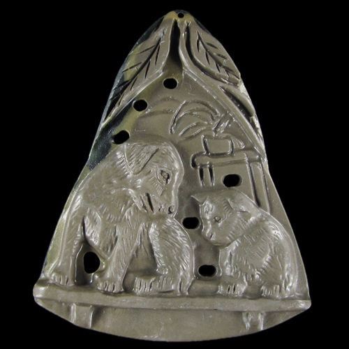Hand carved Dog Pendant....Mama dog and cub; Stone Name Ribbon Jasper *Overall Dimension 73x60x10 mm (2.874x2.362x0.394 inch )mm *Weight 235 carat**Mohs Hardness 7 *Source Natural *Treatments None *Drilled YES diameter 2.5/36-3/80 inch *Other Names Banded Jasper Jasperine Ribbon Jasper Striped Jasper*This Dog pendant is carved out of one piece of gemstone Ribbon Jasper . This beauty is absolutely a unique center piece for your jewelry design. .