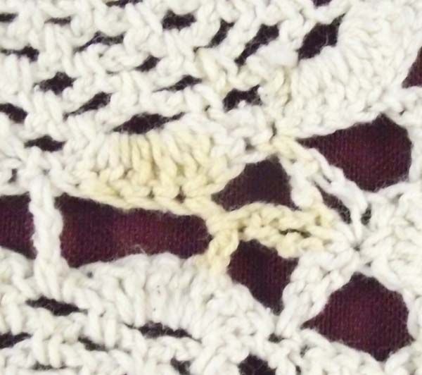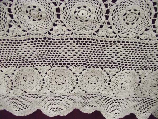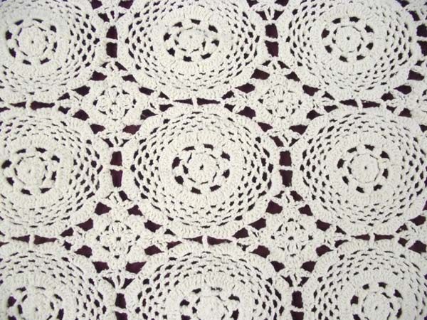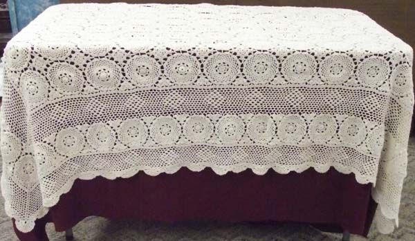 Hand Crocheted Ecru Table Cover. A beautiful design with no tears or holes. A few small stains which may be worked out with care. 76''L x 58''W, this cover is just plain pretty!