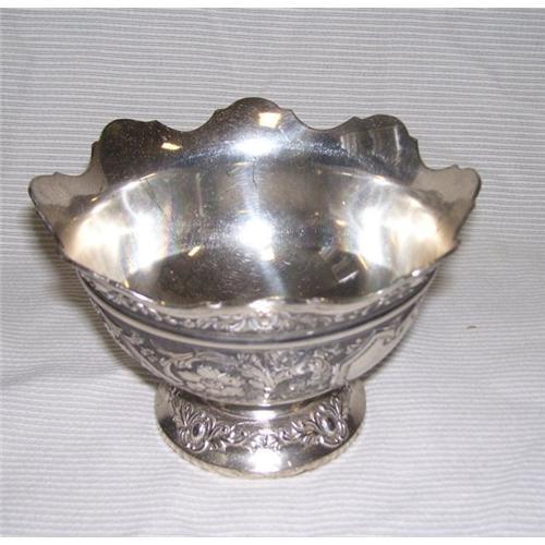 <tr><td>Title:Hand Decorated Embossed Silver English Bowl</td></tr>