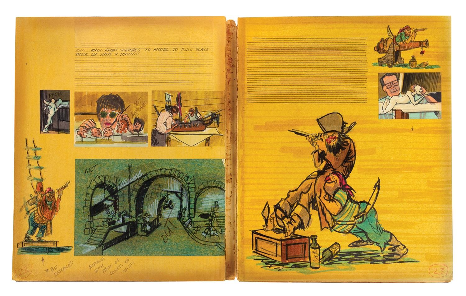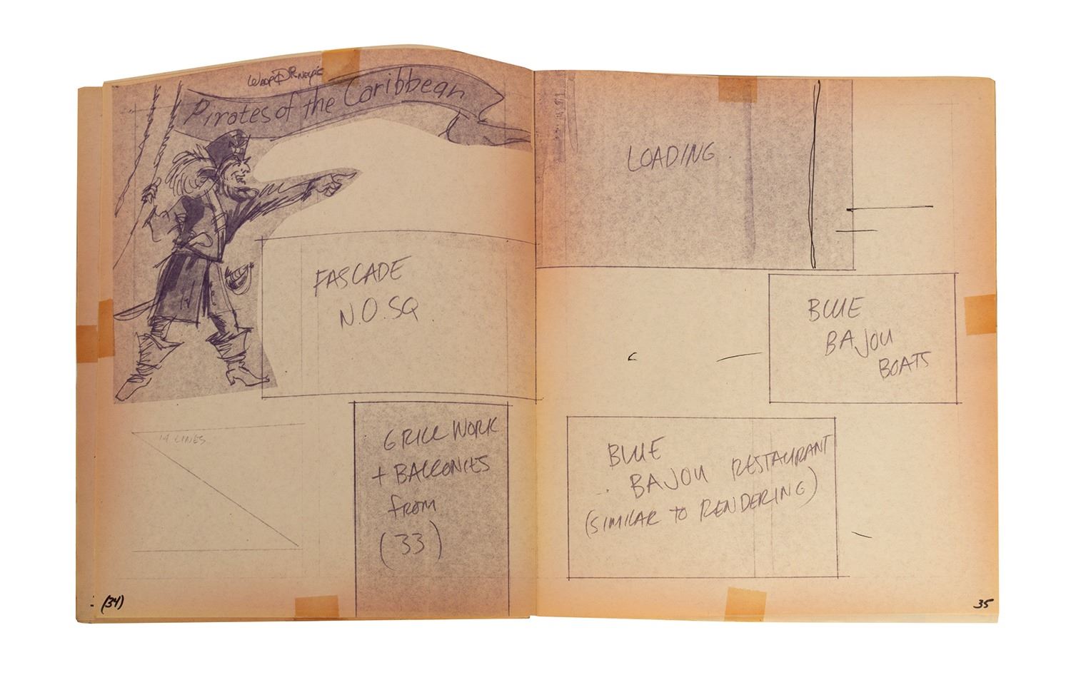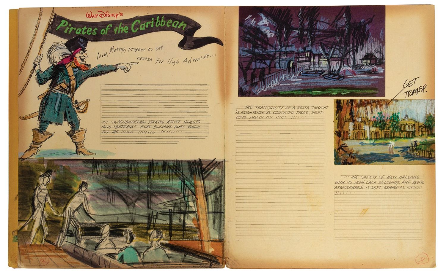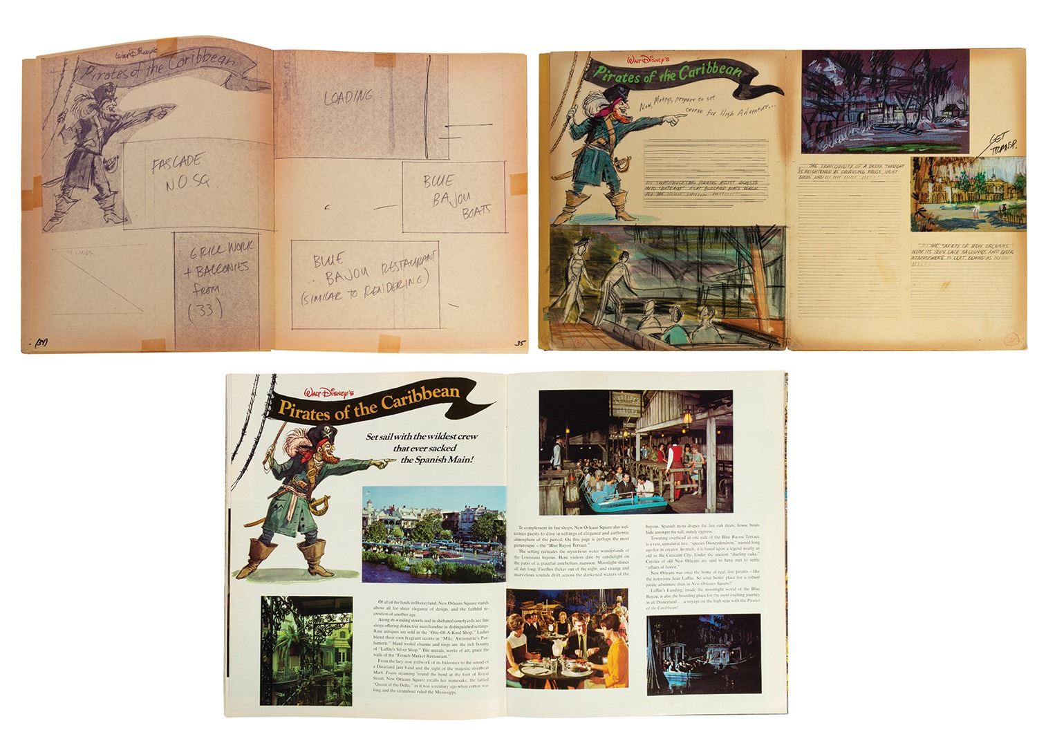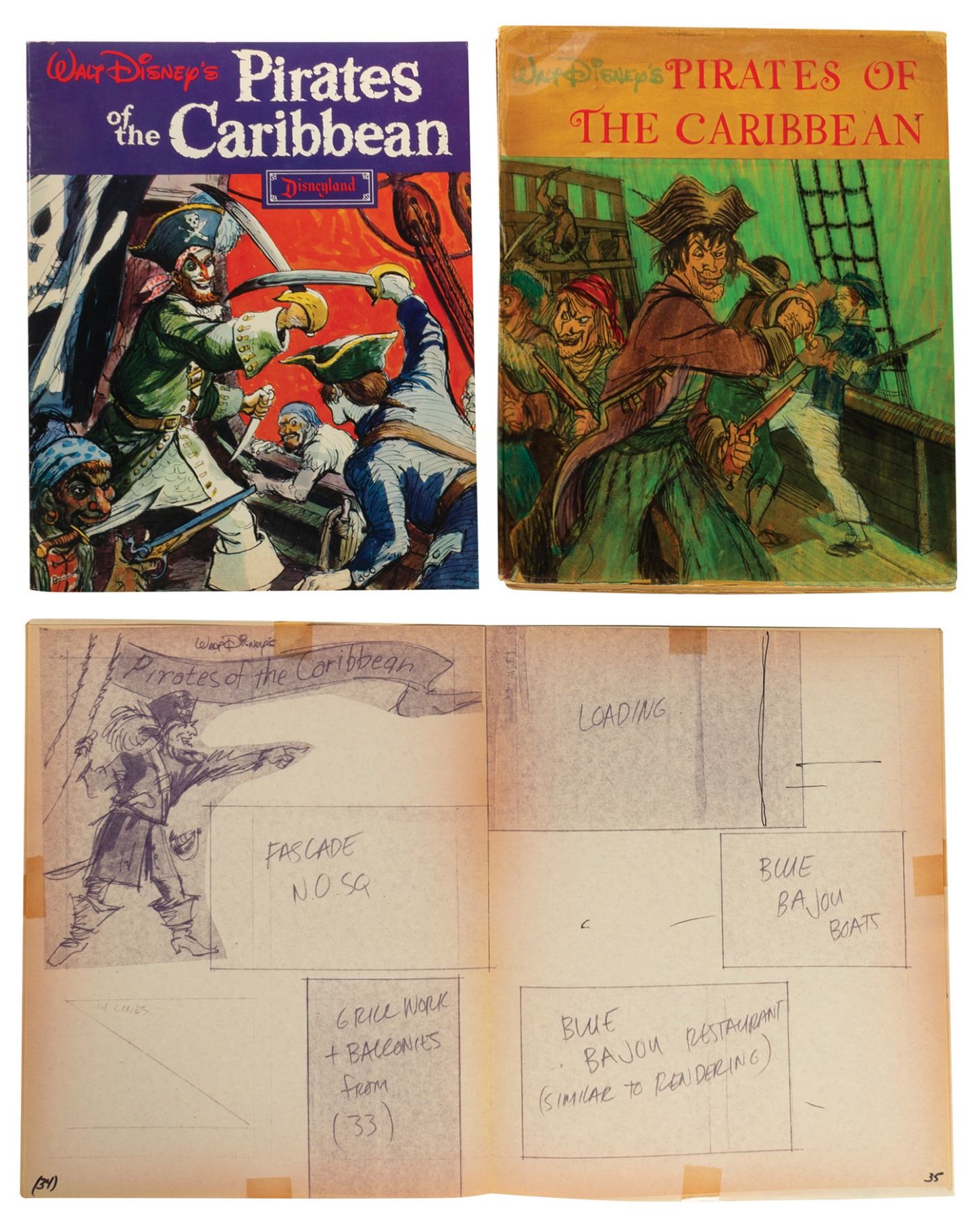 (Disneyland, c.1967) A one-of-a-kind hand-drawn mock-up for the Pirates of the Caribbean guidebook. The Pirates guidebook is one of the most well-known Disneyland souvenir books, and tells the story and background of this fan-favorite attraction through gorgeous photos and concept artwork. This mock-up contains (46) pages of hand-drawn artwork, attributed to Imagineer Ken Chapman, based on the designs of Imagineer Marc Davis. The mock-up is full of hand-written placeholder text next to the artwork, as well as editing notes throughout by Imagineer Marty Sklar. Each page is an individual sheet that is glued together by hand to form the complete book, and many pages have hand-trimmed and applied original artwork with notes, forming an indepth look into how this souvenir guidebook came to be. The entire attraction story is retold here, including re-drawn illustrations based on some of Davis' most popular concept artwork, such as the dog holding the jail key, the pirate auctioneer, the pirate on a cannon, and the pirate's skeletal remains. Original Pirates of the Caribbean artwork is some of the most prized original Disneyland artwork, with a hand-drawn mock-up of the entire attraction experience being an unheard of archive of Pirates of the Caribbean history. Additionally, Sklar's hand-written notes throughout make this not just a testament to the attraction itself, but to the Imagineering process that brought us some of the park's most iconic attractions. Included with this mock-up is an earlier 26-page brownline draft for a portion of the book which has segments of hand-written text and additional notes throughout by Sklar. Also, a final version of the completed guidebook is included. The mock-up measures 11"x9", and is in good condition overall, with some chipping and small tears around the edges and to the spine of the cover from use. Many of the inner pages are loose from the spine, but the mock-up is complete.
