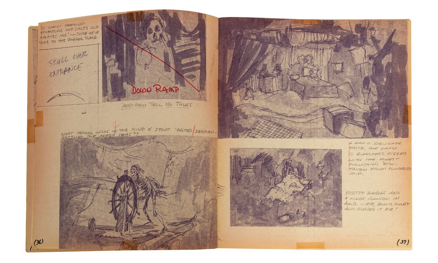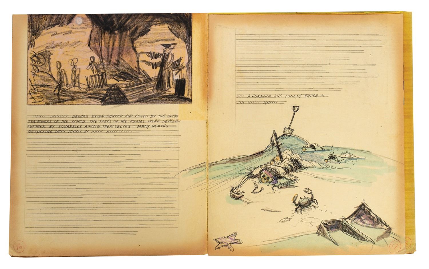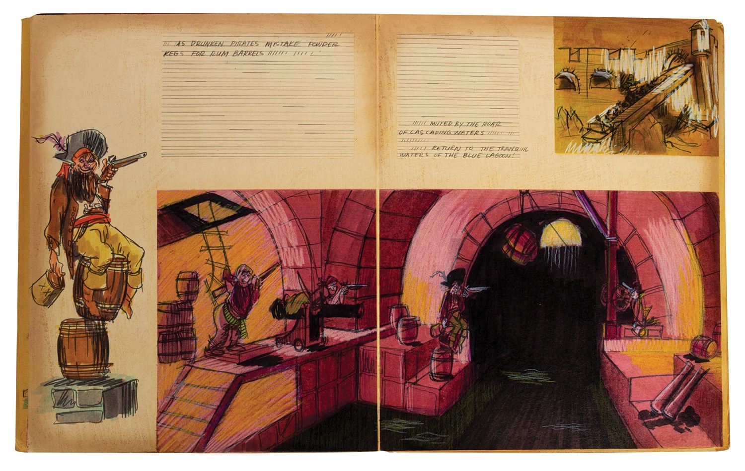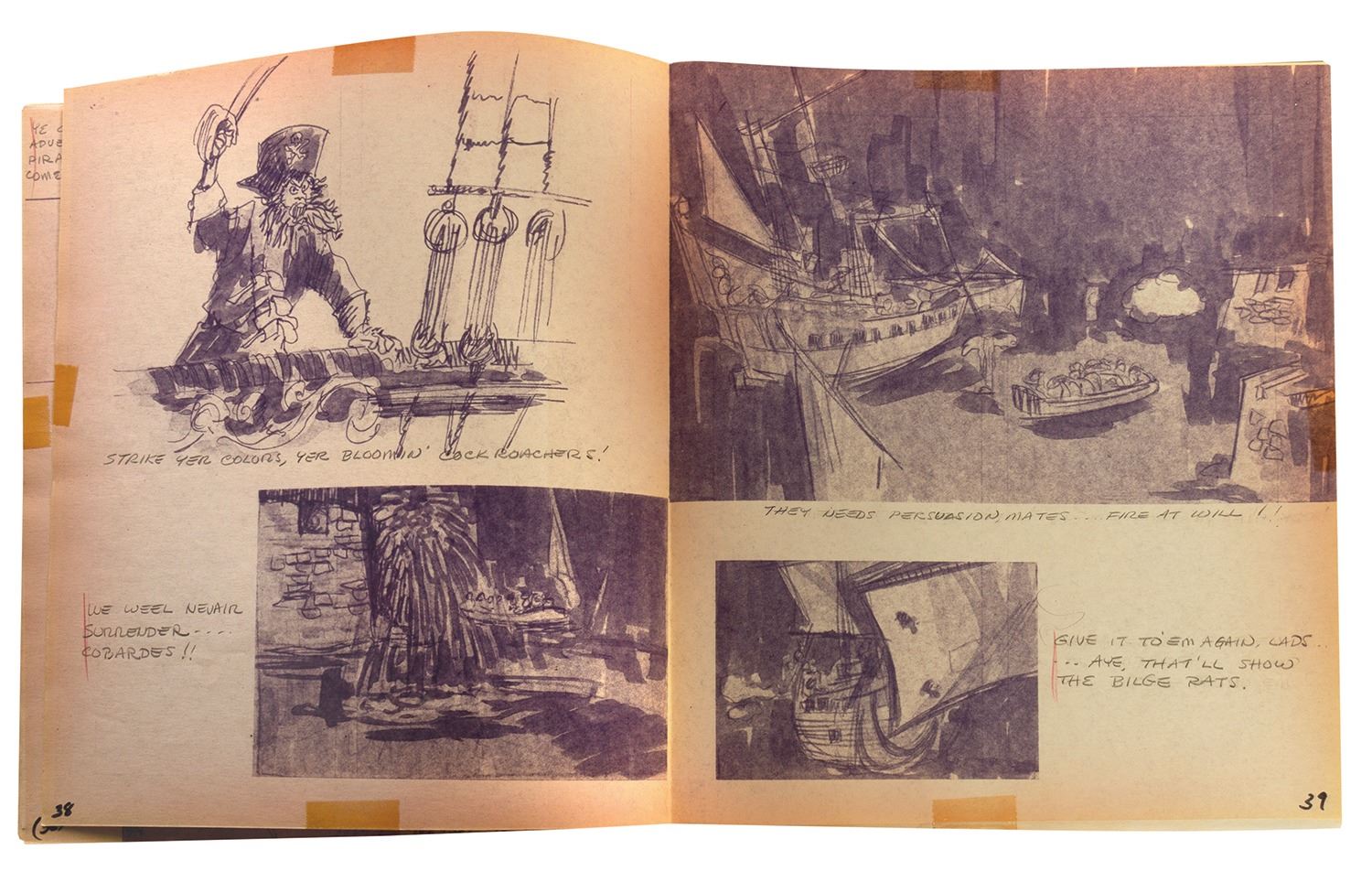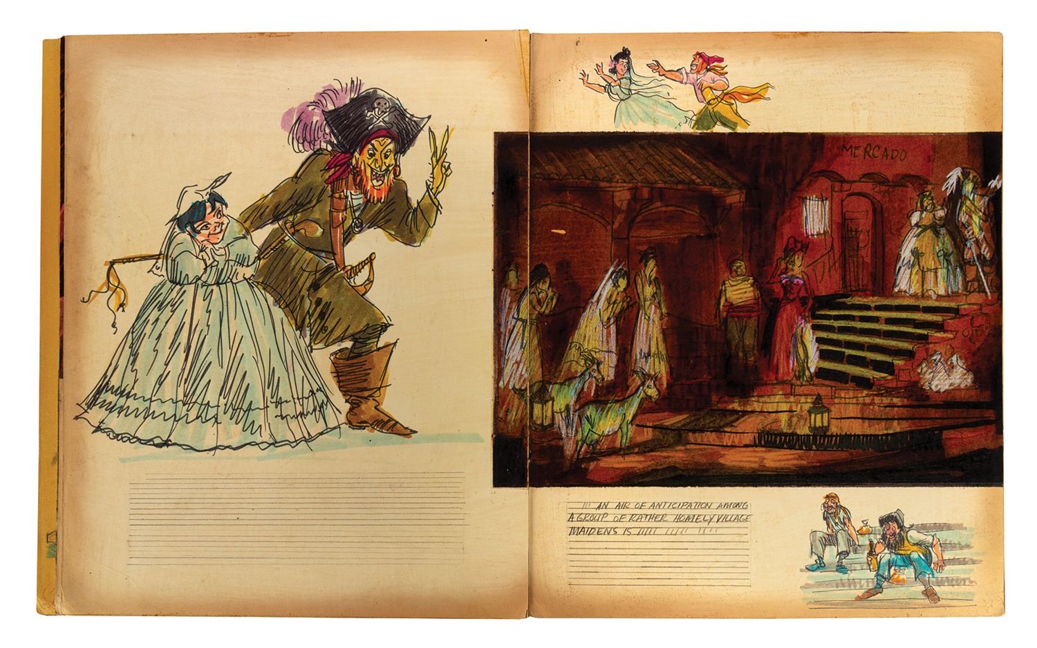 (Disneyland, c.1967) A one-of-a-kind hand-drawn mock-up for the Pirates of the Caribbean guidebook. The Pirates guidebook is one of the most well-known Disneyland souvenir books, and tells the story and background of this fan-favorite attraction through gorgeous photos and concept artwork. This mock-up contains (46) pages of hand-drawn artwork, attributed to Imagineer Ken Chapman, based on the designs of Imagineer Marc Davis. The mock-up is full of hand-written placeholder text next to the artwork, as well as editing notes throughout by Imagineer Marty Sklar. Each page is an individual sheet that is glued together by hand to form the complete book, and many pages have hand-trimmed and applied original artwork with notes, forming an indepth look into how this souvenir guidebook came to be. The entire attraction story is retold here, including re-drawn illustrations based on some of Davis' most popular concept artwork, such as the dog holding the jail key, the pirate auctioneer, the pirate on a cannon, and the pirate's skeletal remains. Original Pirates of the Caribbean artwork is some of the most prized original Disneyland artwork, with a hand-drawn mock-up of the entire attraction experience being an unheard of archive of Pirates of the Caribbean history. Additionally, Sklar's hand-written notes throughout make this not just a testament to the attraction itself, but to the Imagineering process that brought us some of the park's most iconic attractions. Included with this mock-up is an earlier 26-page brownline draft for a portion of the book which has segments of hand-written text and additional notes throughout by Sklar. Also, a final version of the completed guidebook is included. The mock-up measures 11"x9", and is in good condition overall, with some chipping and small tears around the edges and to the spine of the cover from use. Many of the inner pages are loose from the spine, but the mock-up is complete.