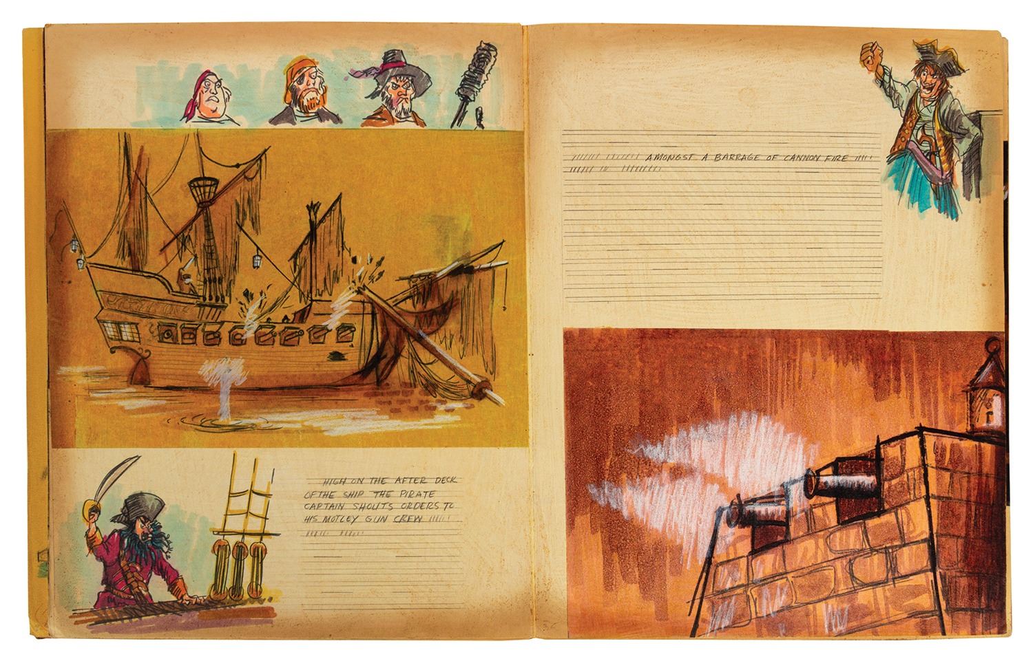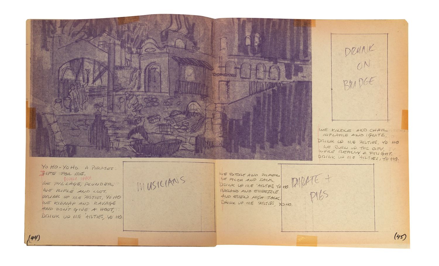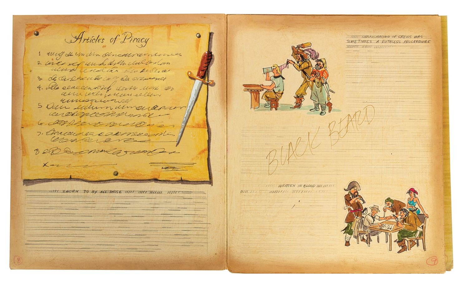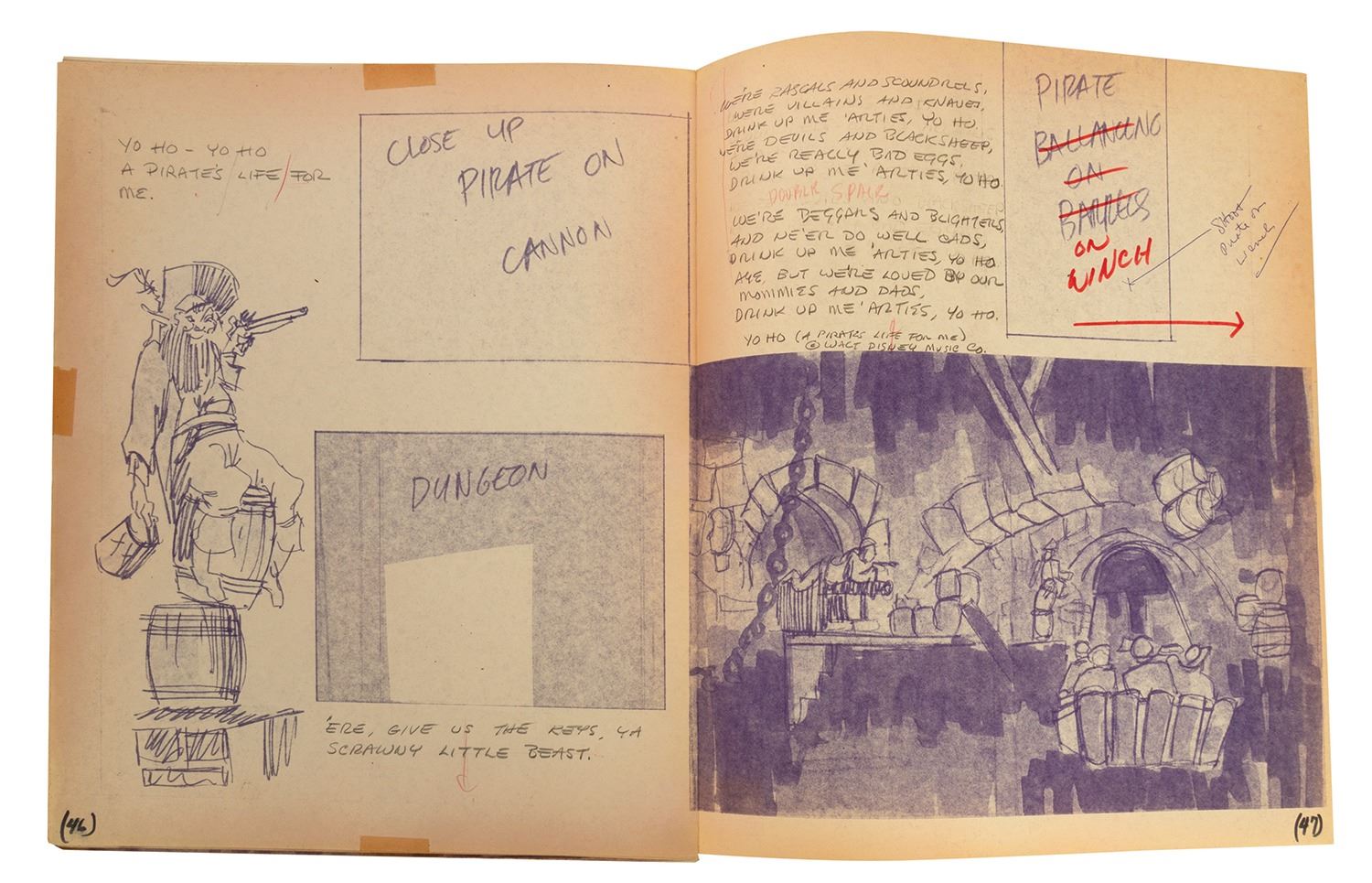 (Disneyland, c.1967) A one-of-a-kind hand-drawn mock-up for the Pirates of the Caribbean guidebook. The Pirates guidebook is one of the most well-known Disneyland souvenir books, and tells the story and background of this fan-favorite attraction through gorgeous photos and concept artwork. This mock-up contains (46) pages of hand-drawn artwork, attributed to Imagineer Ken Chapman, based on the designs of Imagineer Marc Davis. The mock-up is full of hand-written placeholder text next to the artwork, as well as editing notes throughout by Imagineer Marty Sklar. Each page is an individual sheet that is glued together by hand to form the complete book, and many pages have hand-trimmed and applied original artwork with notes, forming an indepth look into how this souvenir guidebook came to be. The entire attraction story is retold here, including re-drawn illustrations based on some of Davis' most popular concept artwork, such as the dog holding the jail key, the pirate auctioneer, the pirate on a cannon, and the pirate's skeletal remains. Original Pirates of the Caribbean artwork is some of the most prized original Disneyland artwork, with a hand-drawn mock-up of the entire attraction experience being an unheard of archive of Pirates of the Caribbean history. Additionally, Sklar's hand-written notes throughout make this not just a testament to the attraction itself, but to the Imagineering process that brought us some of the park's most iconic attractions. Included with this mock-up is an earlier 26-page brownline draft for a portion of the book which has segments of hand-written text and additional notes throughout by Sklar. Also, a final version of the completed guidebook is included. The mock-up measures 11"x9", and is in good condition overall, with some chipping and small tears around the edges and to the spine of the cover from use. Many of the inner pages are loose from the spine, but the mock-up is complete.