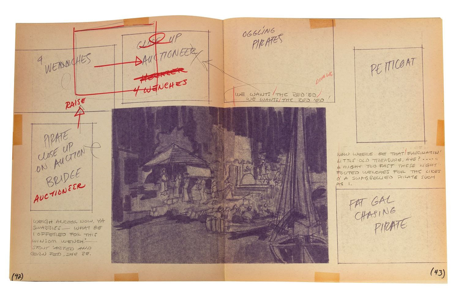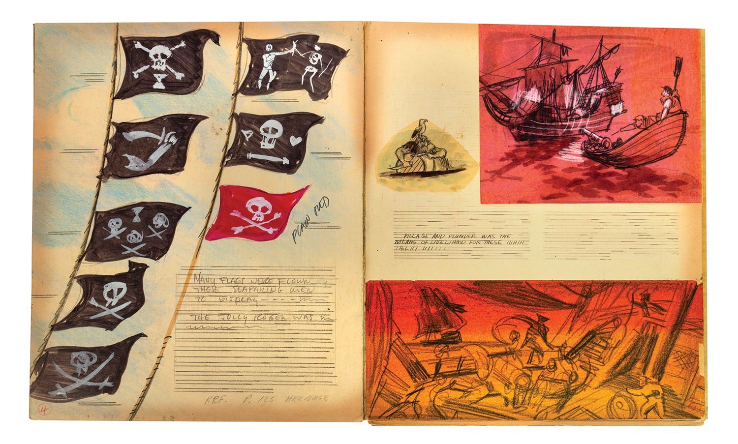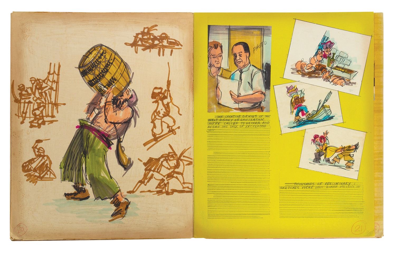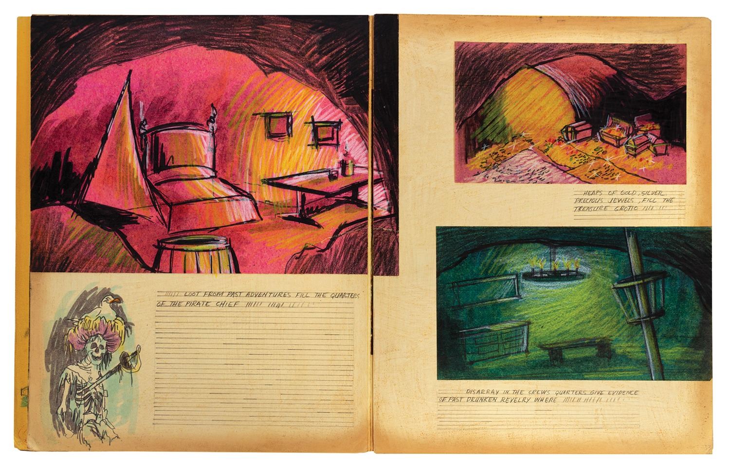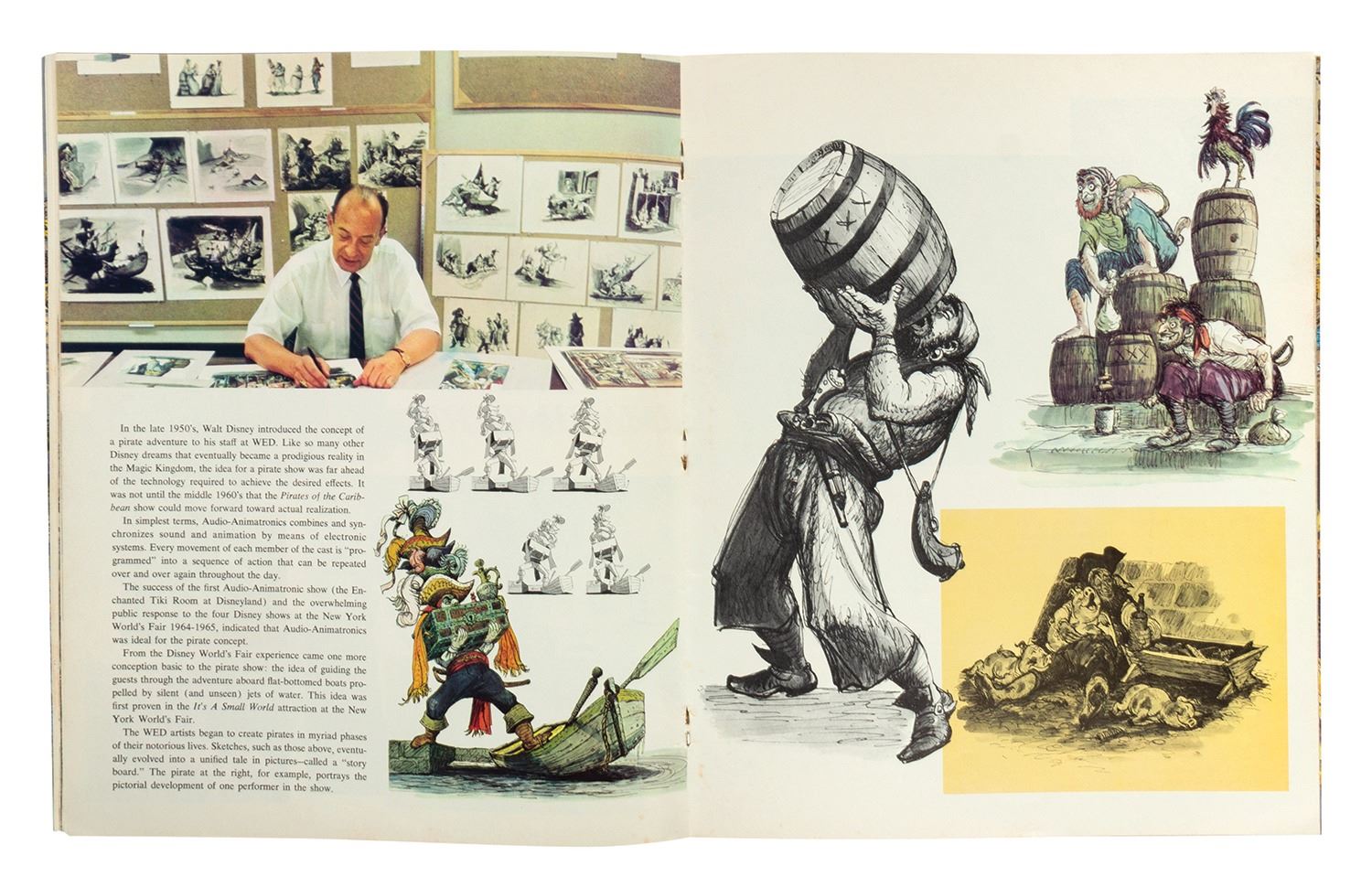 (Disneyland, c.1967) A one-of-a-kind hand-drawn mock-up for the Pirates of the Caribbean guidebook. The Pirates guidebook is one of the most well-known Disneyland souvenir books, and tells the story and background of this fan-favorite attraction through gorgeous photos and concept artwork. This mock-up contains (46) pages of hand-drawn artwork, attributed to Imagineer Ken Chapman, based on the designs of Imagineer Marc Davis. The mock-up is full of hand-written placeholder text next to the artwork, as well as editing notes throughout by Imagineer Marty Sklar. Each page is an individual sheet that is glued together by hand to form the complete book, and many pages have hand-trimmed and applied original artwork with notes, forming an indepth look into how this souvenir guidebook came to be. The entire attraction story is retold here, including re-drawn illustrations based on some of Davis' most popular concept artwork, such as the dog holding the jail key, the pirate auctioneer, the pirate on a cannon, and the pirate's skeletal remains. Original Pirates of the Caribbean artwork is some of the most prized original Disneyland artwork, with a hand-drawn mock-up of the entire attraction experience being an unheard of archive of Pirates of the Caribbean history. Additionally, Sklar's hand-written notes throughout make this not just a testament to the attraction itself, but to the Imagineering process that brought us some of the park's most iconic attractions. Included with this mock-up is an earlier 26-page brownline draft for a portion of the book which has segments of hand-written text and additional notes throughout by Sklar. Also, a final version of the completed guidebook is included. The mock-up measures 11"x9", and is in good condition overall, with some chipping and small tears around the edges and to the spine of the cover from use. Many of the inner pages are loose from the spine, but the mock-up is complete.