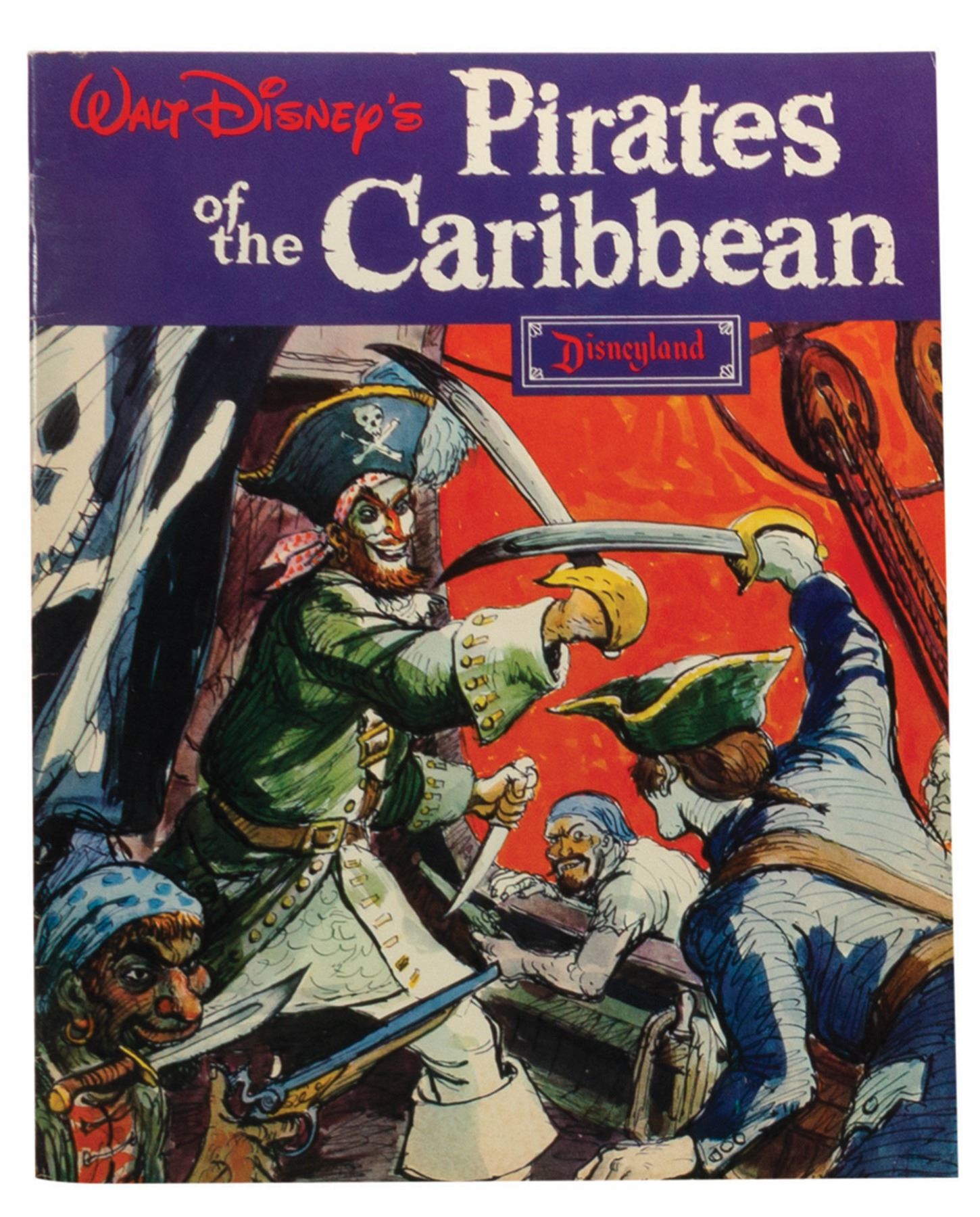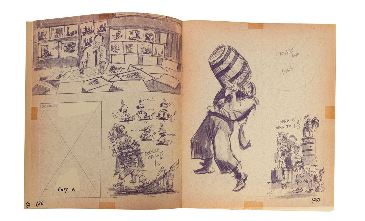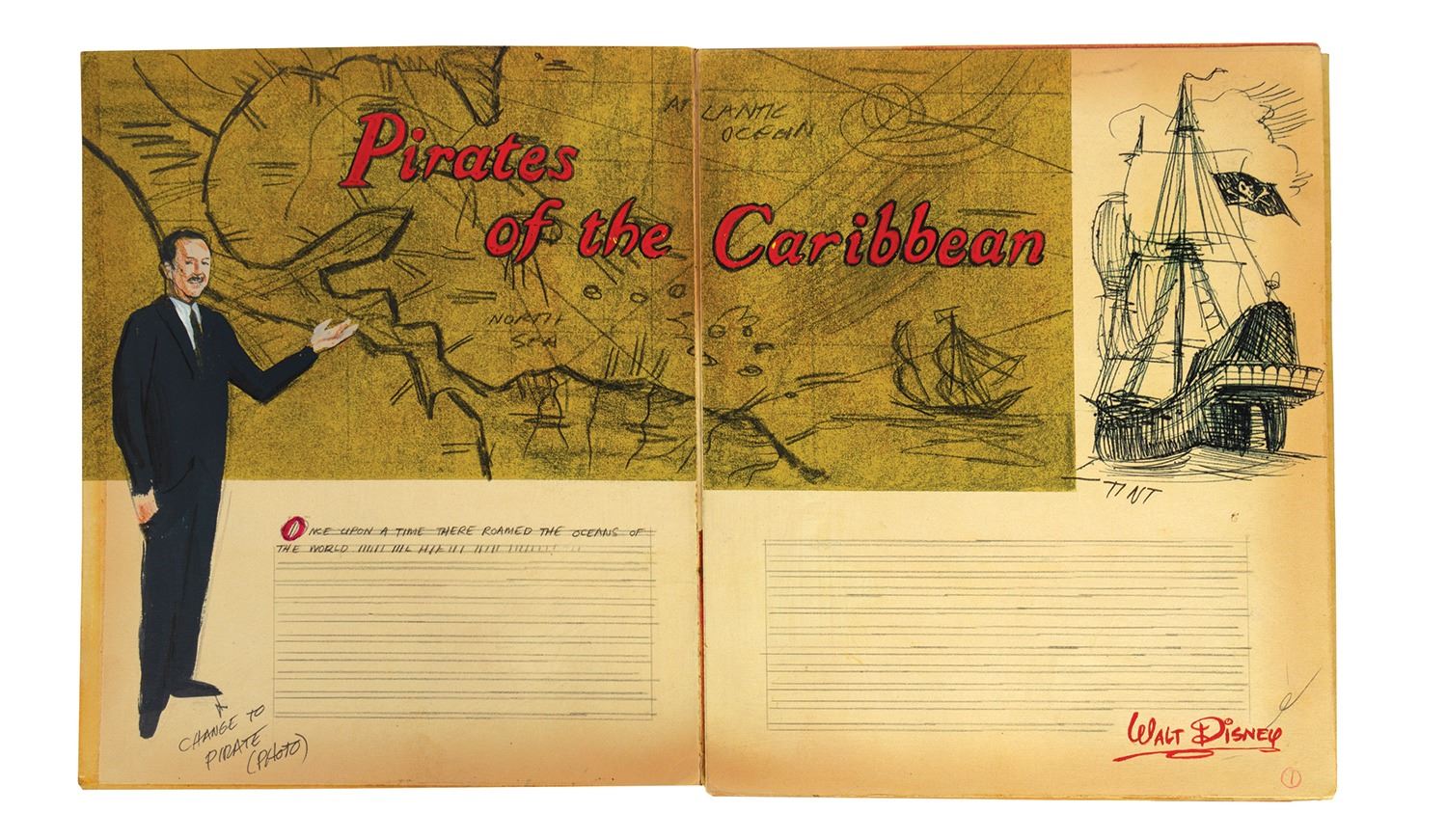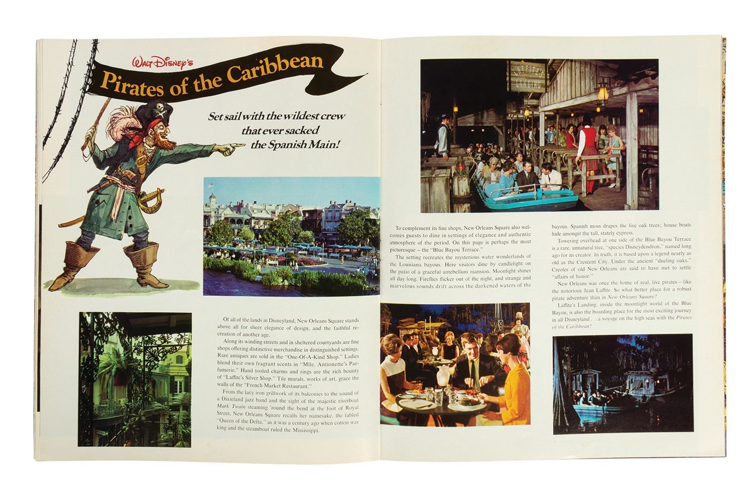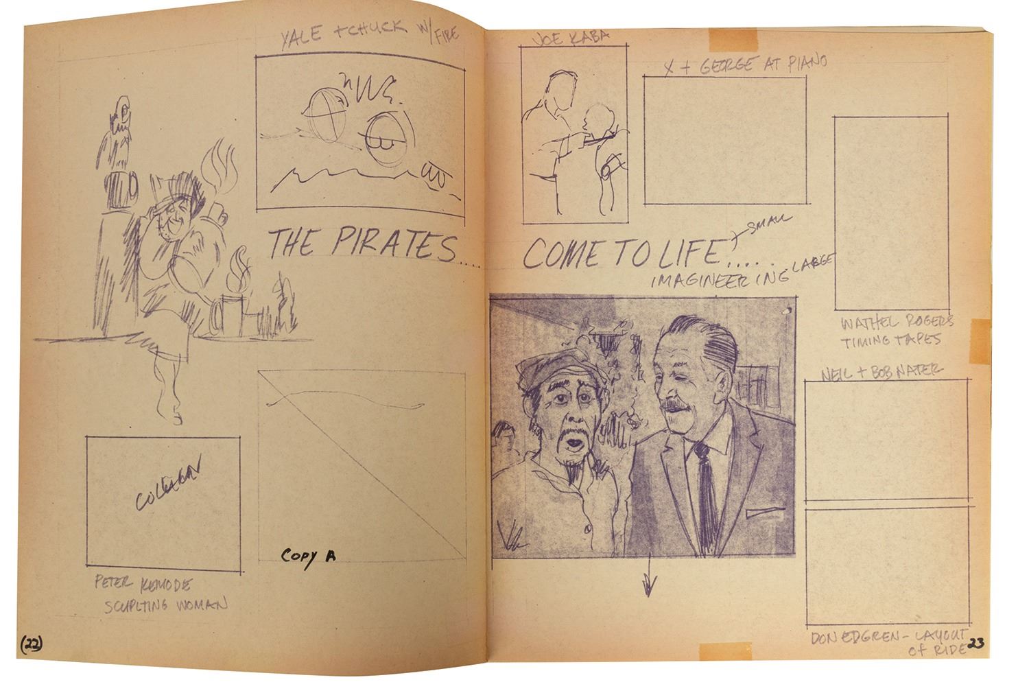 (Disneyland, c.1967) A one-of-a-kind hand-drawn mock-up for the Pirates of the Caribbean guidebook. The Pirates guidebook is one of the most well-known Disneyland souvenir books, and tells the story and background of this fan-favorite attraction through gorgeous photos and concept artwork. This mock-up contains (46) pages of hand-drawn artwork, attributed to Imagineer Ken Chapman, based on the designs of Imagineer Marc Davis. The mock-up is full of hand-written placeholder text next to the artwork, as well as editing notes throughout by Imagineer Marty Sklar. Each page is an individual sheet that is glued together by hand to form the complete book, and many pages have hand-trimmed and applied original artwork with notes, forming an indepth look into how this souvenir guidebook came to be. The entire attraction story is retold here, including re-drawn illustrations based on some of Davis' most popular concept artwork, such as the dog holding the jail key, the pirate auctioneer, the pirate on a cannon, and the pirate's skeletal remains. Original Pirates of the Caribbean artwork is some of the most prized original Disneyland artwork, with a hand-drawn mock-up of the entire attraction experience being an unheard of archive of Pirates of the Caribbean history. Additionally, Sklar's hand-written notes throughout make this not just a testament to the attraction itself, but to the Imagineering process that brought us some of the park's most iconic attractions. Included with this mock-up is an earlier 26-page brownline draft for a portion of the book which has segments of hand-written text and additional notes throughout by Sklar. Also, a final version of the completed guidebook is included. The mock-up measures 11"x9", and is in good condition overall, with some chipping and small tears around the edges and to the spine of the cover from use. Many of the inner pages are loose from the spine, but the mock-up is complete.
