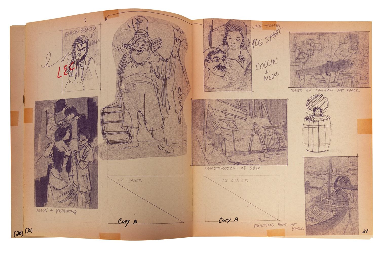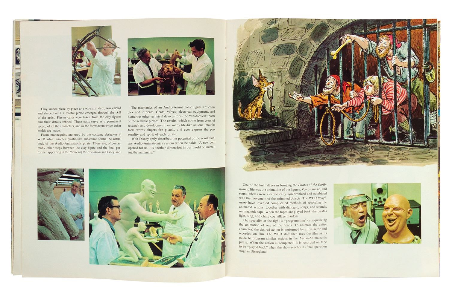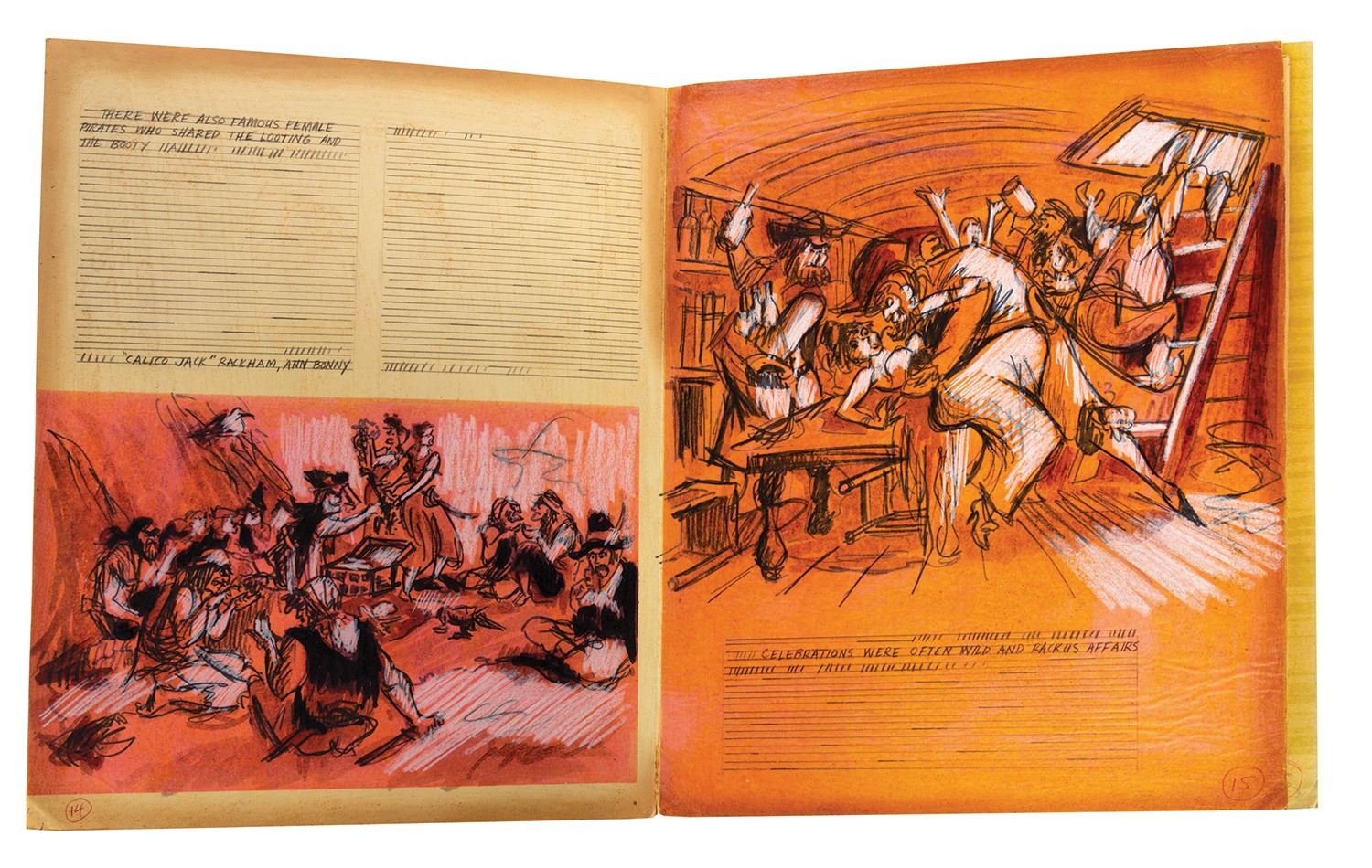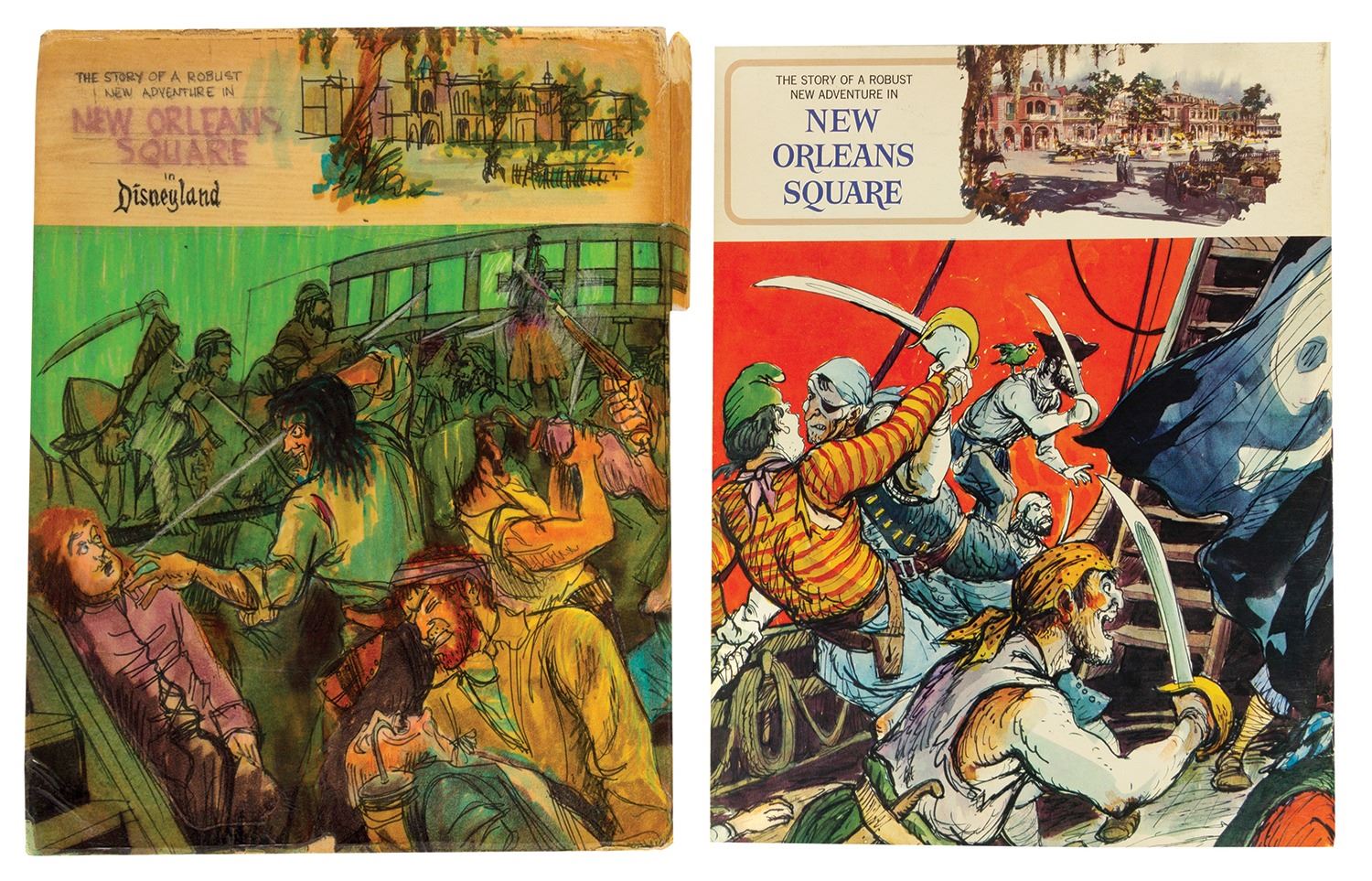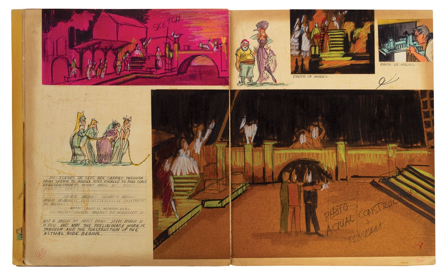 (Disneyland, c.1967) A one-of-a-kind hand-drawn mock-up for the Pirates of the Caribbean guidebook. The Pirates guidebook is one of the most well-known Disneyland souvenir books, and tells the story and background of this fan-favorite attraction through gorgeous photos and concept artwork. This mock-up contains (46) pages of hand-drawn artwork, attributed to Imagineer Ken Chapman, based on the designs of Imagineer Marc Davis. The mock-up is full of hand-written placeholder text next to the artwork, as well as editing notes throughout by Imagineer Marty Sklar. Each page is an individual sheet that is glued together by hand to form the complete book, and many pages have hand-trimmed and applied original artwork with notes, forming an indepth look into how this souvenir guidebook came to be. The entire attraction story is retold here, including re-drawn illustrations based on some of Davis' most popular concept artwork, such as the dog holding the jail key, the pirate auctioneer, the pirate on a cannon, and the pirate's skeletal remains. Original Pirates of the Caribbean artwork is some of the most prized original Disneyland artwork, with a hand-drawn mock-up of the entire attraction experience being an unheard of archive of Pirates of the Caribbean history. Additionally, Sklar's hand-written notes throughout make this not just a testament to the attraction itself, but to the Imagineering process that brought us some of the park's most iconic attractions. Included with this mock-up is an earlier 26-page brownline draft for a portion of the book which has segments of hand-written text and additional notes throughout by Sklar. Also, a final version of the completed guidebook is included. The mock-up measures 11"x9", and is in good condition overall, with some chipping and small tears around the edges and to the spine of the cover from use. Many of the inner pages are loose from the spine, but the mock-up is complete.