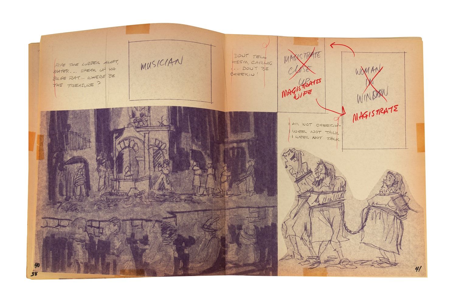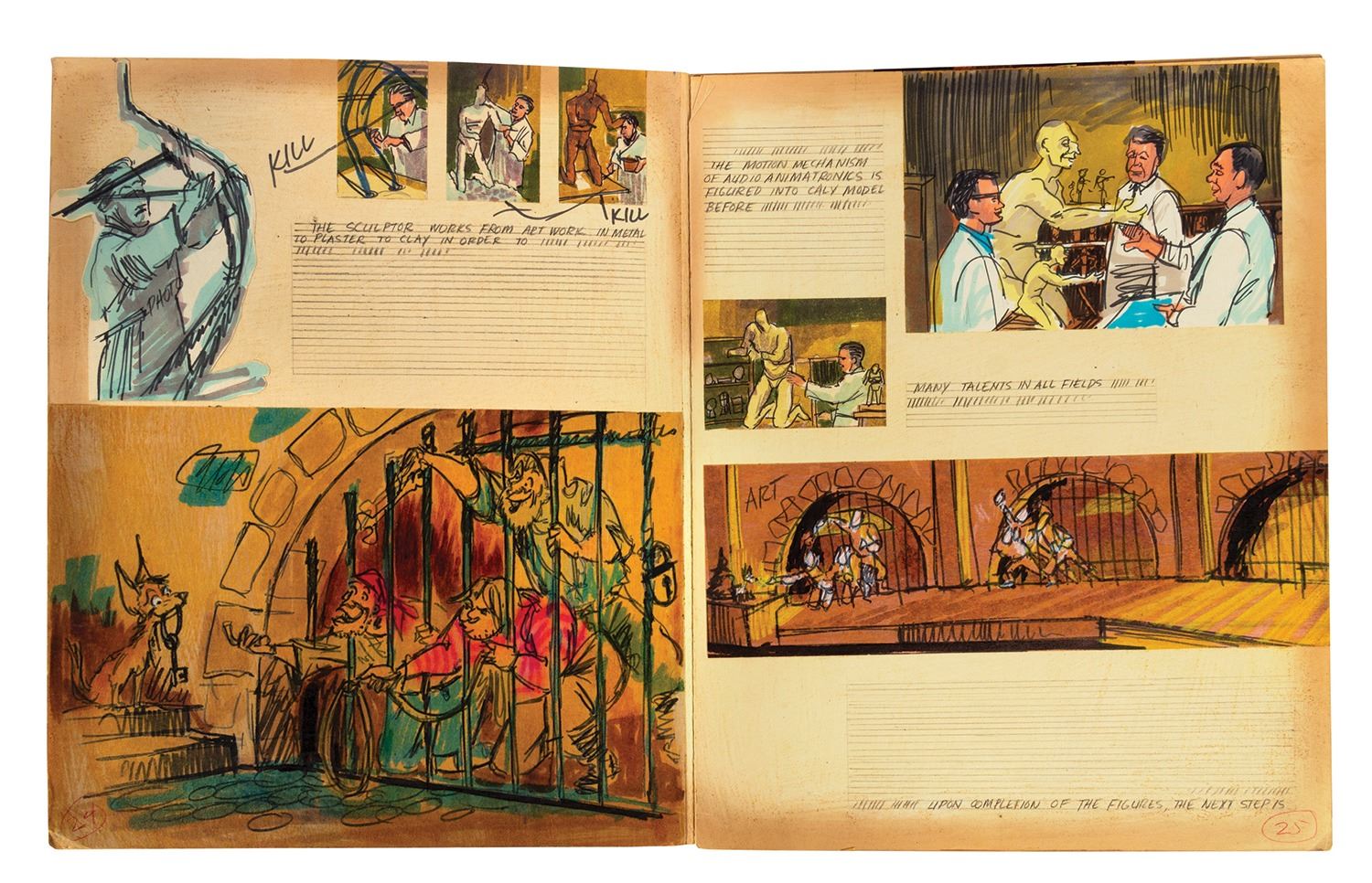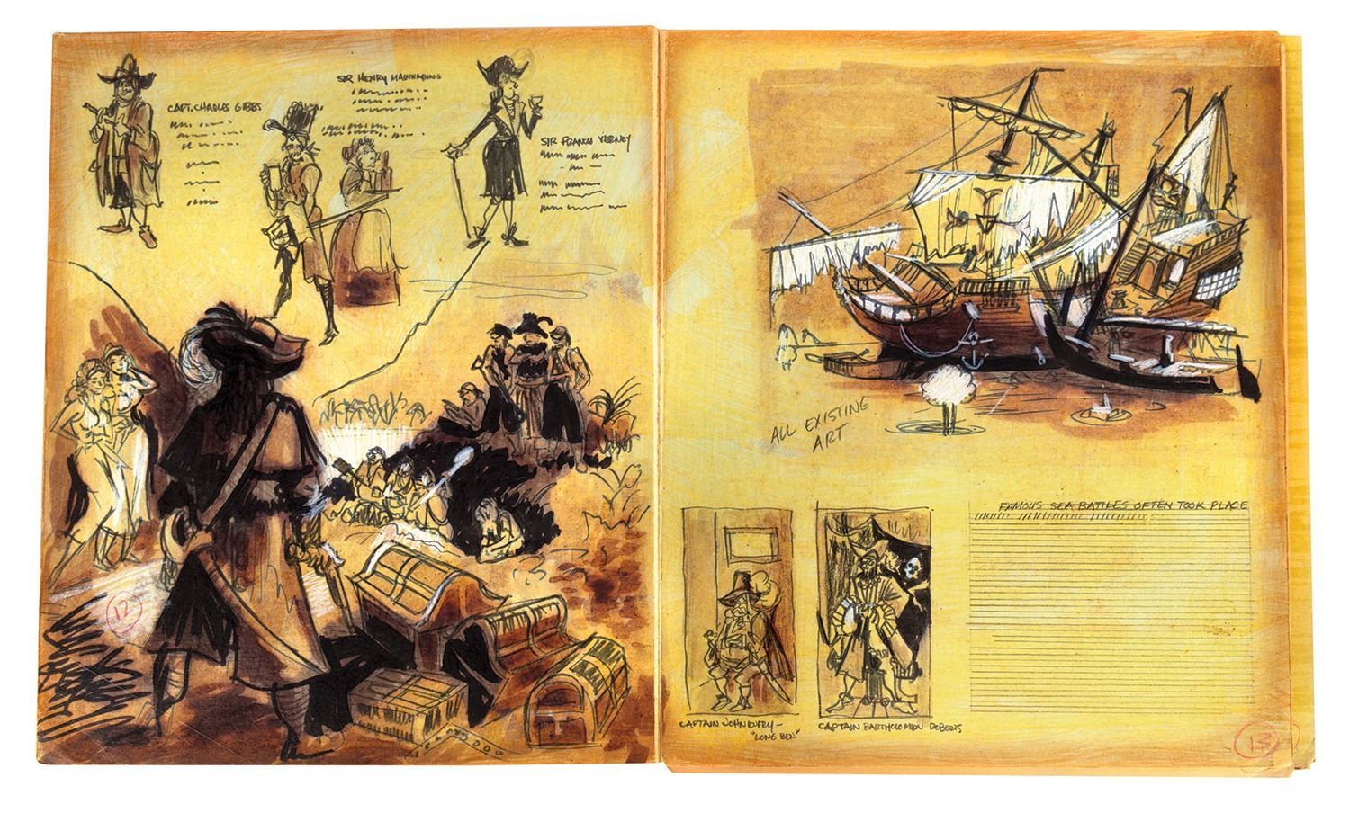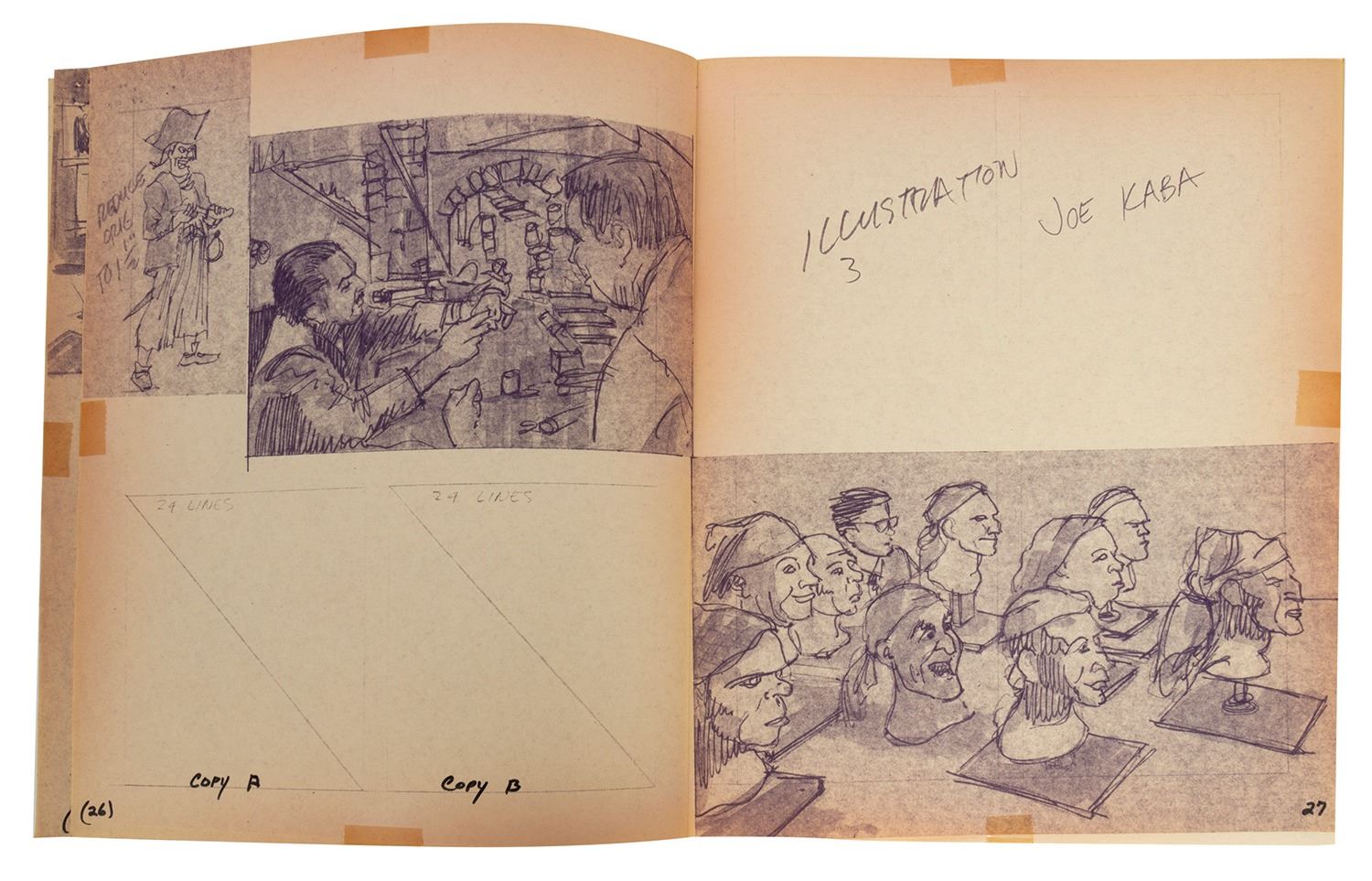 (Disneyland, c.1967) A one-of-a-kind hand-drawn mock-up for the Pirates of the Caribbean guidebook. The Pirates guidebook is one of the most well-known Disneyland souvenir books, and tells the story and background of this fan-favorite attraction through gorgeous photos and concept artwork. This mock-up contains (46) pages of hand-drawn artwork, attributed to Imagineer Ken Chapman, based on the designs of Imagineer Marc Davis. The mock-up is full of hand-written placeholder text next to the artwork, as well as editing notes throughout by Imagineer Marty Sklar. Each page is an individual sheet that is glued together by hand to form the complete book, and many pages have hand-trimmed and applied original artwork with notes, forming an indepth look into how this souvenir guidebook came to be. The entire attraction story is retold here, including re-drawn illustrations based on some of Davis' most popular concept artwork, such as the dog holding the jail key, the pirate auctioneer, the pirate on a cannon, and the pirate's skeletal remains. Original Pirates of the Caribbean artwork is some of the most prized original Disneyland artwork, with a hand-drawn mock-up of the entire attraction experience being an unheard of archive of Pirates of the Caribbean history. Additionally, Sklar's hand-written notes throughout make this not just a testament to the attraction itself, but to the Imagineering process that brought us some of the park's most iconic attractions. Included with this mock-up is an earlier 26-page brownline draft for a portion of the book which has segments of hand-written text and additional notes throughout by Sklar. Also, a final version of the completed guidebook is included. The mock-up measures 11"x9", and is in good condition overall, with some chipping and small tears around the edges and to the spine of the cover from use. Many of the inner pages are loose from the spine, but the mock-up is complete.