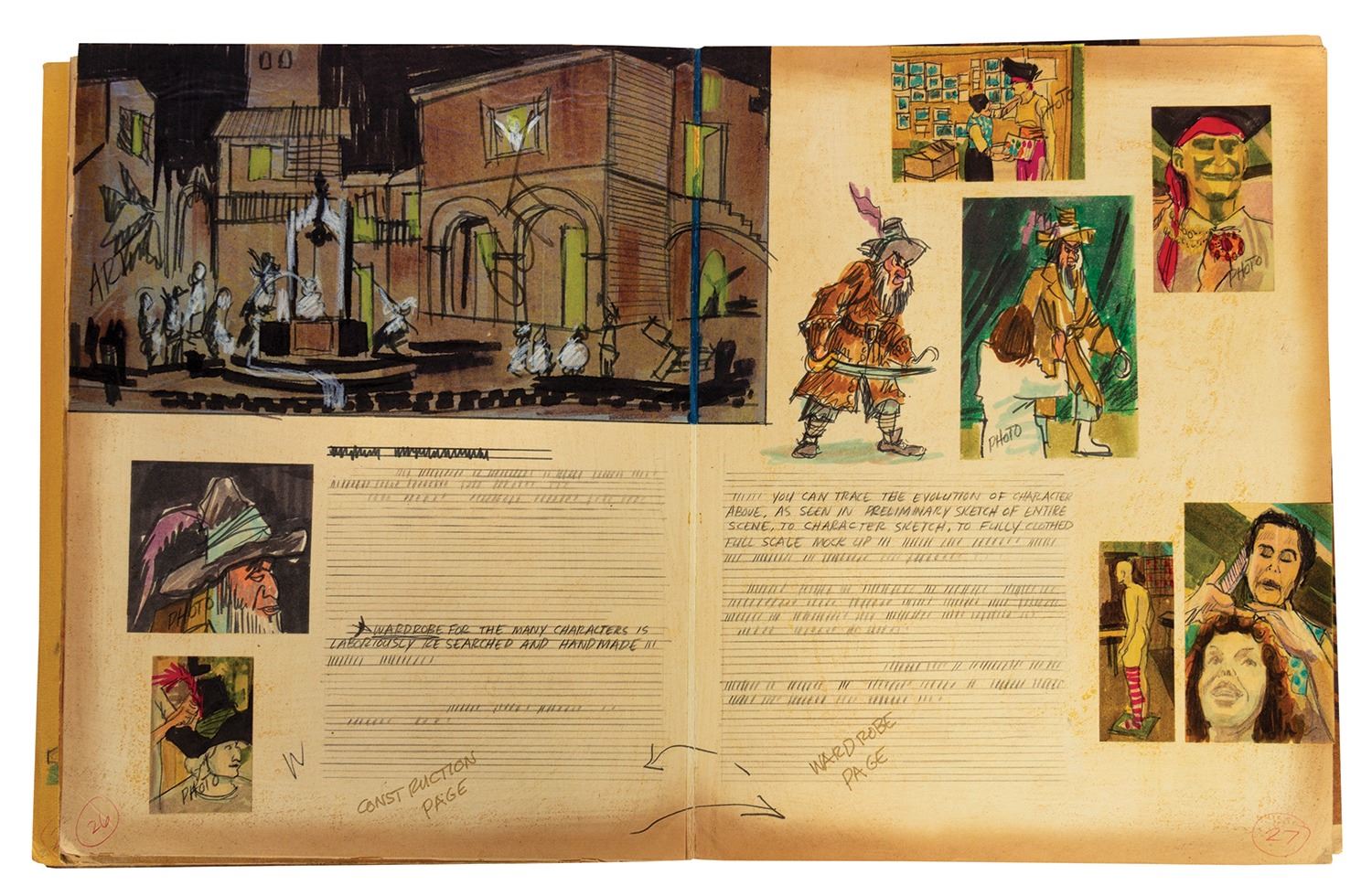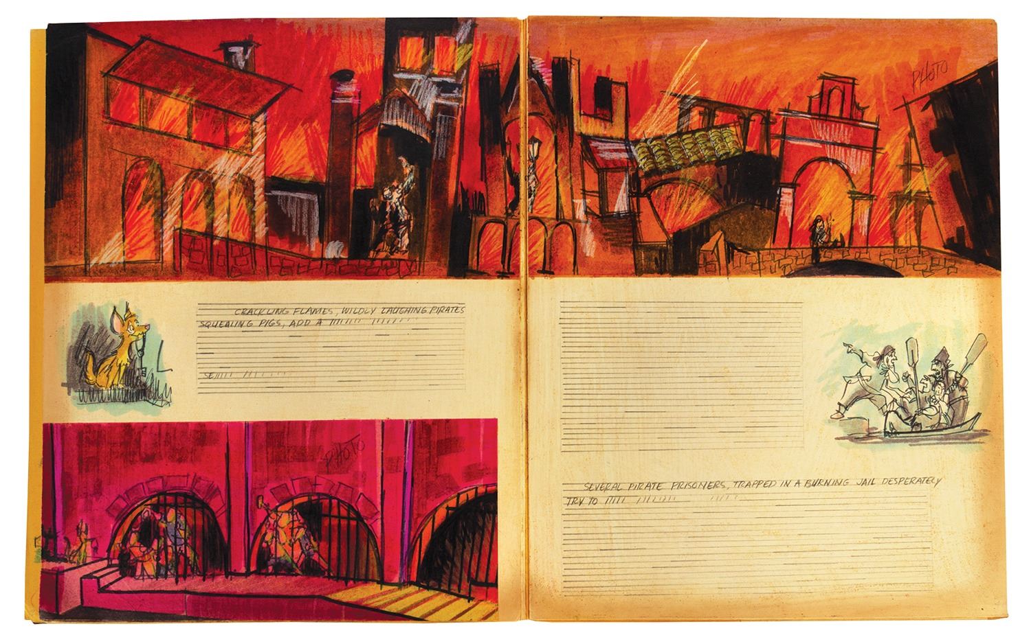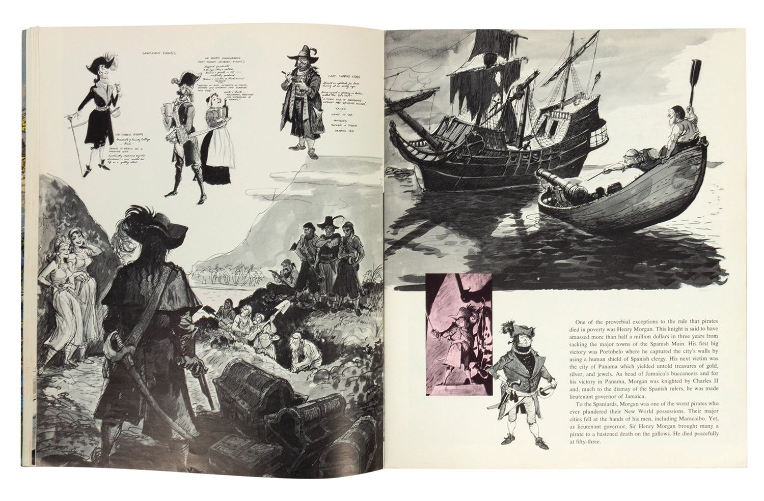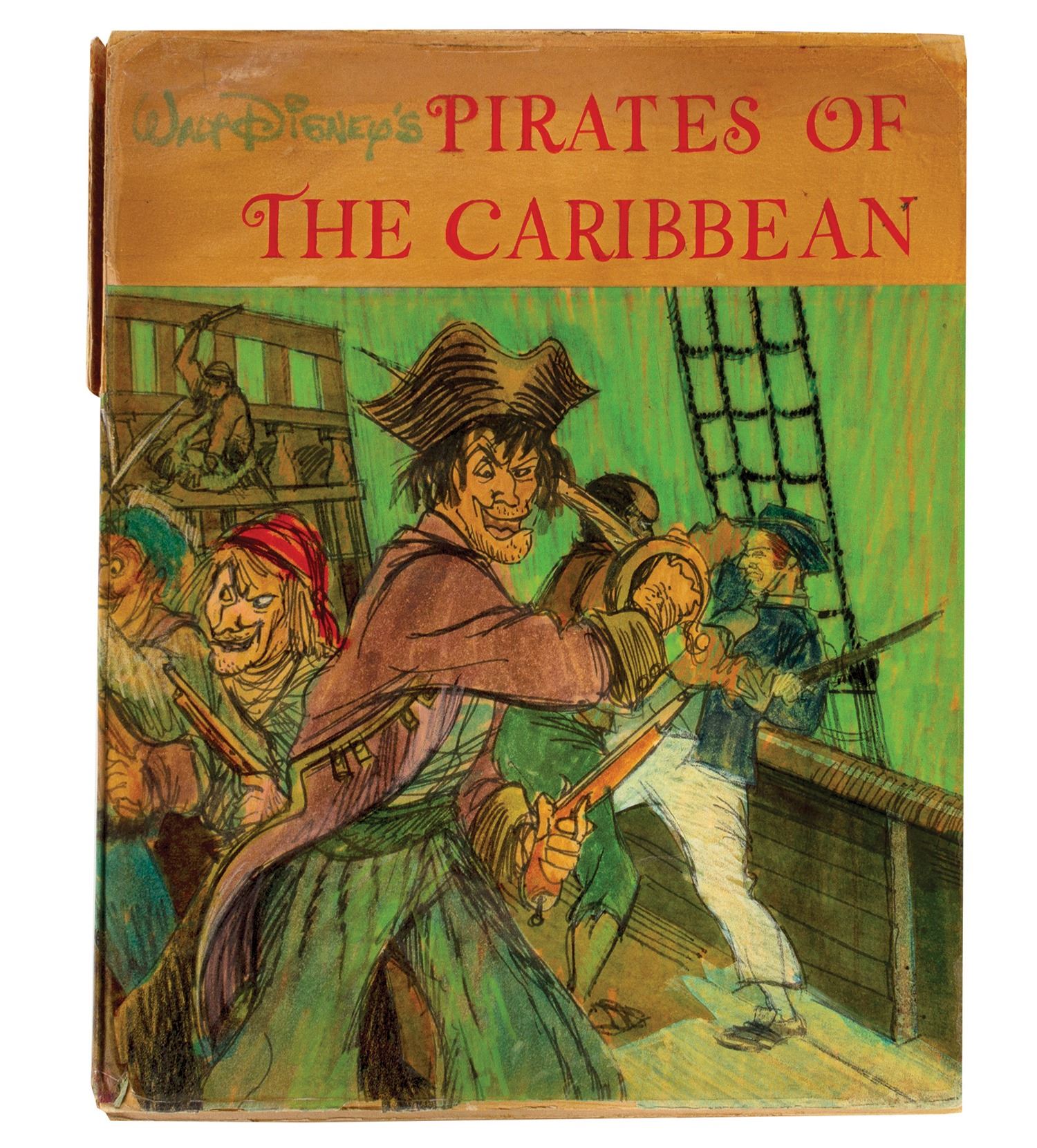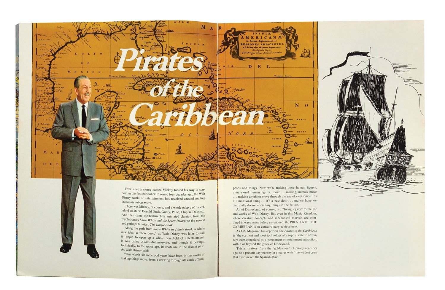 (Disneyland, c.1967) A one-of-a-kind hand-drawn mock-up for the Pirates of the Caribbean guidebook. The Pirates guidebook is one of the most well-known Disneyland souvenir books, and tells the story and background of this fan-favorite attraction through gorgeous photos and concept artwork. This mock-up contains (46) pages of hand-drawn artwork, attributed to Imagineer Ken Chapman, based on the designs of Imagineer Marc Davis. The mock-up is full of hand-written placeholder text next to the artwork, as well as editing notes throughout by Imagineer Marty Sklar. Each page is an individual sheet that is glued together by hand to form the complete book, and many pages have hand-trimmed and applied original artwork with notes, forming an indepth look into how this souvenir guidebook came to be. The entire attraction story is retold here, including re-drawn illustrations based on some of Davis' most popular concept artwork, such as the dog holding the jail key, the pirate auctioneer, the pirate on a cannon, and the pirate's skeletal remains. Original Pirates of the Caribbean artwork is some of the most prized original Disneyland artwork, with a hand-drawn mock-up of the entire attraction experience being an unheard of archive of Pirates of the Caribbean history. Additionally, Sklar's hand-written notes throughout make this not just a testament to the attraction itself, but to the Imagineering process that brought us some of the park's most iconic attractions. Included with this mock-up is an earlier 26-page brownline draft for a portion of the book which has segments of hand-written text and additional notes throughout by Sklar. Also, a final version of the completed guidebook is included. The mock-up measures 11"x9", and is in good condition overall, with some chipping and small tears around the edges and to the spine of the cover from use. Many of the inner pages are loose from the spine, but the mock-up is complete.