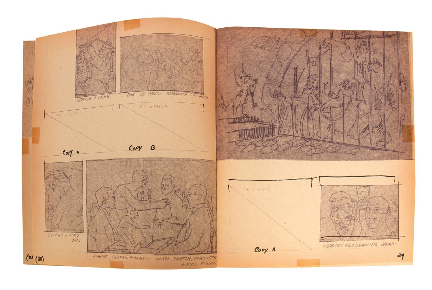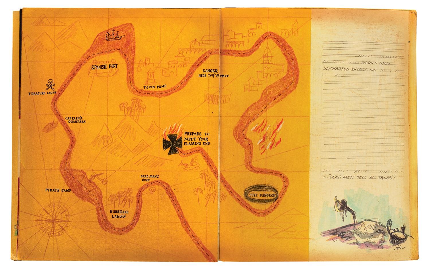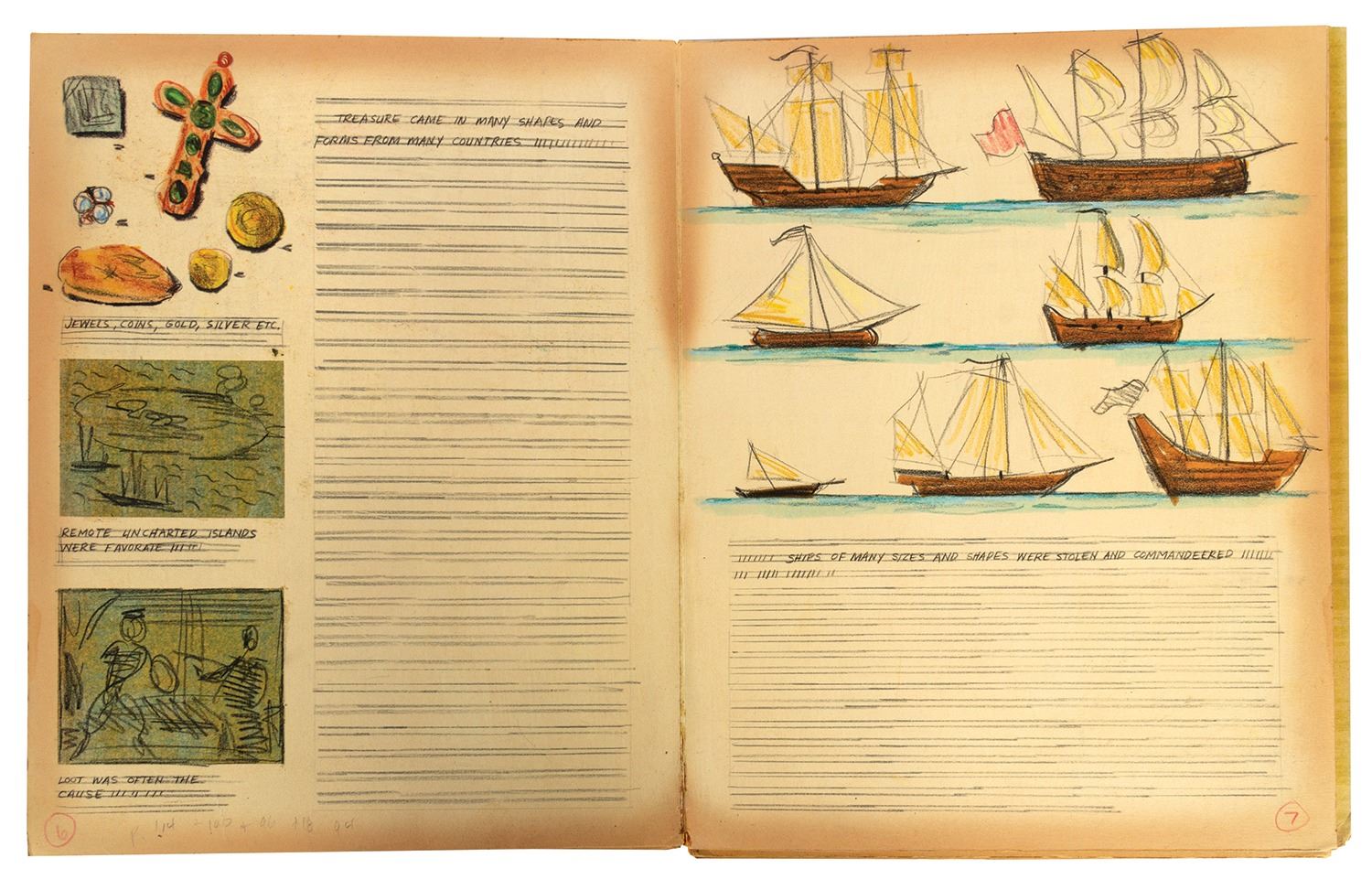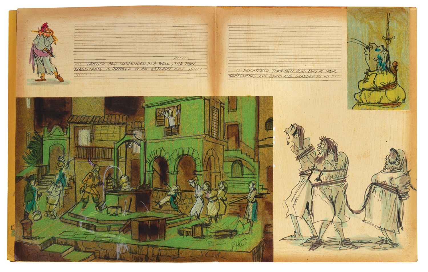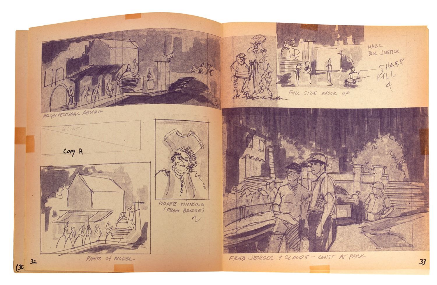 (Disneyland, c.1967) A one-of-a-kind hand-drawn mock-up for the Pirates of the Caribbean guidebook. The Pirates guidebook is one of the most well-known Disneyland souvenir books, and tells the story and background of this fan-favorite attraction through gorgeous photos and concept artwork. This mock-up contains (46) pages of hand-drawn artwork, attributed to Imagineer Ken Chapman, based on the designs of Imagineer Marc Davis. The mock-up is full of hand-written placeholder text next to the artwork, as well as editing notes throughout by Imagineer Marty Sklar. Each page is an individual sheet that is glued together by hand to form the complete book, and many pages have hand-trimmed and applied original artwork with notes, forming an indepth look into how this souvenir guidebook came to be. The entire attraction story is retold here, including re-drawn illustrations based on some of Davis' most popular concept artwork, such as the dog holding the jail key, the pirate auctioneer, the pirate on a cannon, and the pirate's skeletal remains. Original Pirates of the Caribbean artwork is some of the most prized original Disneyland artwork, with a hand-drawn mock-up of the entire attraction experience being an unheard of archive of Pirates of the Caribbean history. Additionally, Sklar's hand-written notes throughout make this not just a testament to the attraction itself, but to the Imagineering process that brought us some of the park's most iconic attractions. Included with this mock-up is an earlier 26-page brownline draft for a portion of the book which has segments of hand-written text and additional notes throughout by Sklar. Also, a final version of the completed guidebook is included. The mock-up measures 11"x9", and is in good condition overall, with some chipping and small tears around the edges and to the spine of the cover from use. Many of the inner pages are loose from the spine, but the mock-up is complete.