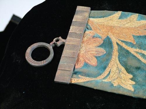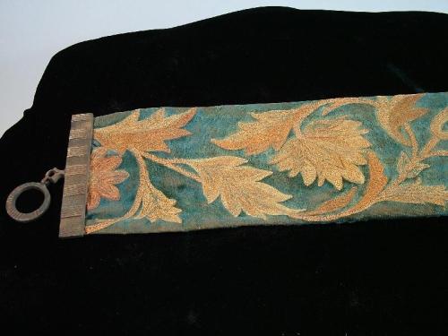 American (Early 19th Century) Floral motif embroidery in good condition, blue velvet is worn. Detailed stamped brass pulls on each end, 96" by 6".