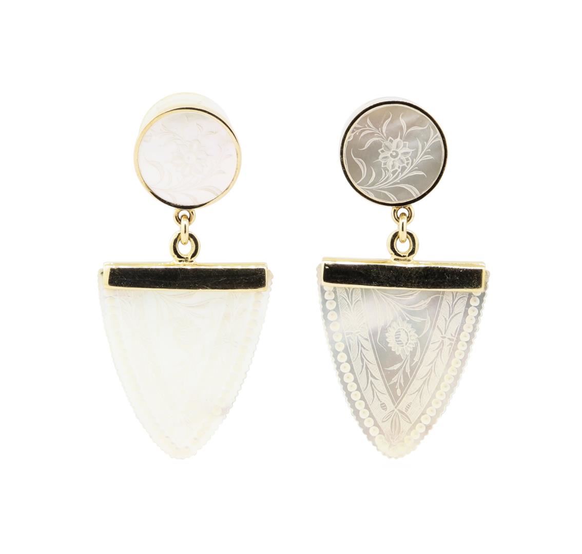 One pair of hand-engraved mother of pearl dangle earrings with a total drop of approximately 43 millimeters featuring: 14KT yellow gold weighing 7.3 grams featuring two pieces of circular hand-engraved mother of pearl and two shield shaped hand-engraved pieces of mother of pearl.