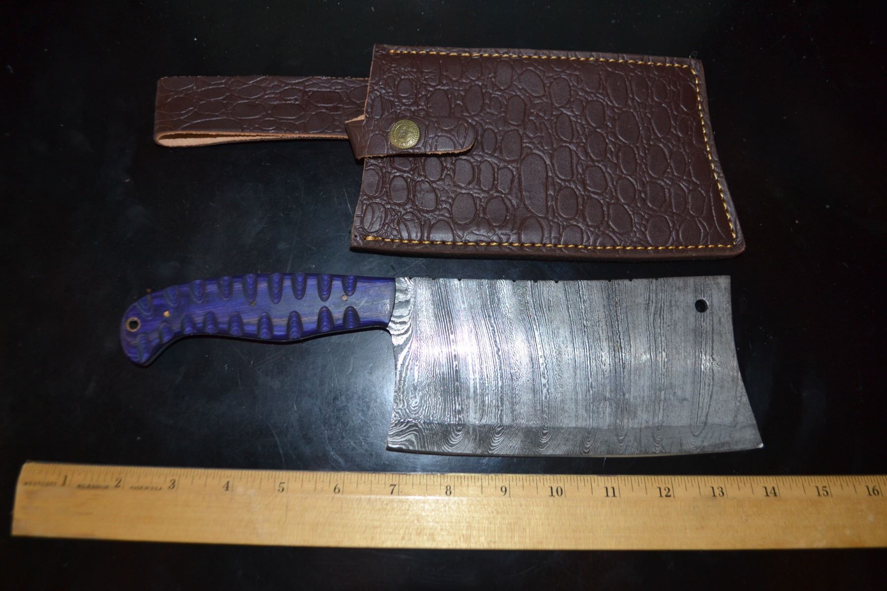 Hand Forged Damascus Steel Cleaver w/ Leather Sheath