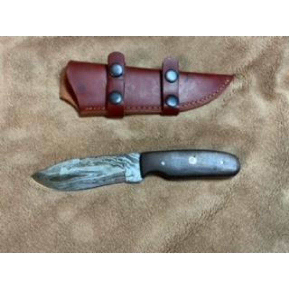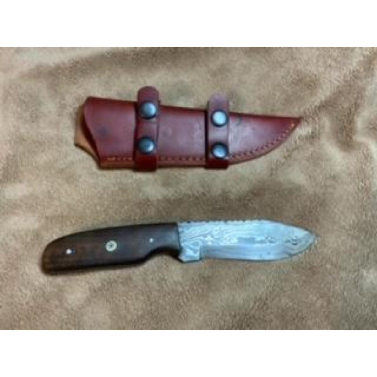 Hand forged Damascus steel field knife. 8" overall, length, full tang 4mm thickness. 4" blade features 1095 high carbon steel and 15N20 nickel carbon with 55-58 Rockwell hardness rating. Handle is walnut and comes with a leather sheath. A simple, timeless knife for any collection. Â