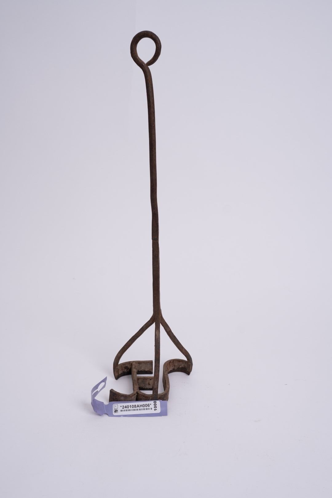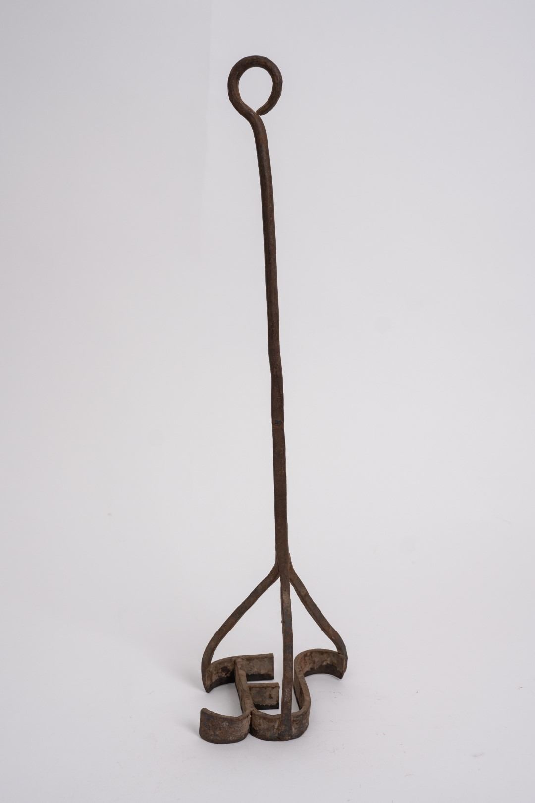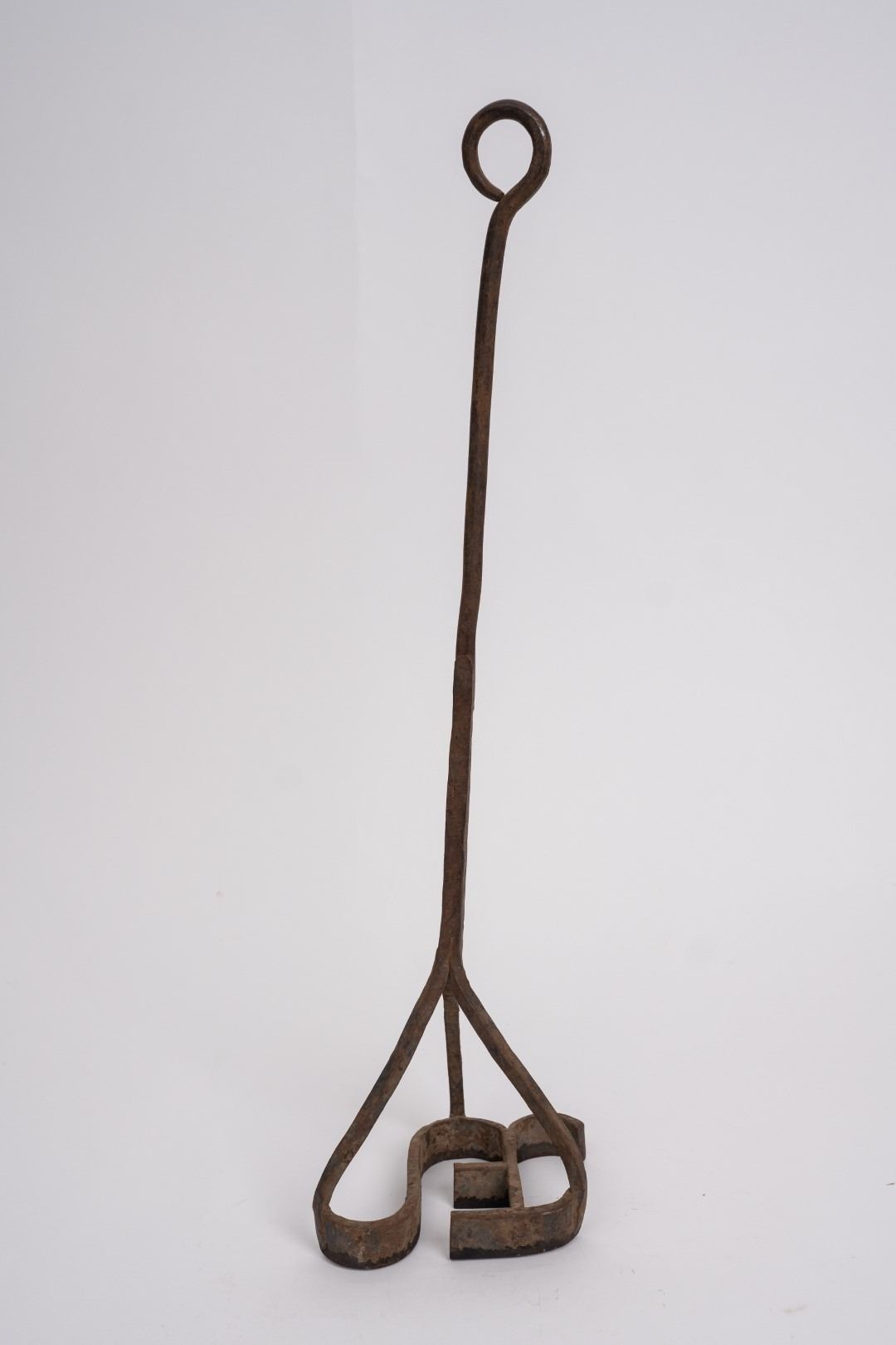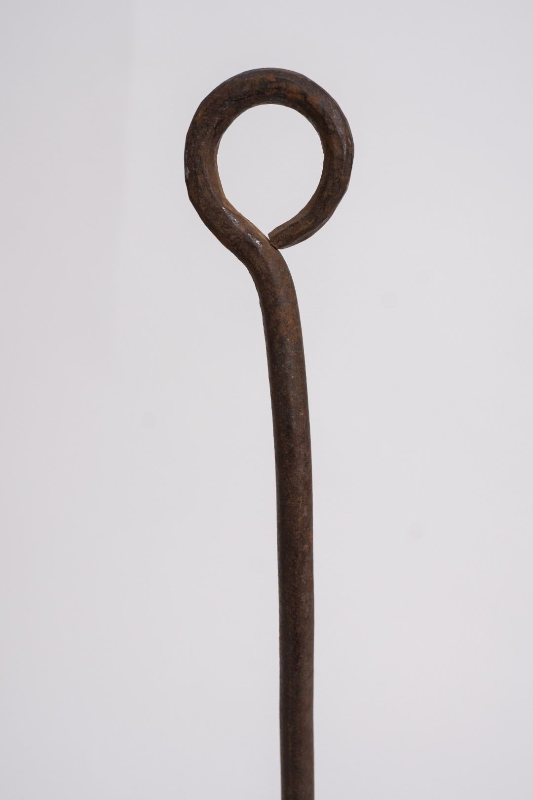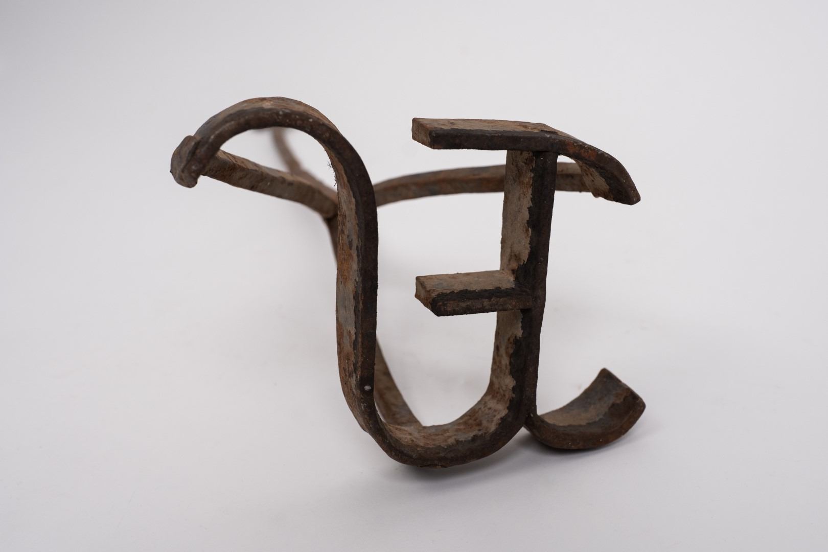 This hand forged cattle branding iron shows a 6" x 4" brand surface with 15" shaft. The brand head shows a F with right tumbling S. The metal shows scratches, scrapes, oxidation and the shaft is round to square slightly bent at the middle.