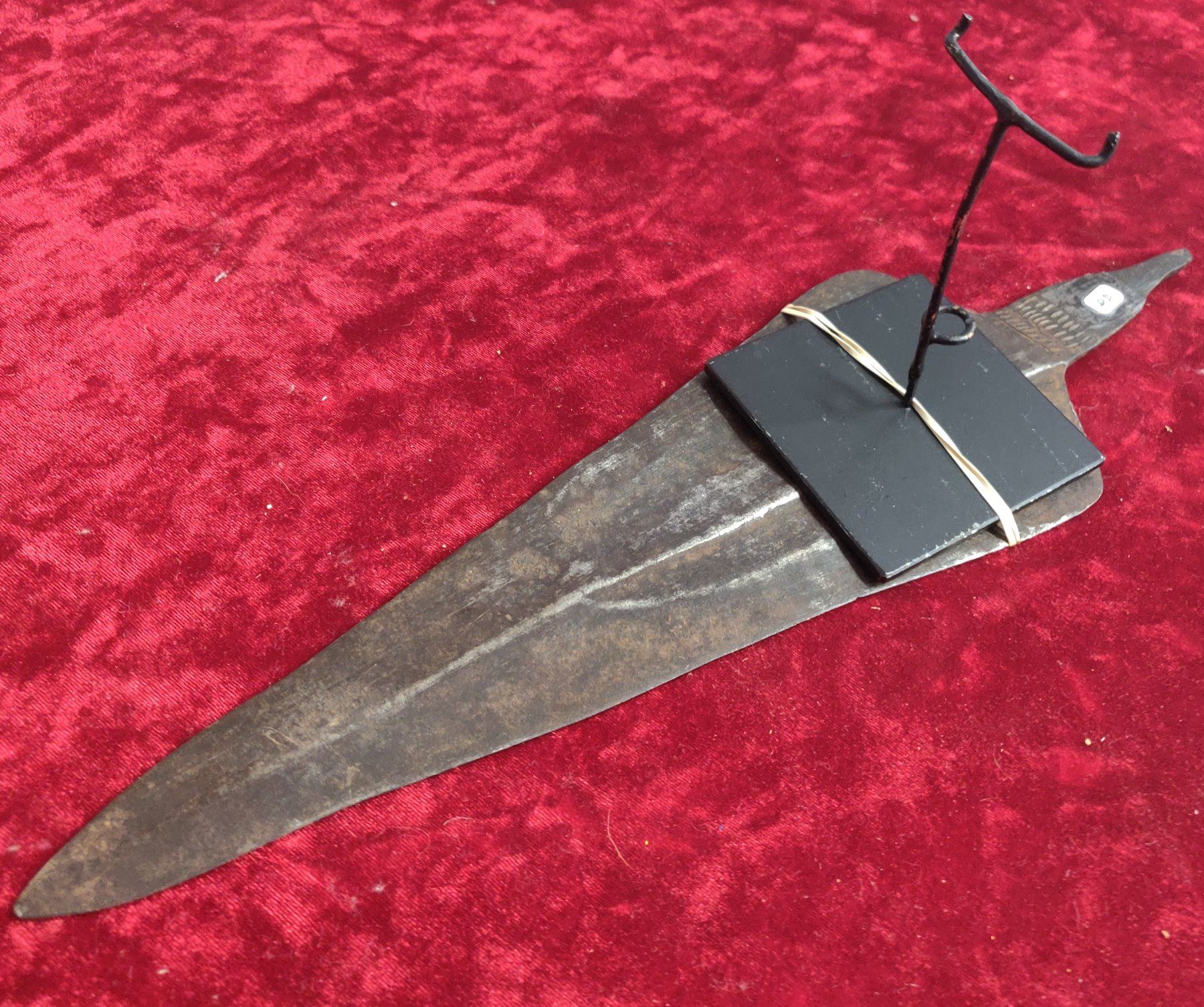 Hand Forged Metal Spear w/Stand, c. 1920s. Made of steel, the item measures 14" x 4". Africa. Condition: Rusty, see images. Shipping: $32.00 w/insurance and signature, due to size and weight.