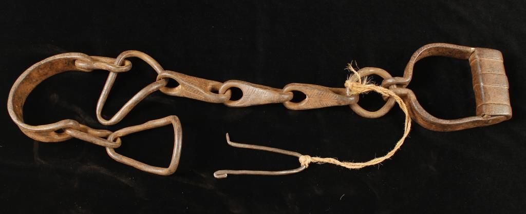 Metal shackles with simple design of straight lines on edges, perhaps to distinguish ownership. In overall good condition.