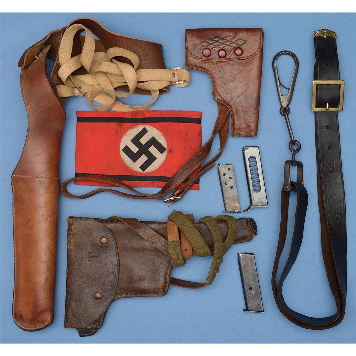 1) Three shoulder holsters one marked Bianchi X15. 2) Carbine belt with brass buckle and brass tip marked "ROCK ISLAND ARSENAL/39" and "COBB". 3) One Walther 9mm and two small caliber magazines. 4) Red cloth armband, with black ribbon accents and a black swastika. CONDITION: Fair overall.