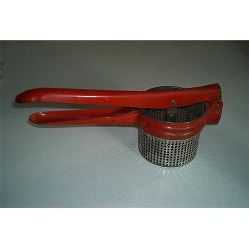 Featuring a metal, hand juicer/potatoe ricer/strainer. Measurements: 11 inches long; 4 1/2 inches high; 3 inches deep and diameter is 3 7/8 inches. The red paint is in excellent condition. c. 1950's.