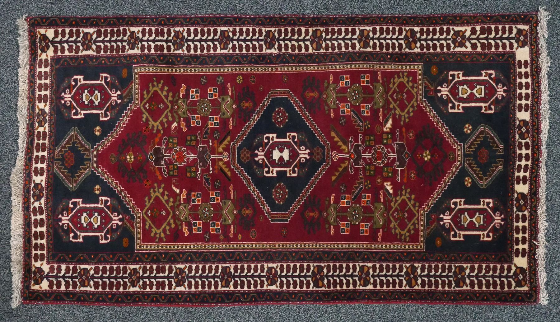 Hand knotted Kazak tribal wool rug. Wonderful rich earthy tones with geometric shapes. Field of reds, dark blue and cream. Short natural tassel. Approx. 80 kpsi. Like new condition, approx. 1/2" thick, 58" x 31".