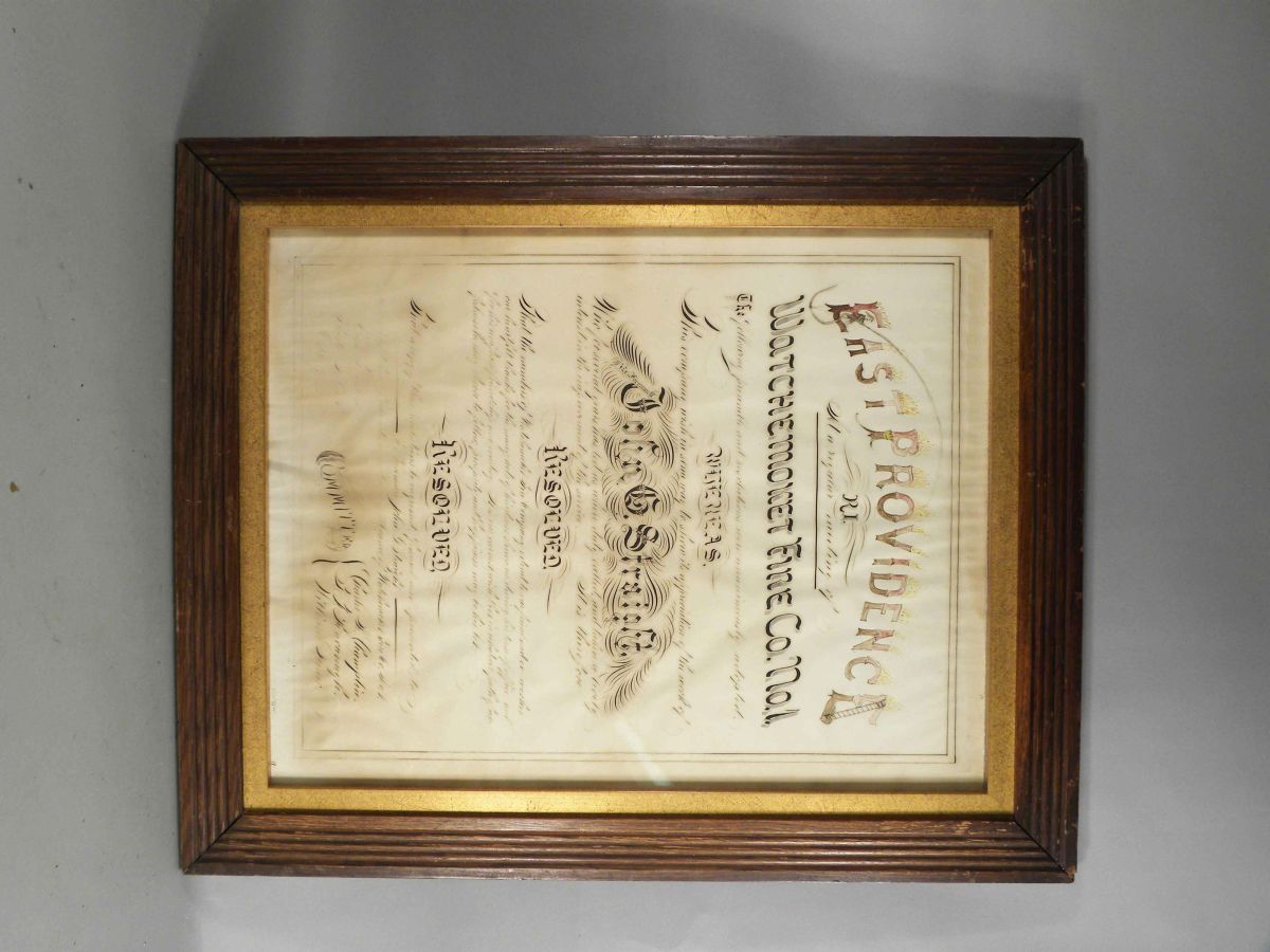 Hand Lettered Firemen's Certificate of Appreciation to John G. Straight Watchemoket Fire Company No. 1. Some fading otherwise good condition. Framed under glass. 18 X 22 inches.