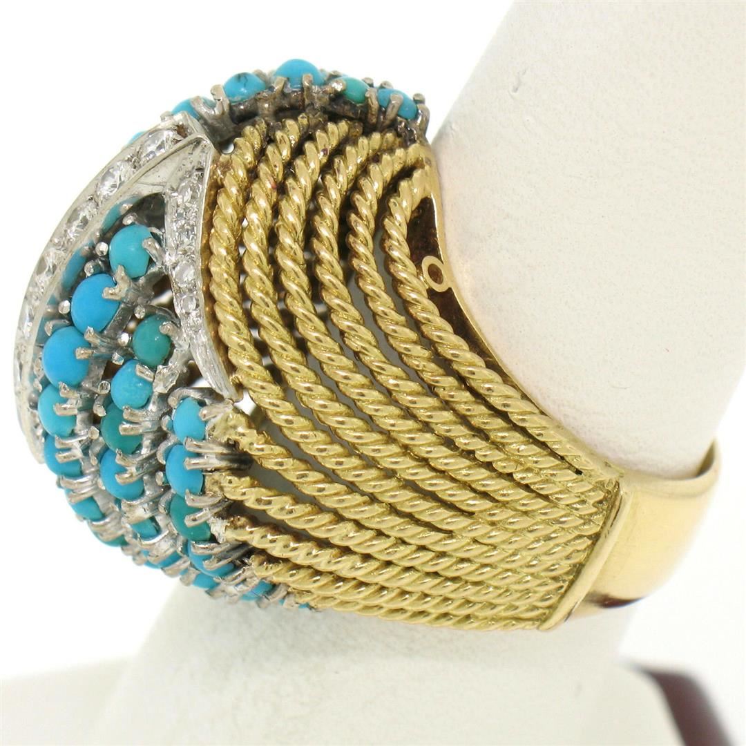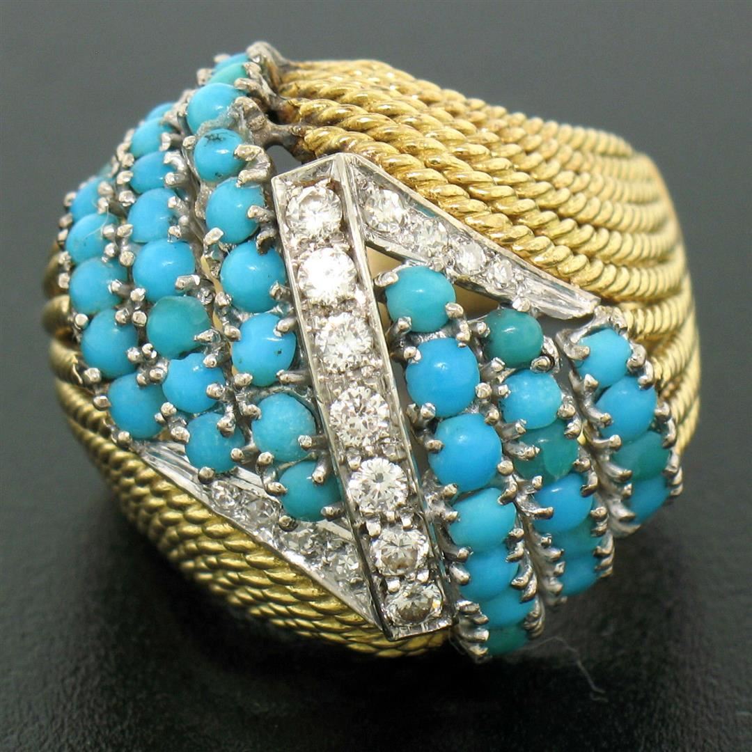 One Vintage Hand Made 18k TT Gold 2.60ctw Turquoise & Diamond Dome Cocktail Ring. Item Details: Material: 18K Solid Yellow and White Gold, Weight: 14.9 Grams, Stone(s): (7) Natural Genuine Diamonds (CENTER OF RING) - Round Brilliant Cut - Pavé Set - F Color - VS1 Clarity, (8) Natural Genuine Diamonds (DOWN SIDES) - Round Single Cut - Pavé Set - F Color - VS1 Clarity, (46) Natural Genuine Turquoise - Round Cabochon Cut - Prong Set - Naturally Varying Turquoise Colors - 2.3ctw (approx.), Total Carat Weight: 2.60 (approx.), Ring Size: 7.5 (We can custom size this ring.), Ring Width: 23.15mm Ring Height: 13.17mm rise off the finger Condition: Vintage ring w/ original patina. Excellent, ready to wear condition!