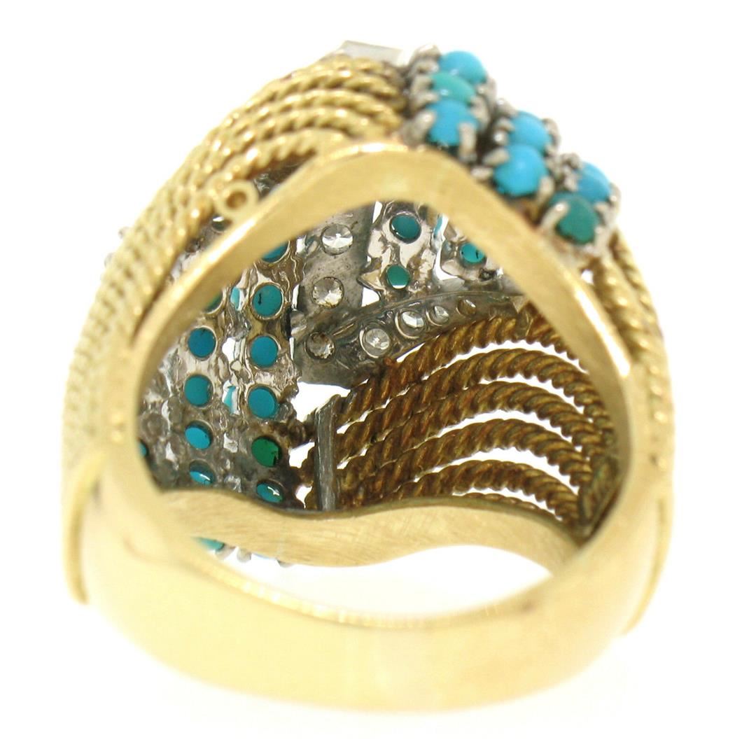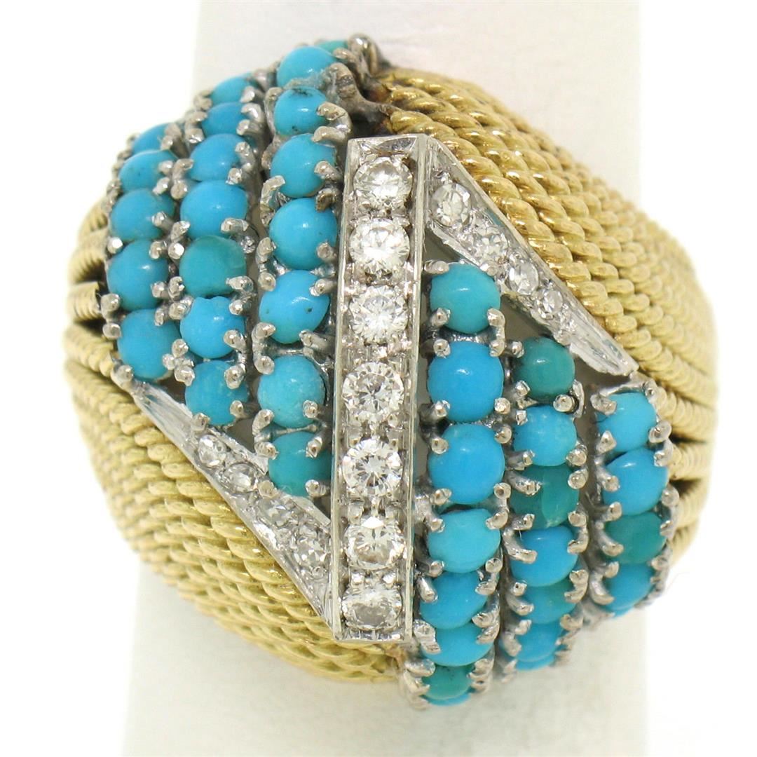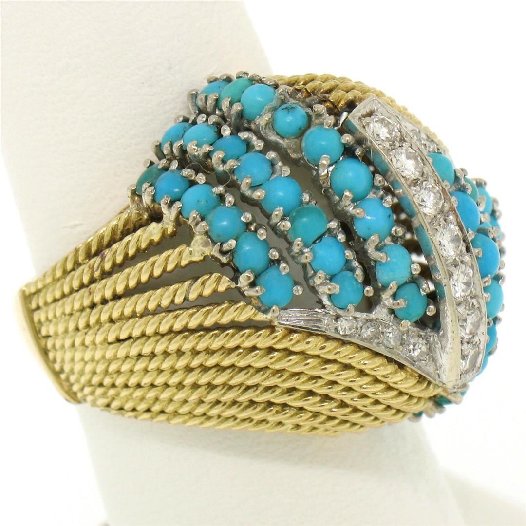 One Vintage Hand Made 18k TT Gold 2.60ctw Turquoise & Diamond Dome Cocktail Ring. Item Details: Material: 18K Solid Yellow and White Gold, Weight: 14.9 Grams, Stone(s): (7) Natural Genuine Diamonds (CENTER OF RING) - Round Brilliant Cut - Pavé Set - F Color - VS1 Clarity, (8) Natural Genuine Diamonds (DOWN SIDES) - Round Single Cut - Pavé Set - F Color - VS1 Clarity, (46) Natural Genuine Turquoise - Round Cabochon Cut - Prong Set - Naturally Varying Turquoise Colors - 2.3ctw (approx.), Total Carat Weight: 2.60 (approx.), Ring Size: 7.5 (We can custom size this ring.), Ring Width: 23.15mm Ring Height: 13.17mm rise off the finger Condition: Vintage ring w/ original patina. Excellent, ready to wear condition!
