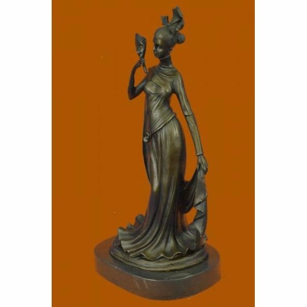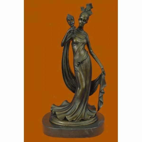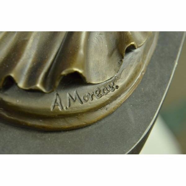 This unique sculpture of a 1920's woman is a beautiful piece for an exquisite living room or a young lady's bedroom. As she stands elegantly for her photo-shoot, who can forget to mention her unforgettable dress that drops all the way to the floor, while she holds a mask on her right hand. The details on her dress , are unbelievably carved leaving her picture perfected. This is a beautiful bronze sculpture cast using the "Lost Wax Method" and has a gorgeous brown patina. It is mounted on a marble base and is 100% bronze and handmade. This sculpture is signed A. Moreau. Condition : This sculpture is in perfect condition. Bronze Dimensions with Marble Base:Height 13.5" x Width 7" Marble Dimensions:Diameter 7 ". Height without base: 12.5" Weight : 9 LBS Inventory:57YRD12514745