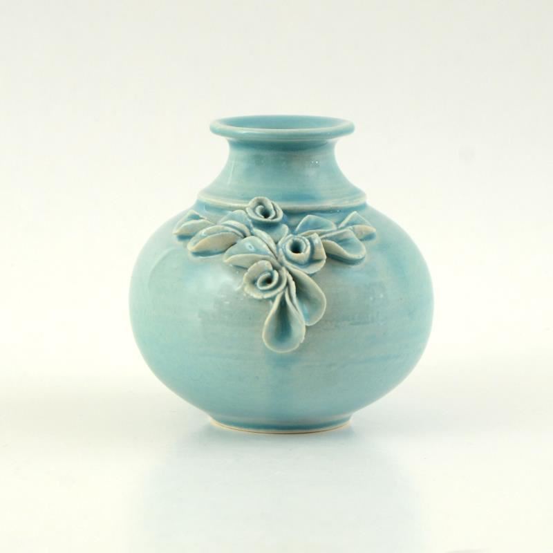 This is a hand made ceramic vase sculpture by noted folk artist Eugenijus Tamosiunas! Made with Lead-Free colors and glazes. Hand signed by the Artist. Measures approx. 3" (width) x 3" (height); 1" (opening).