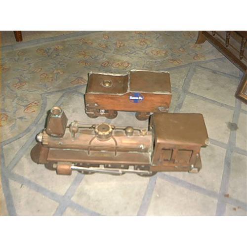 Hand Made Copper and Metal Trains set. All done with copper and metal and the wheels roll and it is a great decorative piece for any collection you may have. If you have or collect old train sets, then this is a must have for you. Very heavy and was bought at auction 65 years ago for $65.00. Everyone just loves the detail work on it. Simply a beauty and a great gift item to anyone who collects. The small one has a sticker saying Santa Fe and it is 21" L 8" H X 6" W. I have been in this business for 47 years and this is a first for me. great quality art work and detail went into making these. I was told they probably work, but I don't know how. great to have as everyone comments on them and just a joy to look at. If you need more photos or info, please e-mail us. Thanks and enjoy.