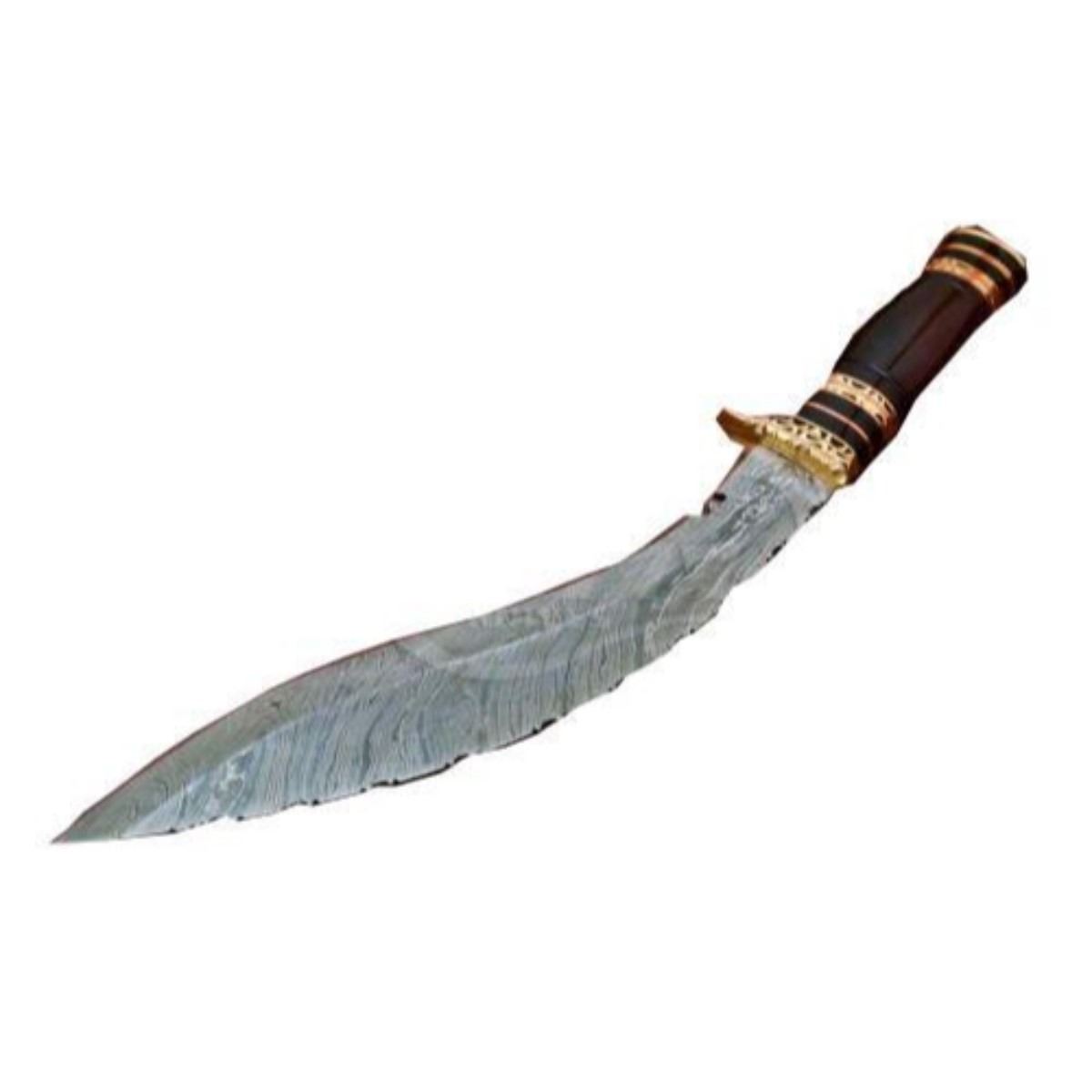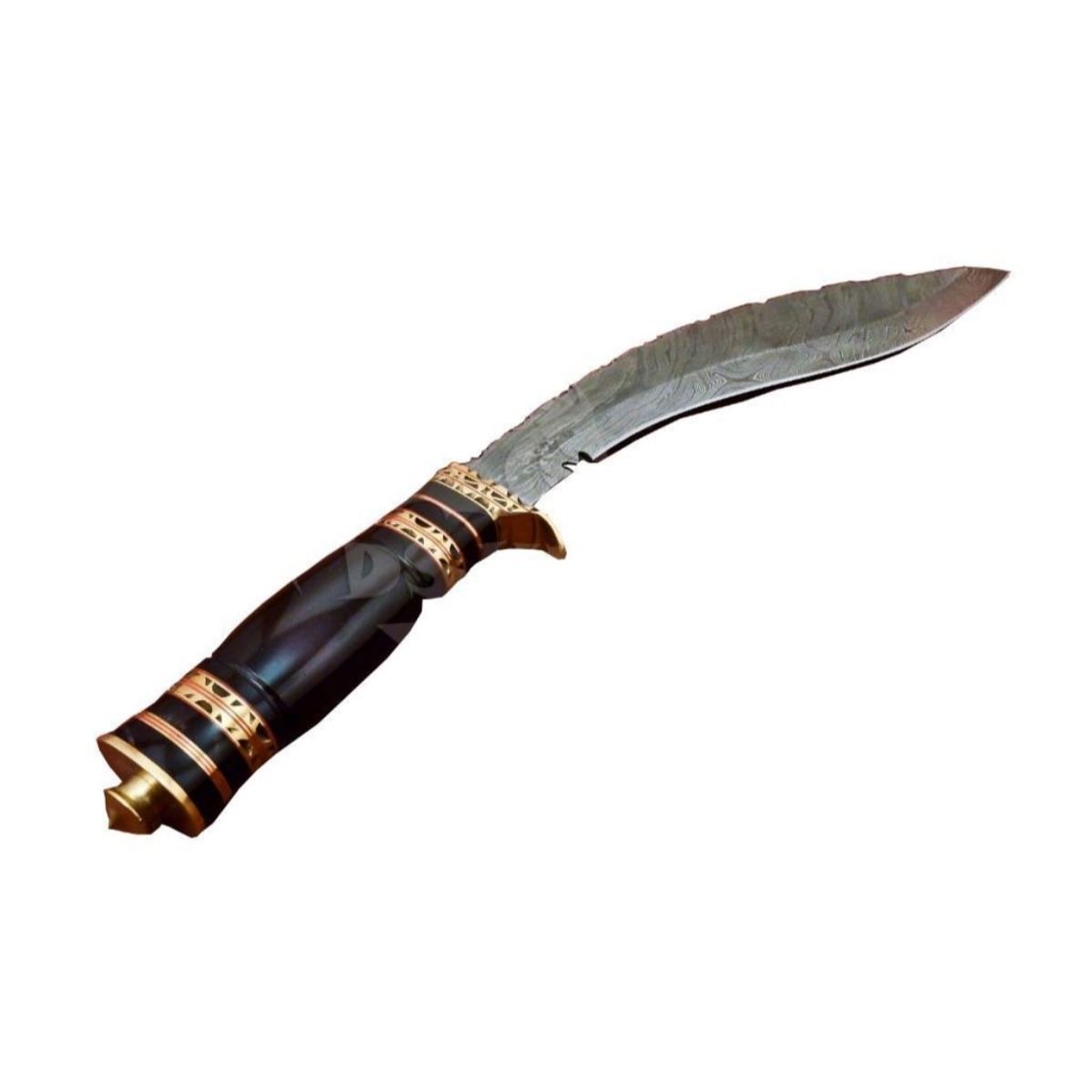 Custom-made Damascus steel hunting knife, Kukari, with exotic bullhorn handle, hand-forged above 216 layers of 1095 & 15n20 high carbon tool steels, with nickle layer. Excellent heat treatment to blade 56 To 57 Hrc. Leather sheath. Overall size 14" length. 9" blade. 5" handle. 10476-051418-EB-38972