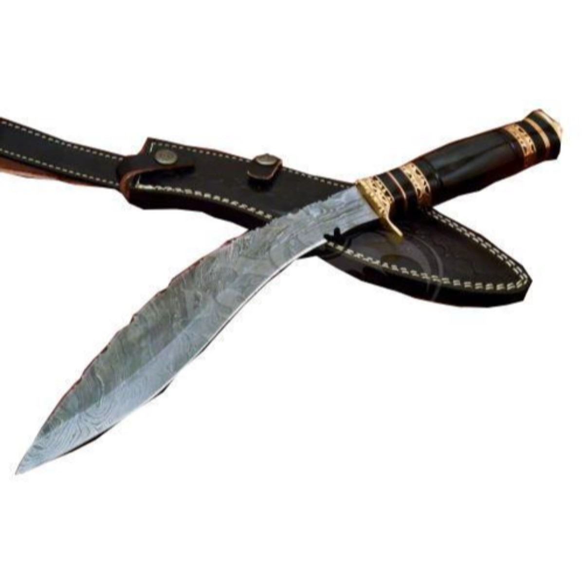 Custom-made Damascus steel hunting knife, Kukari, with exotic bullhorn handle, hand-forged above 216 layers of 1095 & 15n20 high carbon tool steels, with nickle layer. Excellent heat treatment to blade 56 To 57 Hrc. Leather sheath. Overall size 14" length. 9" blade. 5" handle. 10476-051418-EB-38972