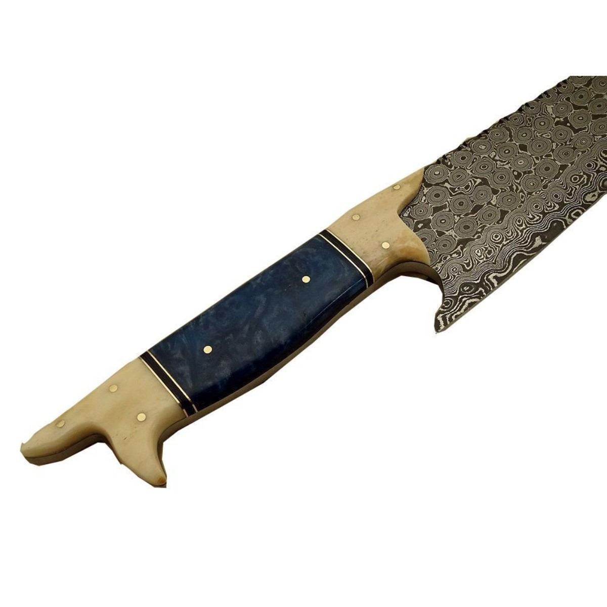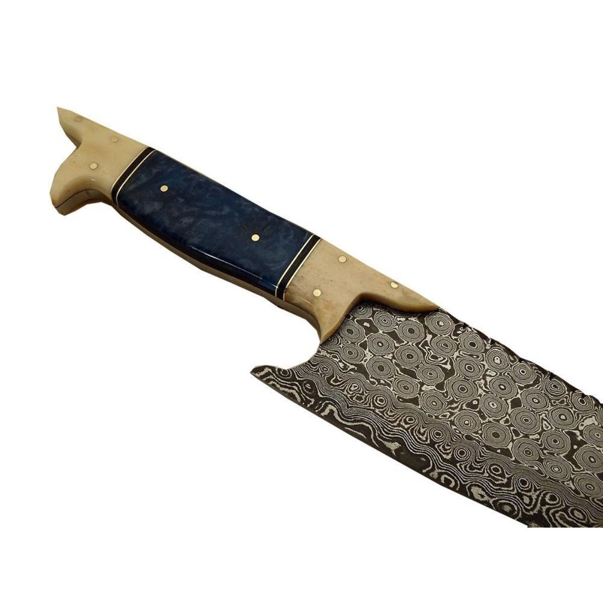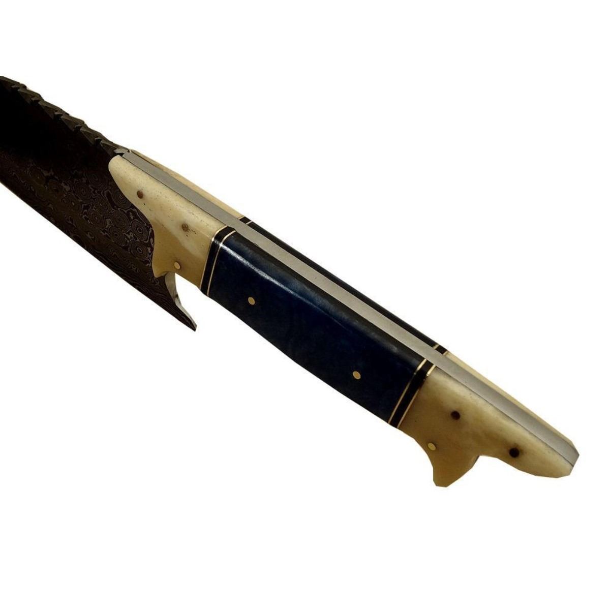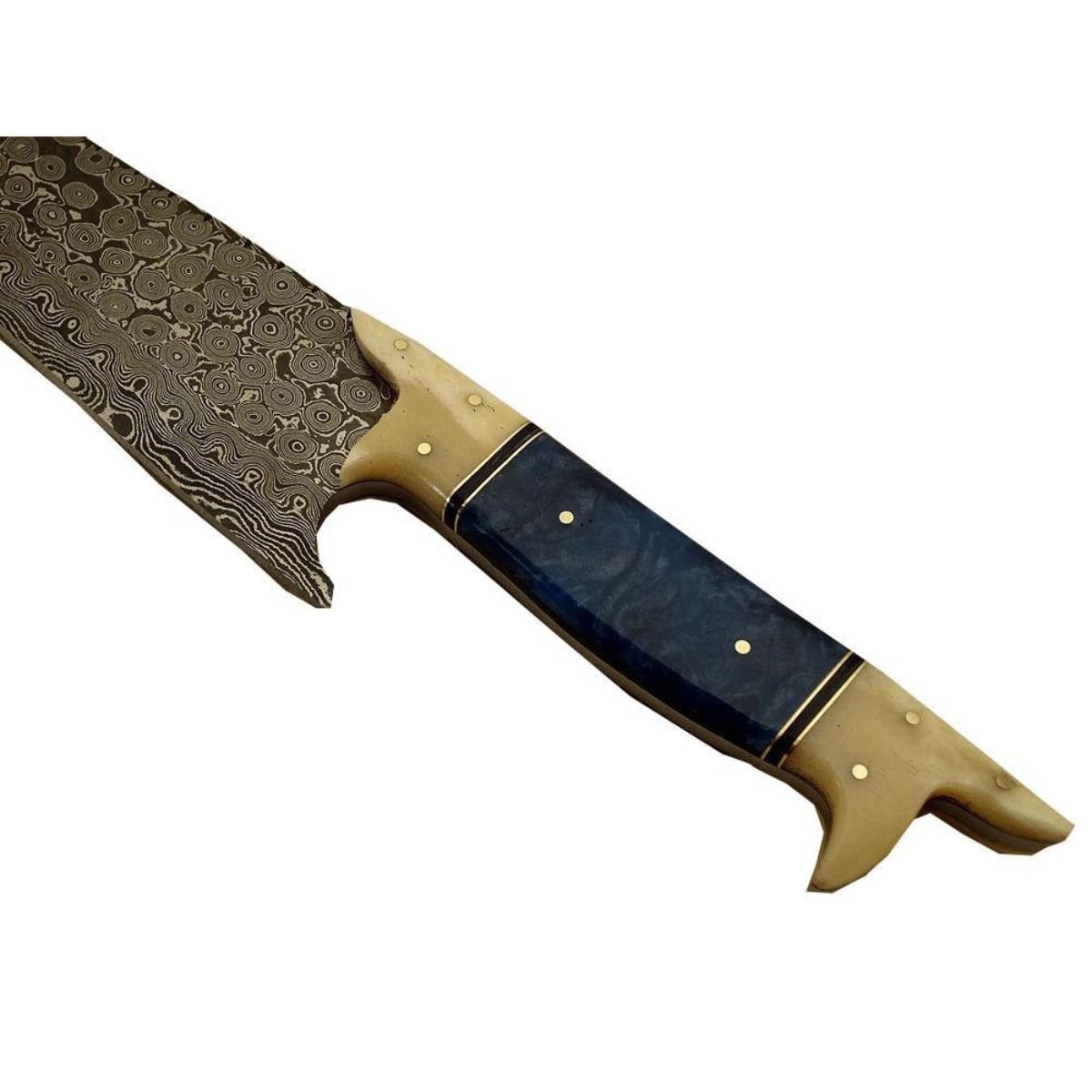 Hand-made Damascus steel modern knife made using ancient forging technique from the region around Damascus. The blade with 1095 & 15n20 high steel & hardness of Hrc 58-60. Knife weight: “400 to 450 grams”. Camel bone & brass handle. 13" length 8.15" length. 10478-051418-EB-30923
