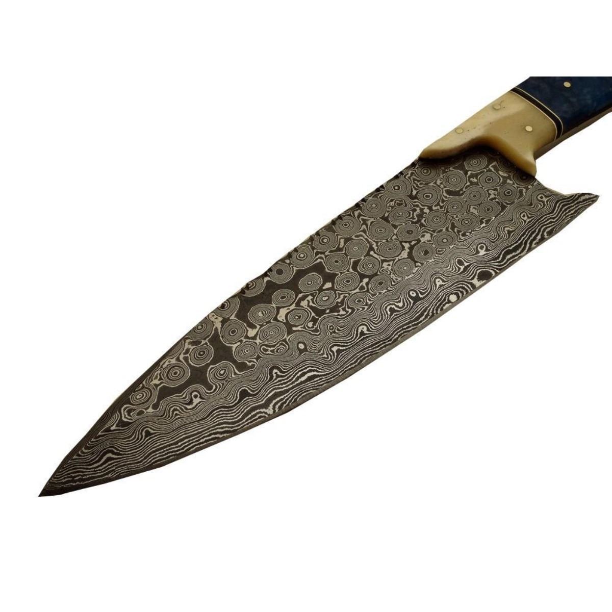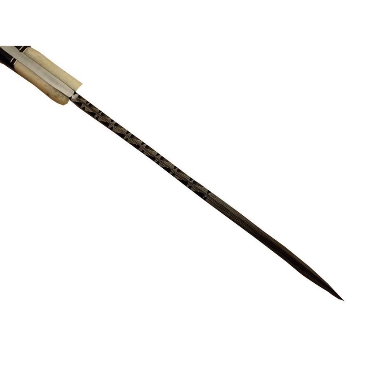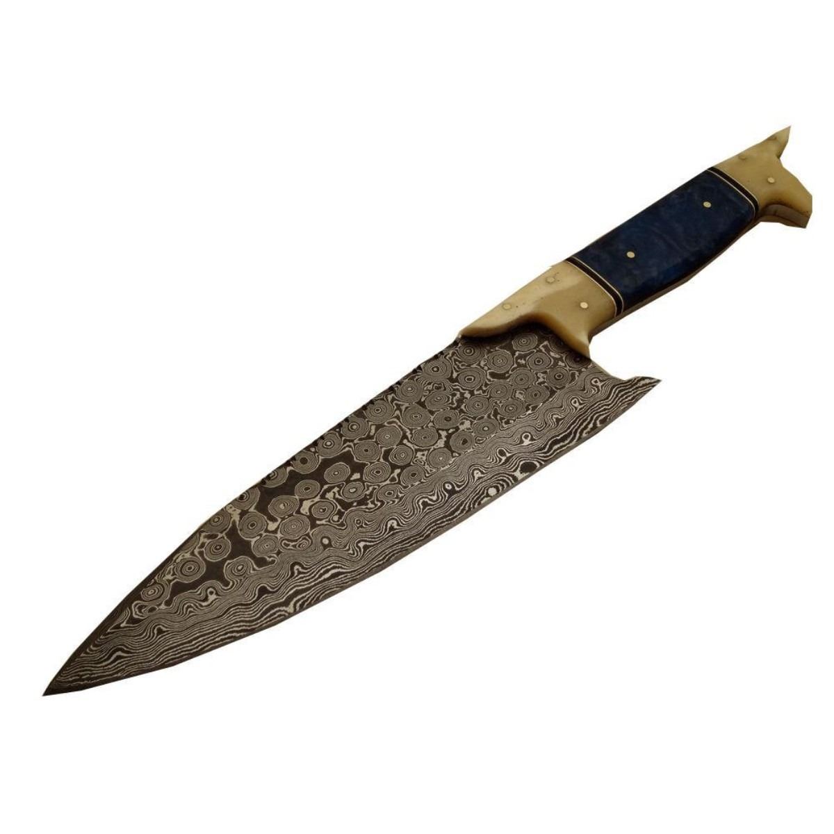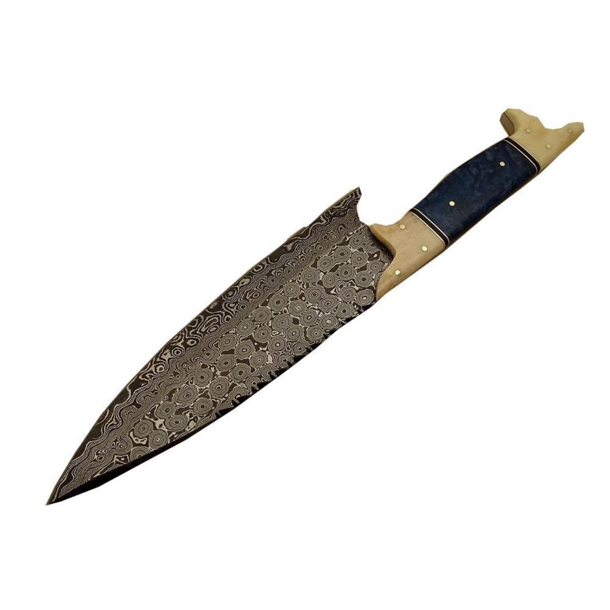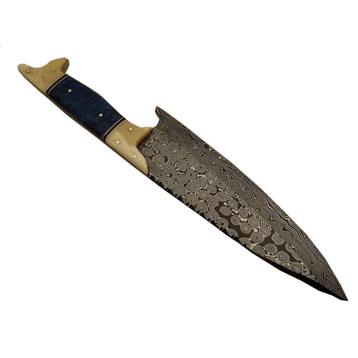 Hand-made Damascus steel modern knife made using ancient forging technique from the region around Damascus. The blade with 1095 & 15n20 high steel & hardness of Hrc 58-60. Knife weight: “400 to 450 grams”. Camel bone & brass handle. 13" length 8.15" length. 10478-051418-EB-30923