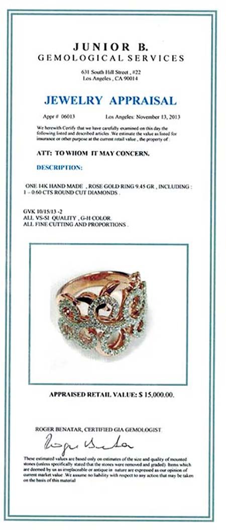 14kt Rose Gold 9.45 Approx grams including, .60ctw Round Diamond G-H color VS-SI clarity, size 7, Appraised Retail Value$15,000.00