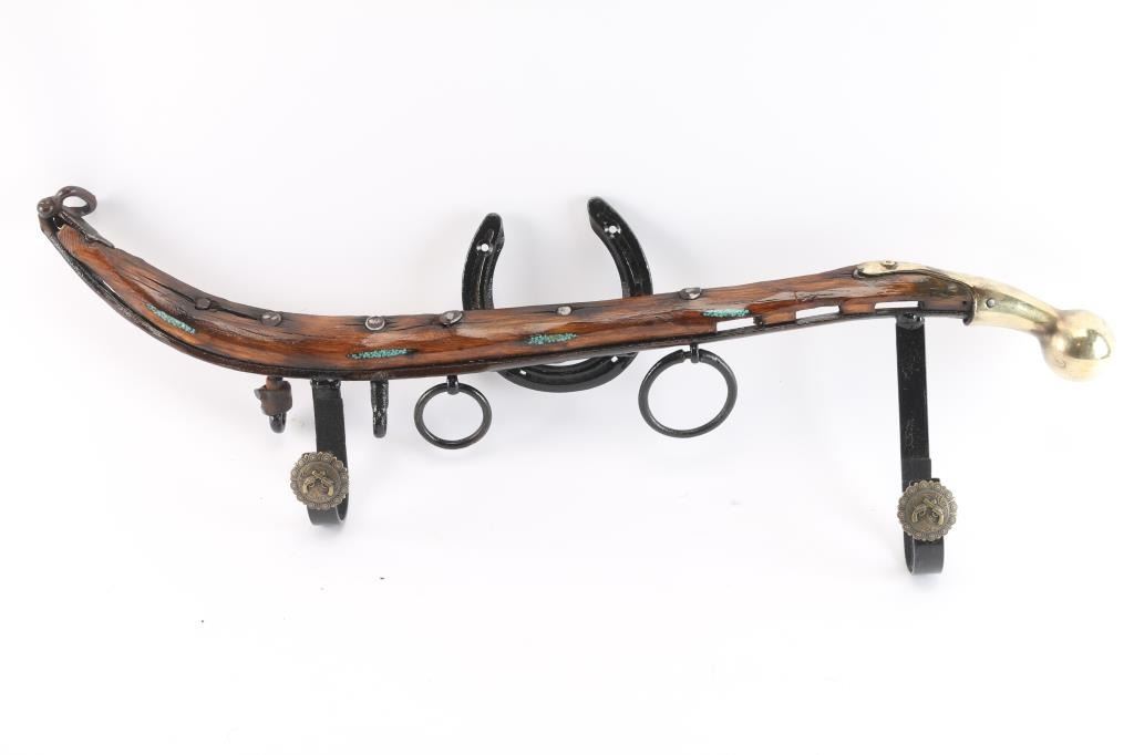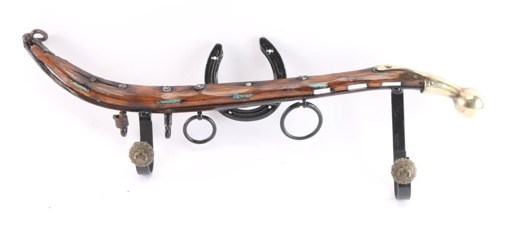 Horse hames inlaid with turquoise with hanger showing cross pistol conchos. Back hanger features a horseshoe, measures 28" x 9"